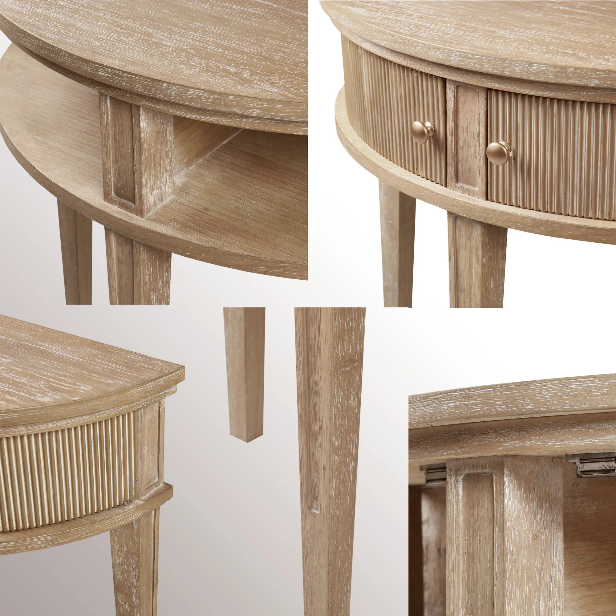 You will love the sleek style of the Sullivan Console Table. This wooden demilune-shaped console table has an antiqued reclaimed wheat finish, a fluted texture, gold metal knobs on the door fronts, and solid wood legs with cutout details. Interior storage space is 14"Wx12"Dx5"H. Overall, the console table measures 31"Wx14"Dx30"H; weighs 29 lbs.