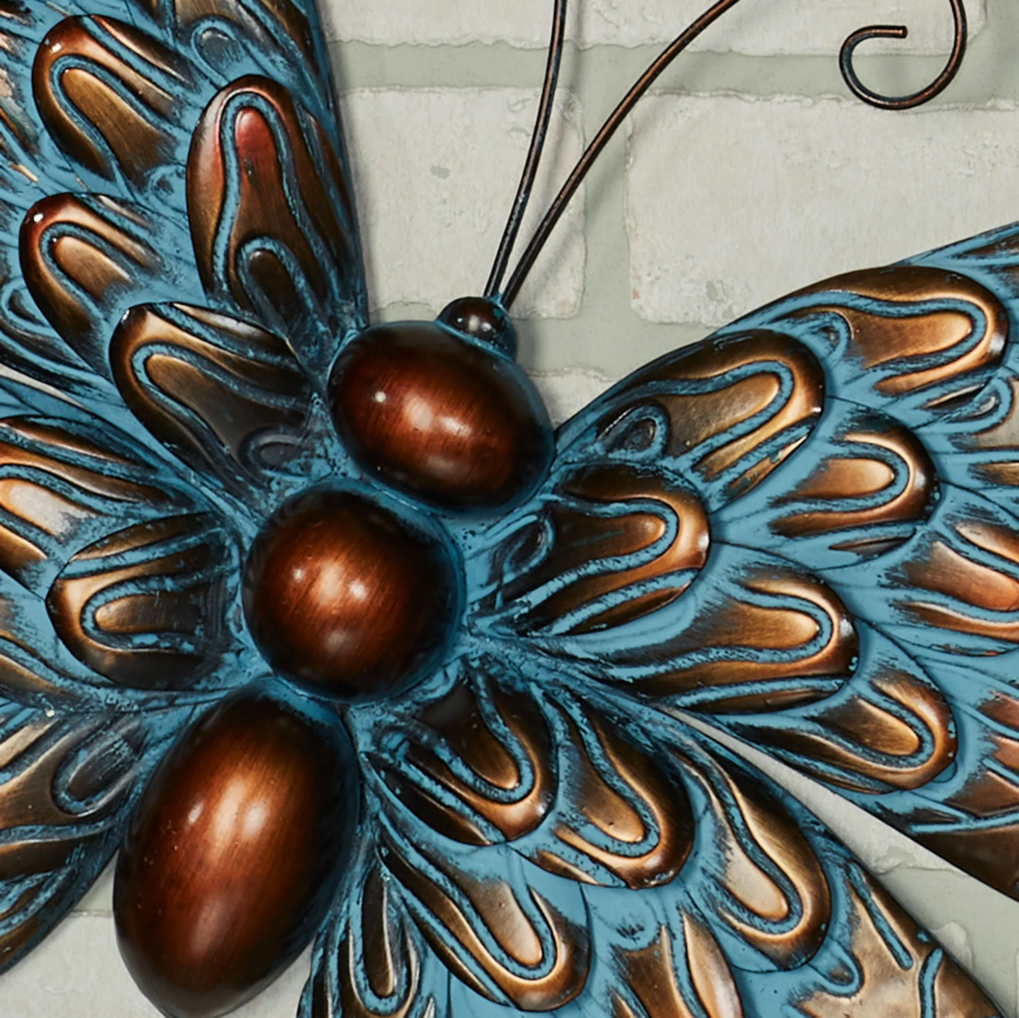 • Wall art has a copper finish with a blue wash