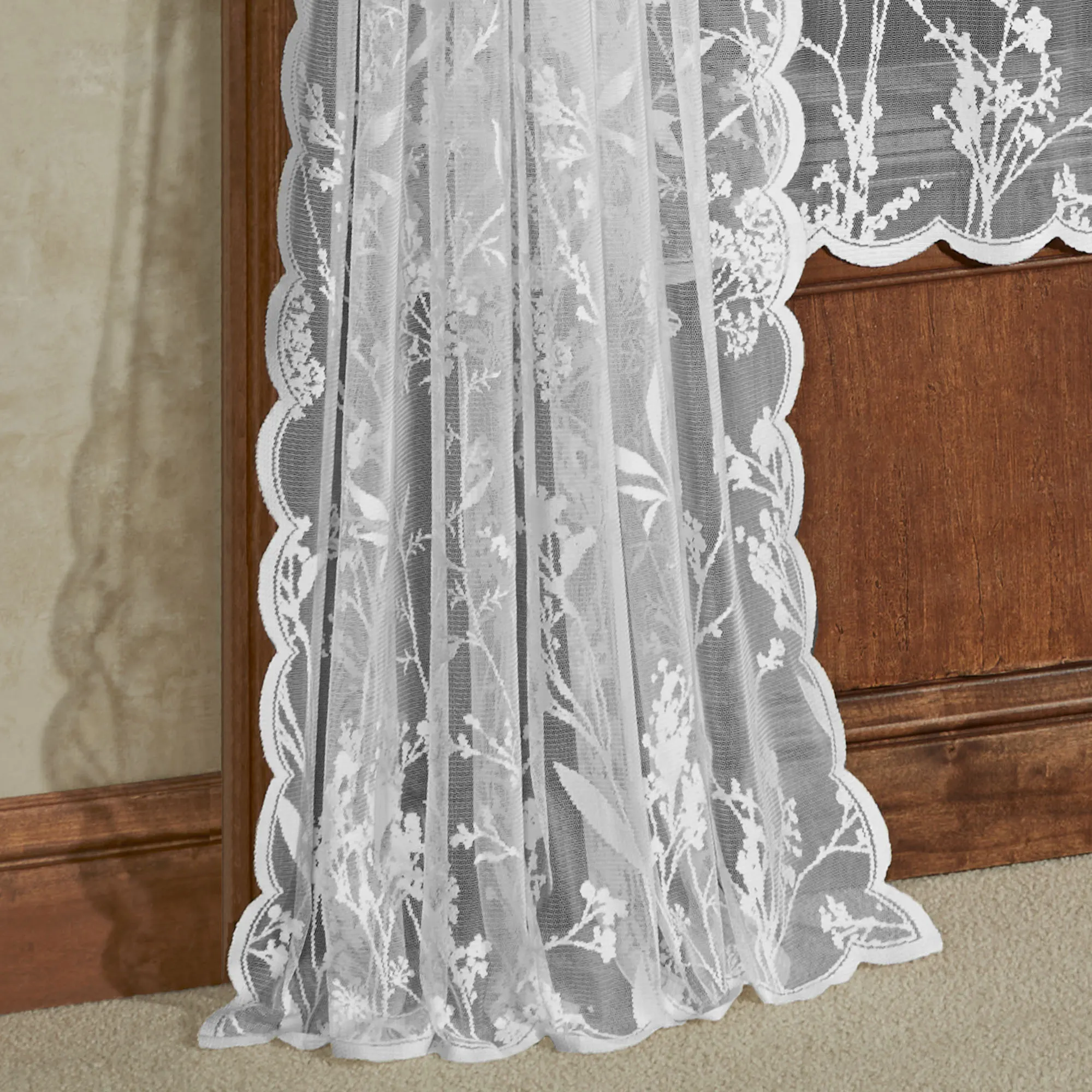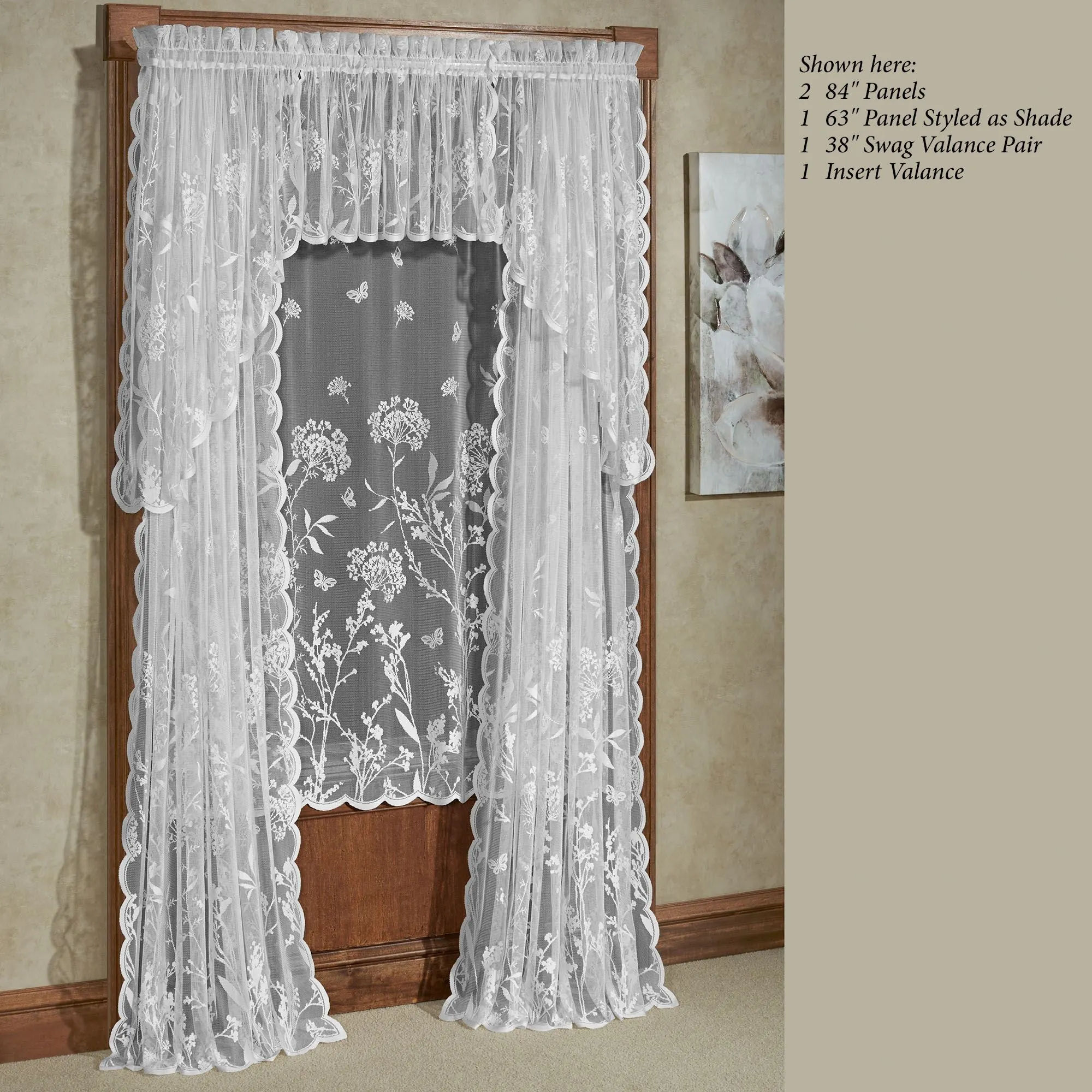The Summerfield Lace Window Treatment blossoms with natural beauty. This white, sheer polyester lace window treatment features wildflowers and butterflies and decorative scalloped edging. Rod pocket is 1.5". Specify Curtain Panel, 56"W; Swag Valance Pair, 72"W; or Insert Valance, 56"Wx16"L. Machine washable. Imported.