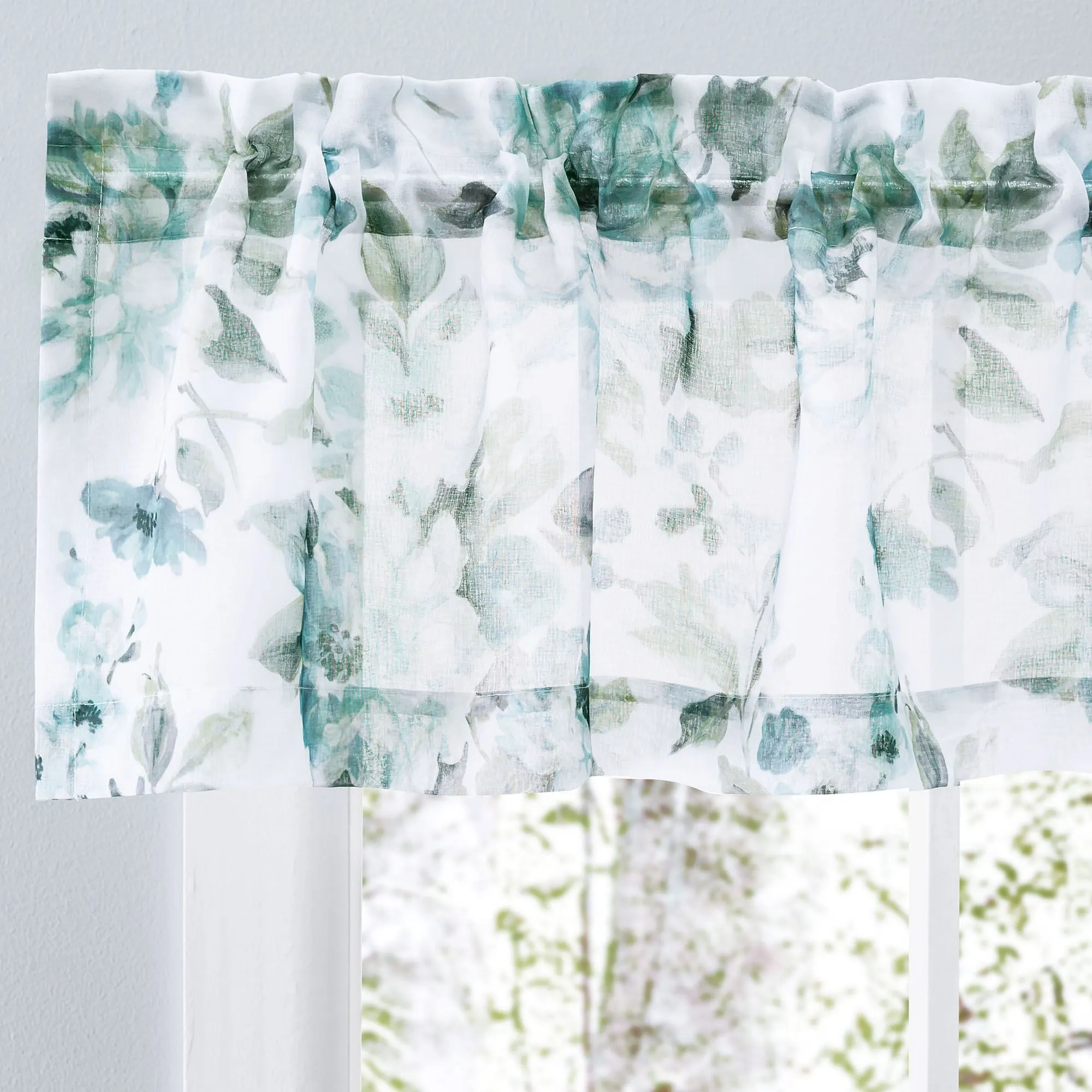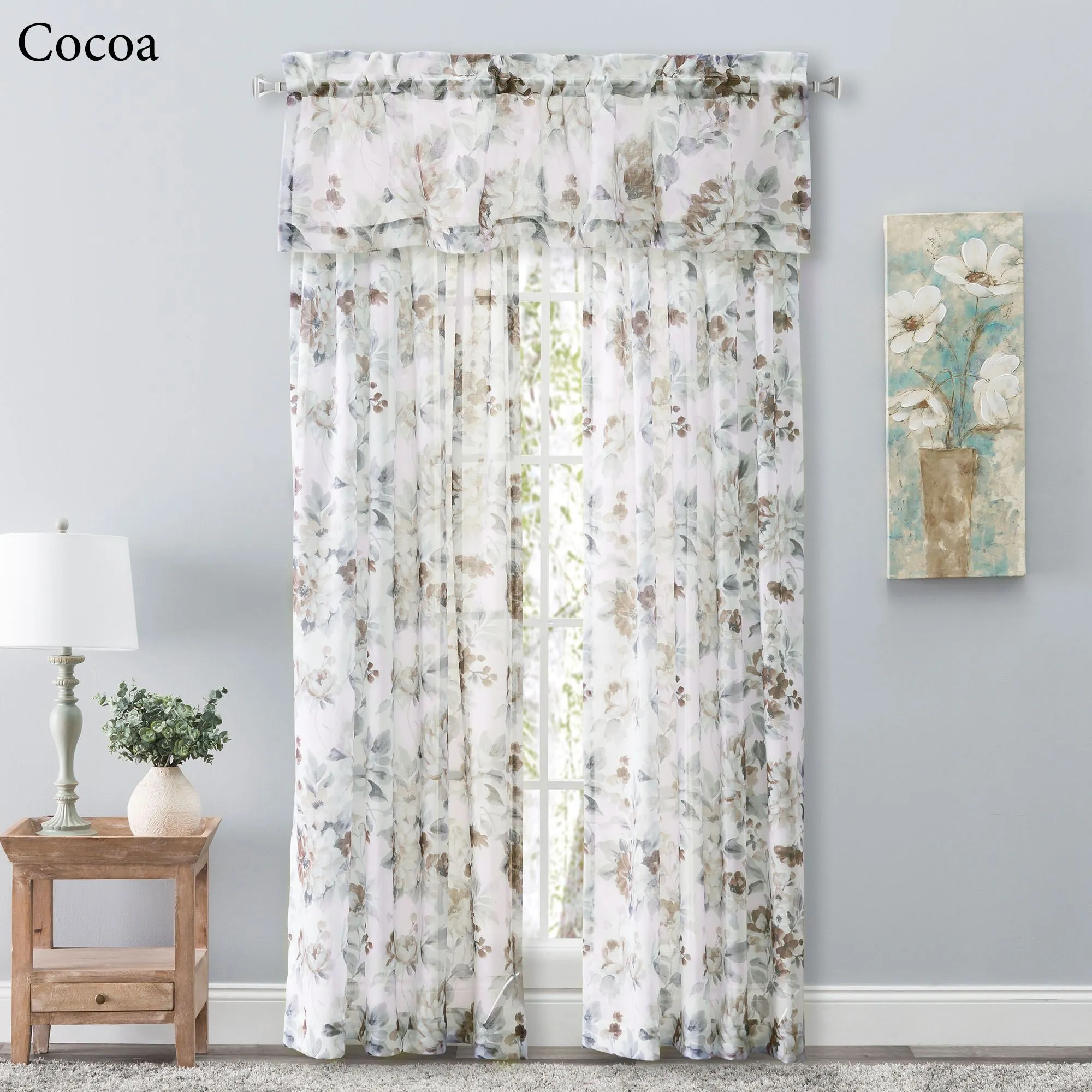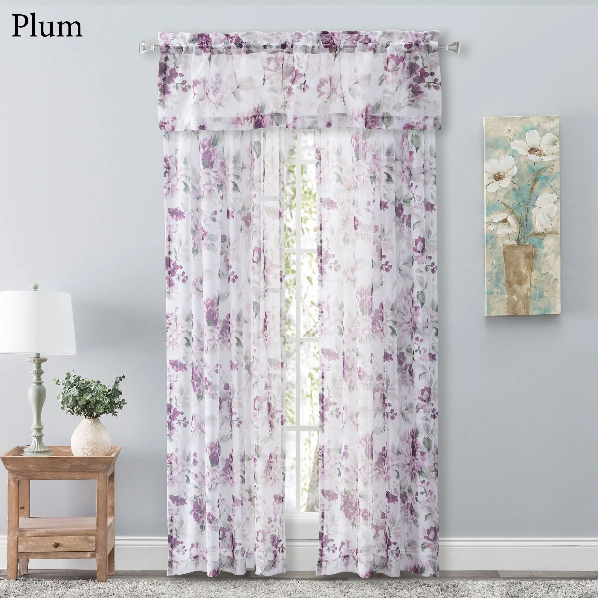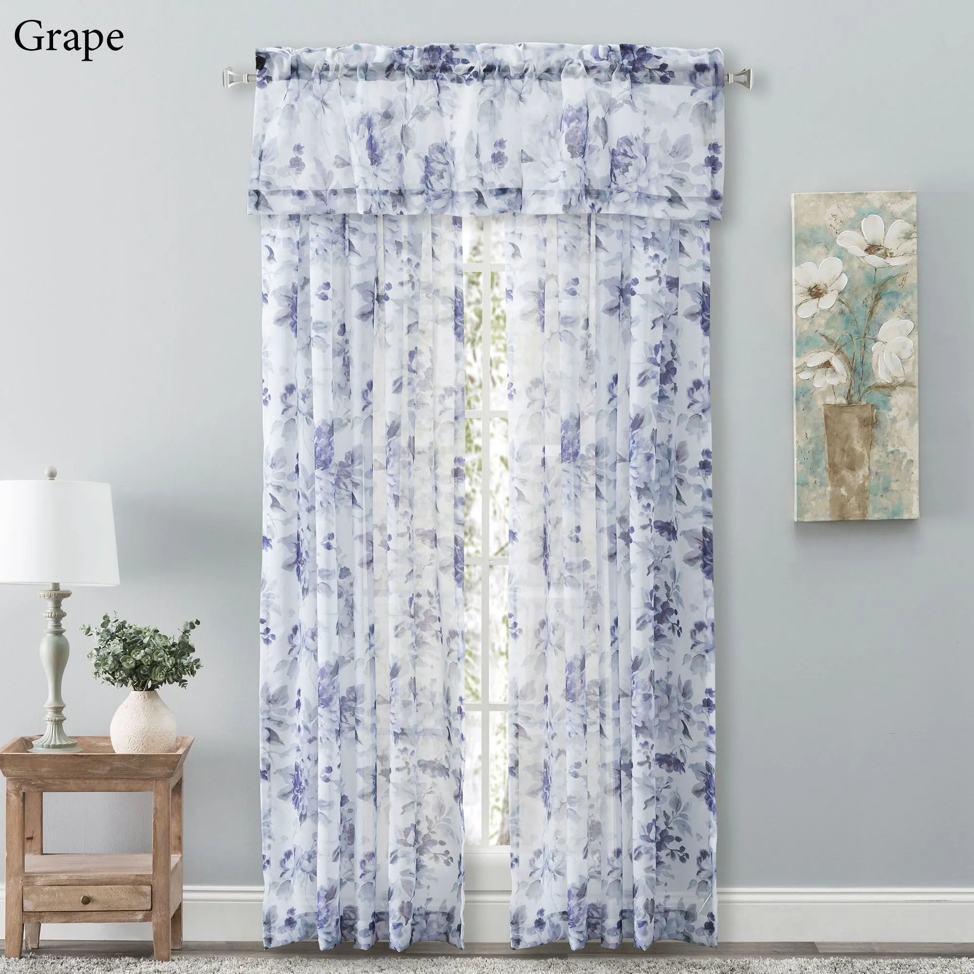 The Summerhill Sheer Floral Window Treatment blossoms with warm weather's delight. Each white polyester window accent features lovely watercolor blossoming flowers, adding sweetness to the design's lightweight and airy texture. Aqua has hues of aqua, slate blue, fern, gray, and dark gray. Cocoa contains cocoa, dark beige, ecru, gray, and dark gray shades. Grape features grape, light blue, gray, and dark gray. Plum has plum, orchid, natural, cypress, dark beige, and gray hues. Rod pocket measures 2". Sold individually, each Curtain Panel is 54"W. Valance is 54"Wx13"L. Machine washable. Imported.