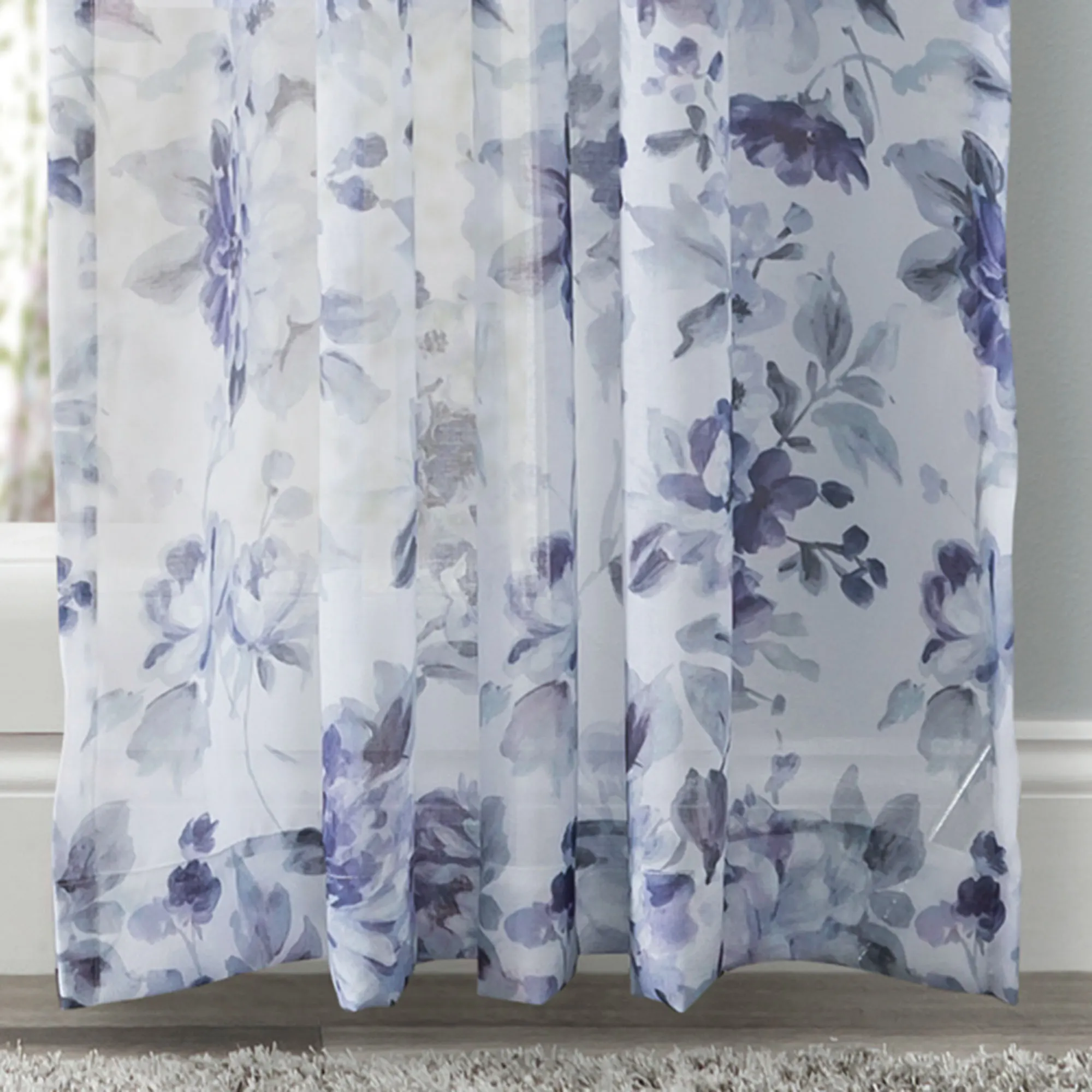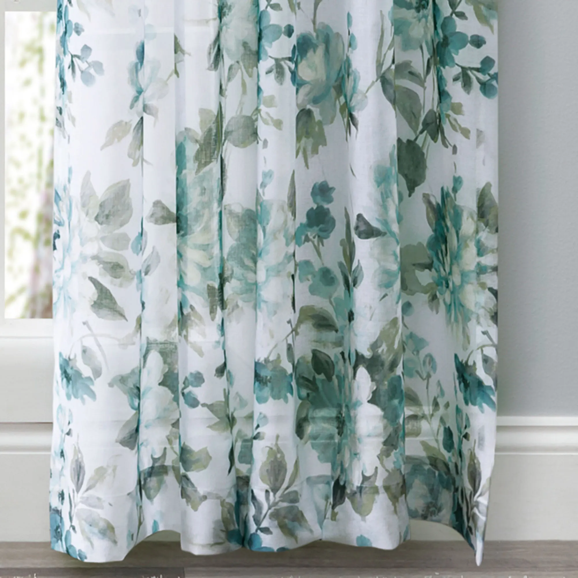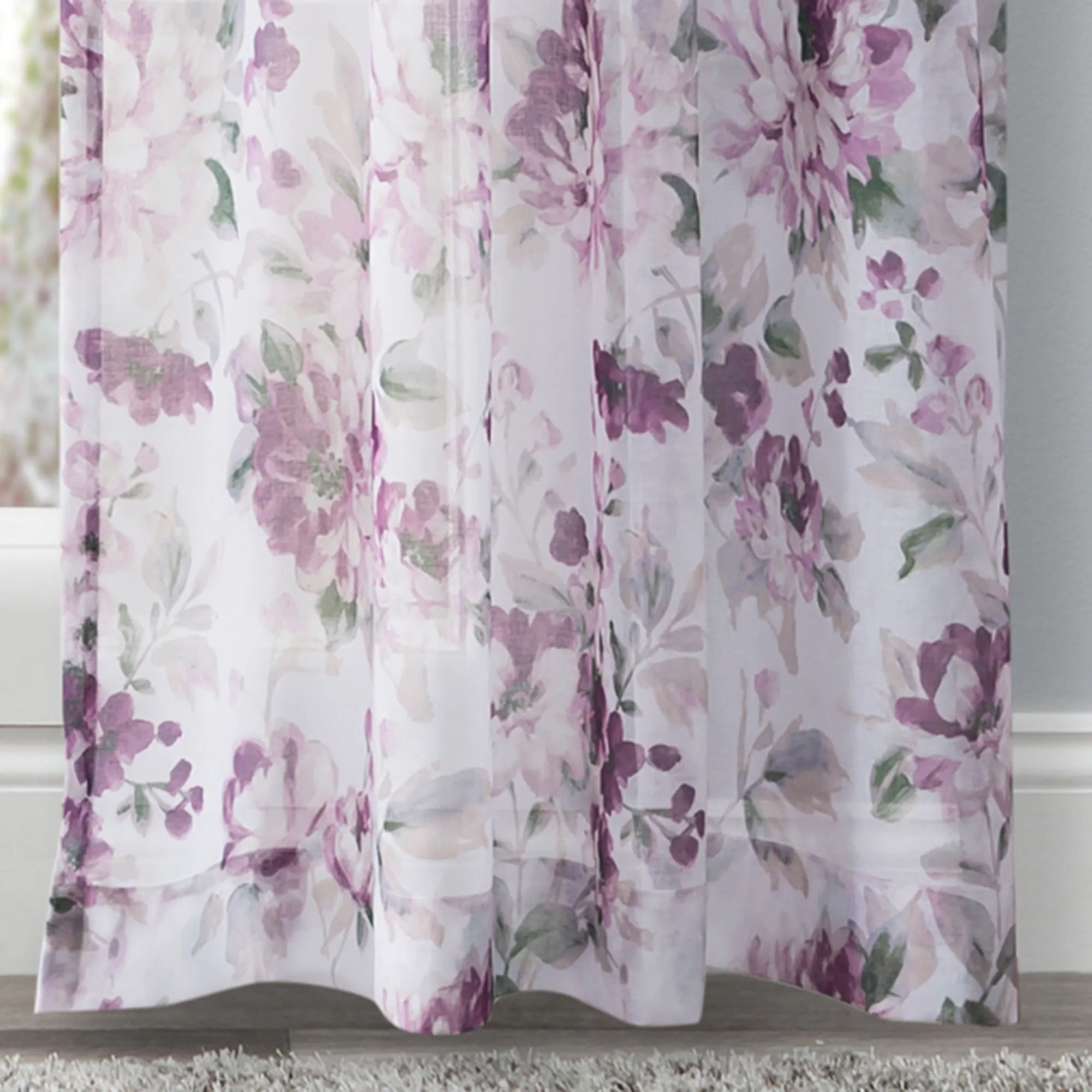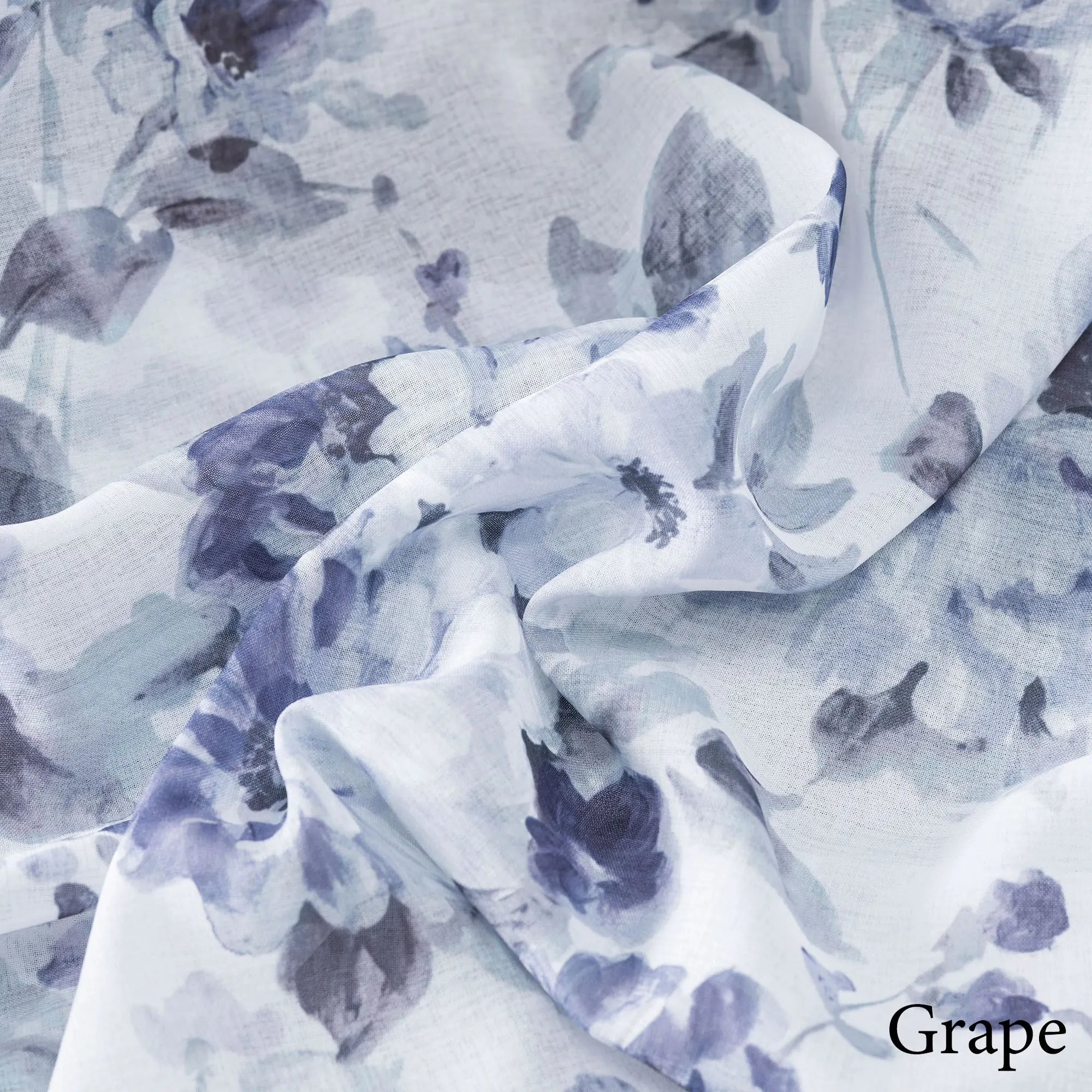 The Summerhill Sheer Floral Window Treatment blossoms with warm weather's delight. Each white polyester window accent features lovely watercolor blossoming flowers, adding sweetness to the design's lightweight and airy texture. Aqua has hues of aqua, slate blue, fern, gray, and dark gray. Cocoa contains cocoa, dark beige, ecru, gray, and dark gray shades. Grape features grape, light blue, gray, and dark gray. Plum has plum, orchid, natural, cypress, dark beige, and gray hues. Rod pocket measures 2". Sold individually, each Curtain Panel is 54"W. Valance is 54"Wx13"L. Machine washable. Imported.