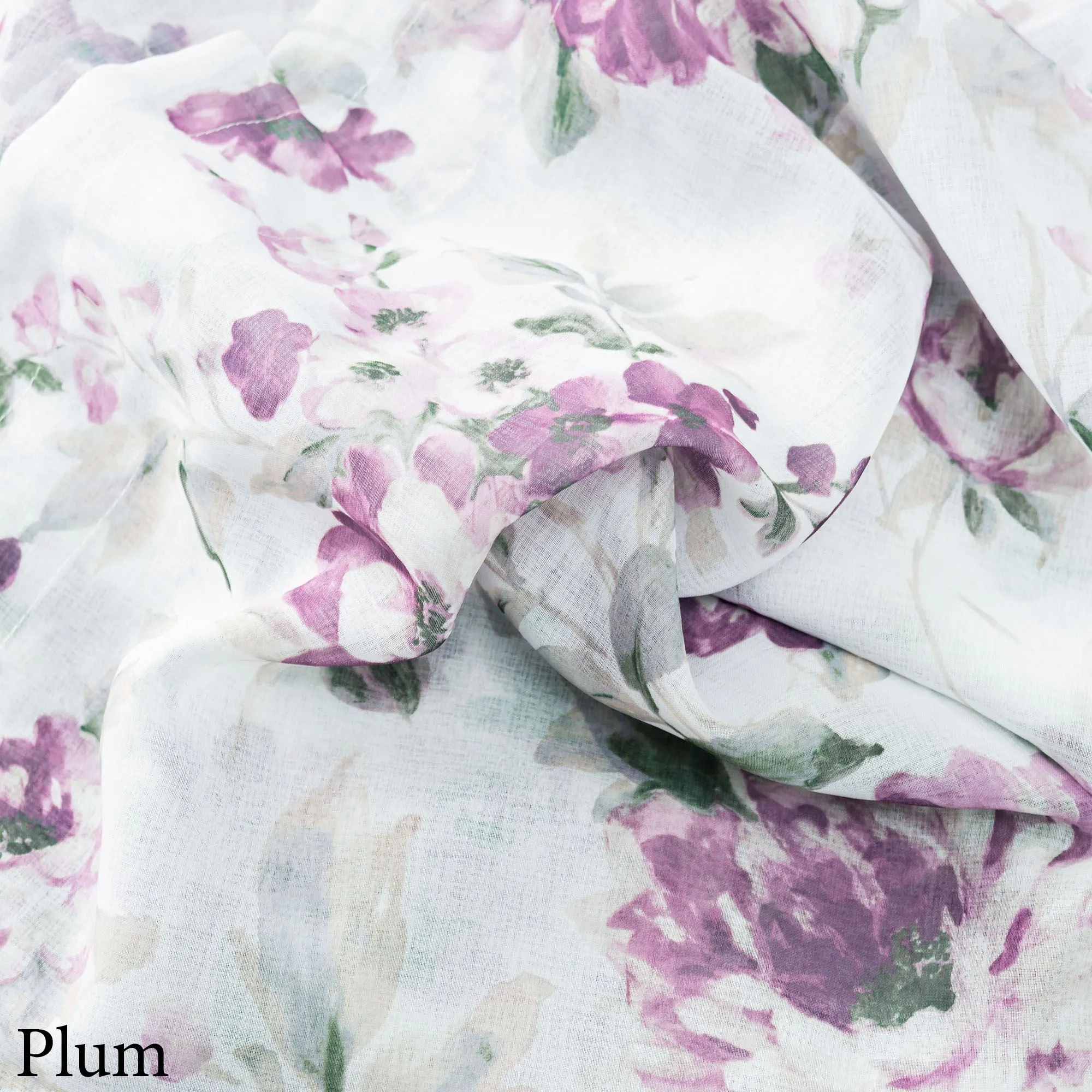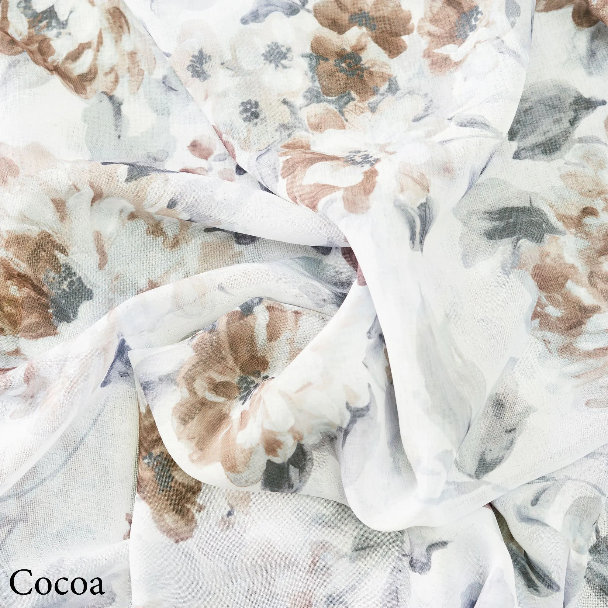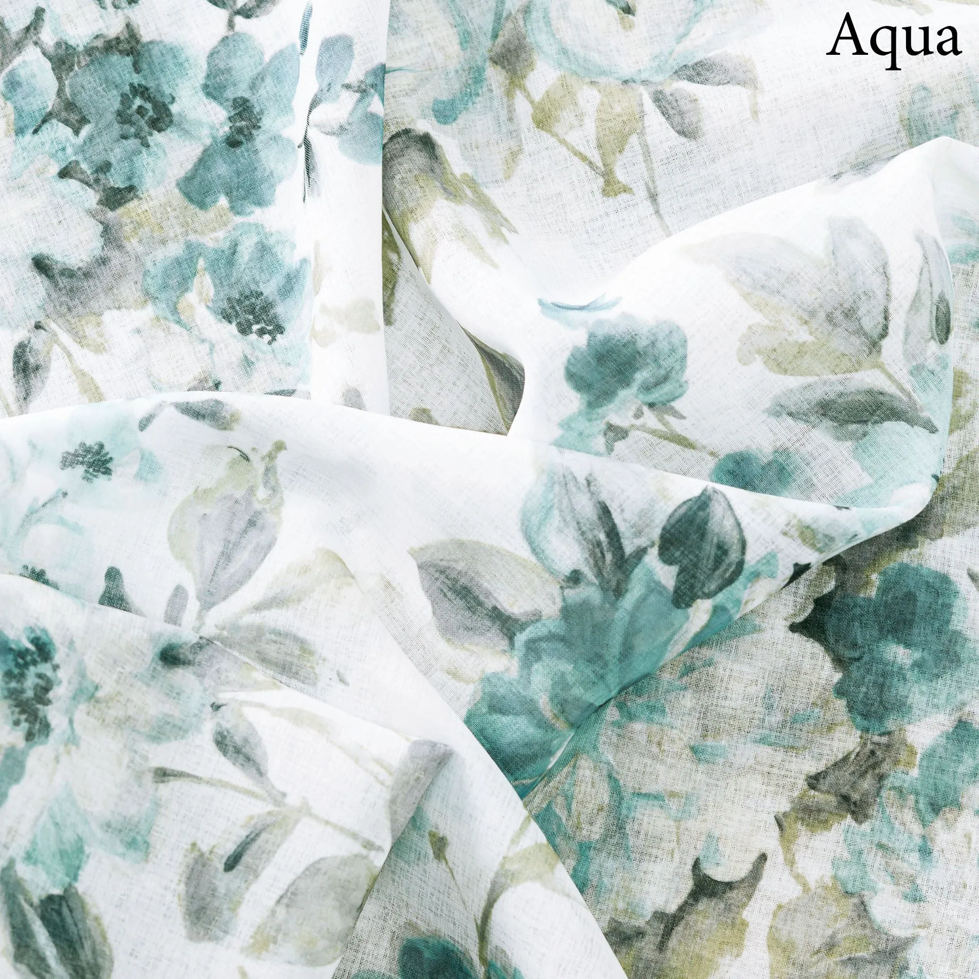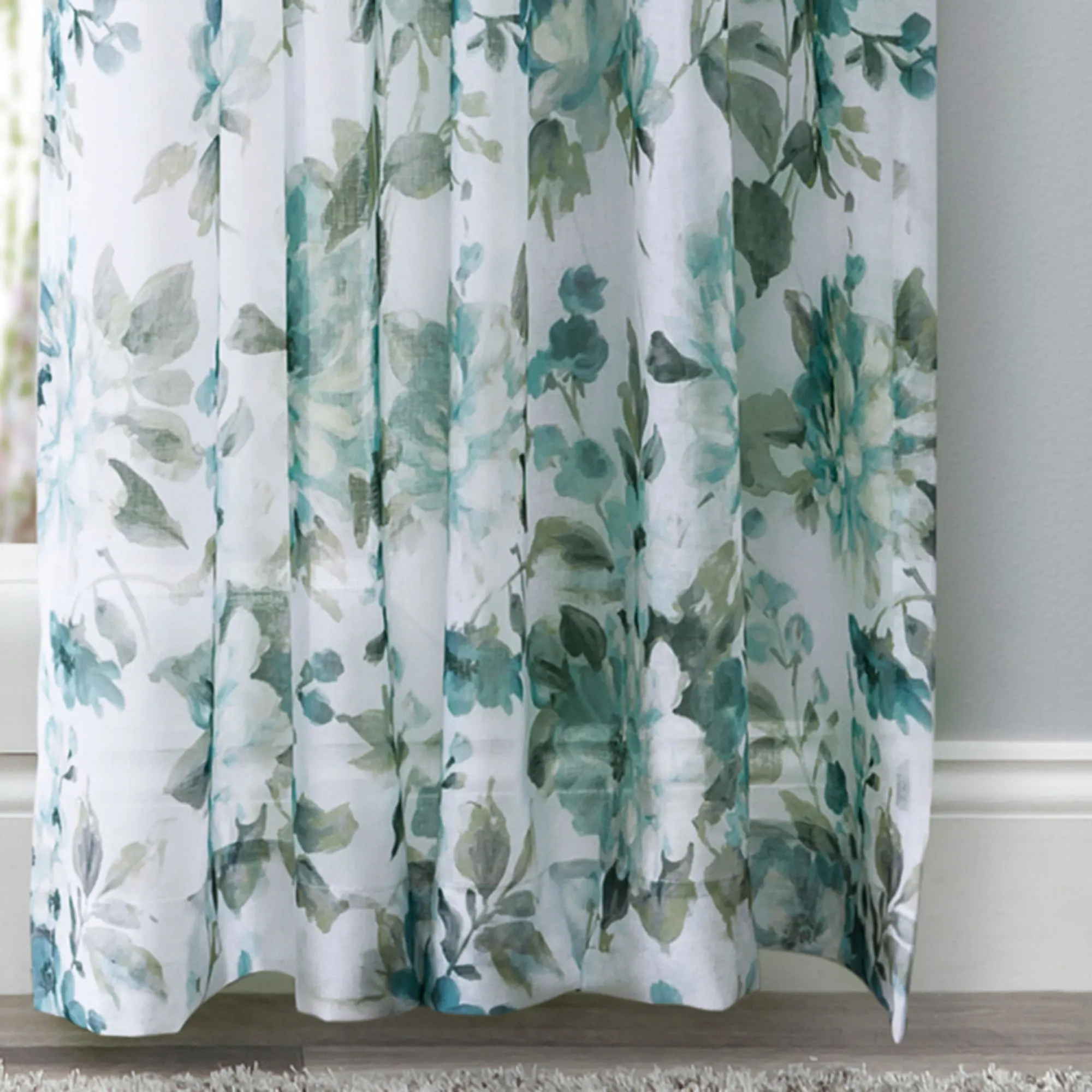 The Summerhill Sheer Floral Window Treatment blossoms with warm weather's delight. Each white polyester window accent features lovely watercolor blossoming flowers, adding sweetness to the design's lightweight and airy texture. Aqua has hues of aqua, slate blue, fern, gray, and dark gray. Cocoa contains cocoa, dark beige, ecru, gray, and dark gray shades. Grape features grape, light blue, gray, and dark gray. Plum has plum, orchid, natural, cypress, dark beige, and gray hues. Rod pocket measures 2". Sold individually, each Curtain Panel is 54"W. Valance is 54"Wx13"L. Machine washable. Imported.