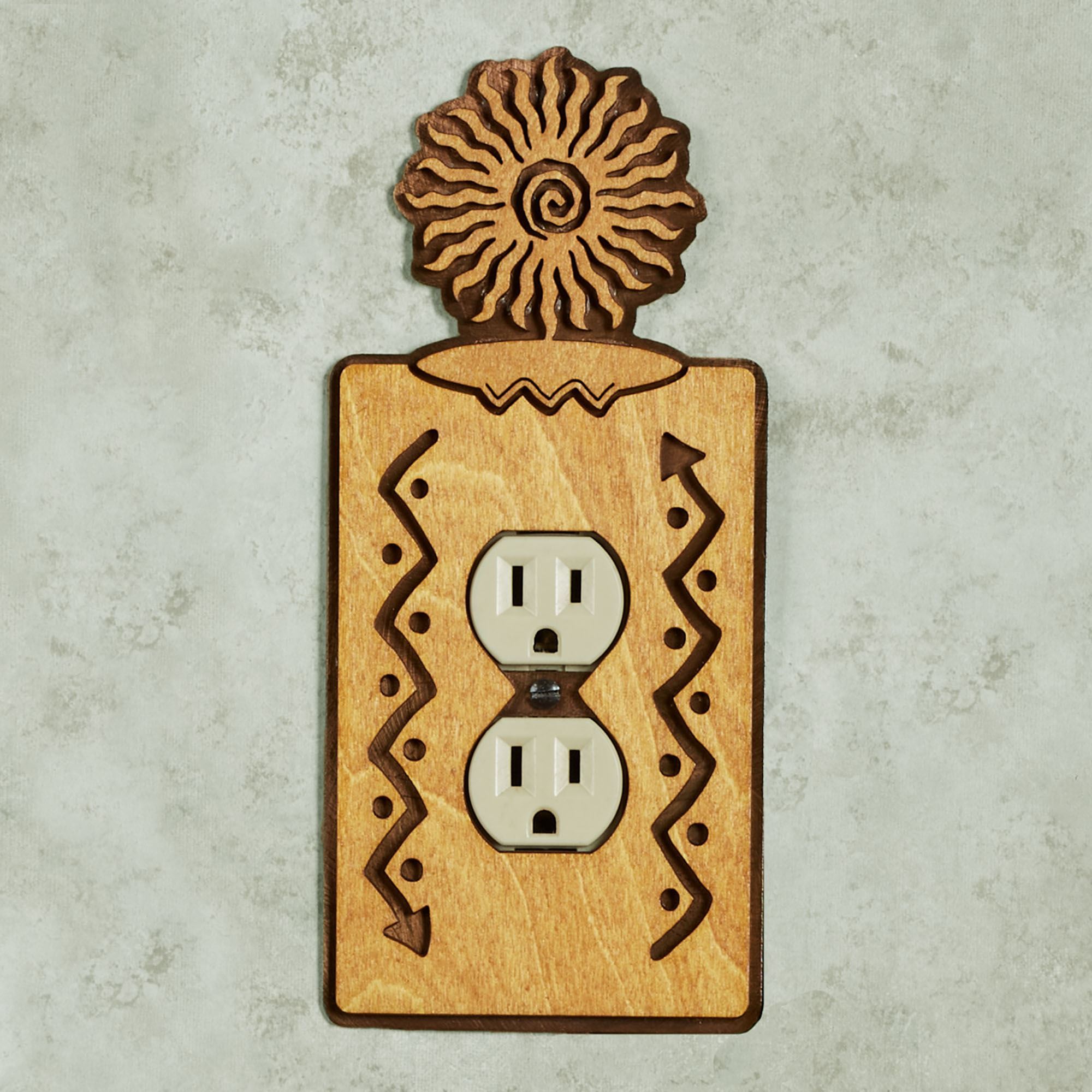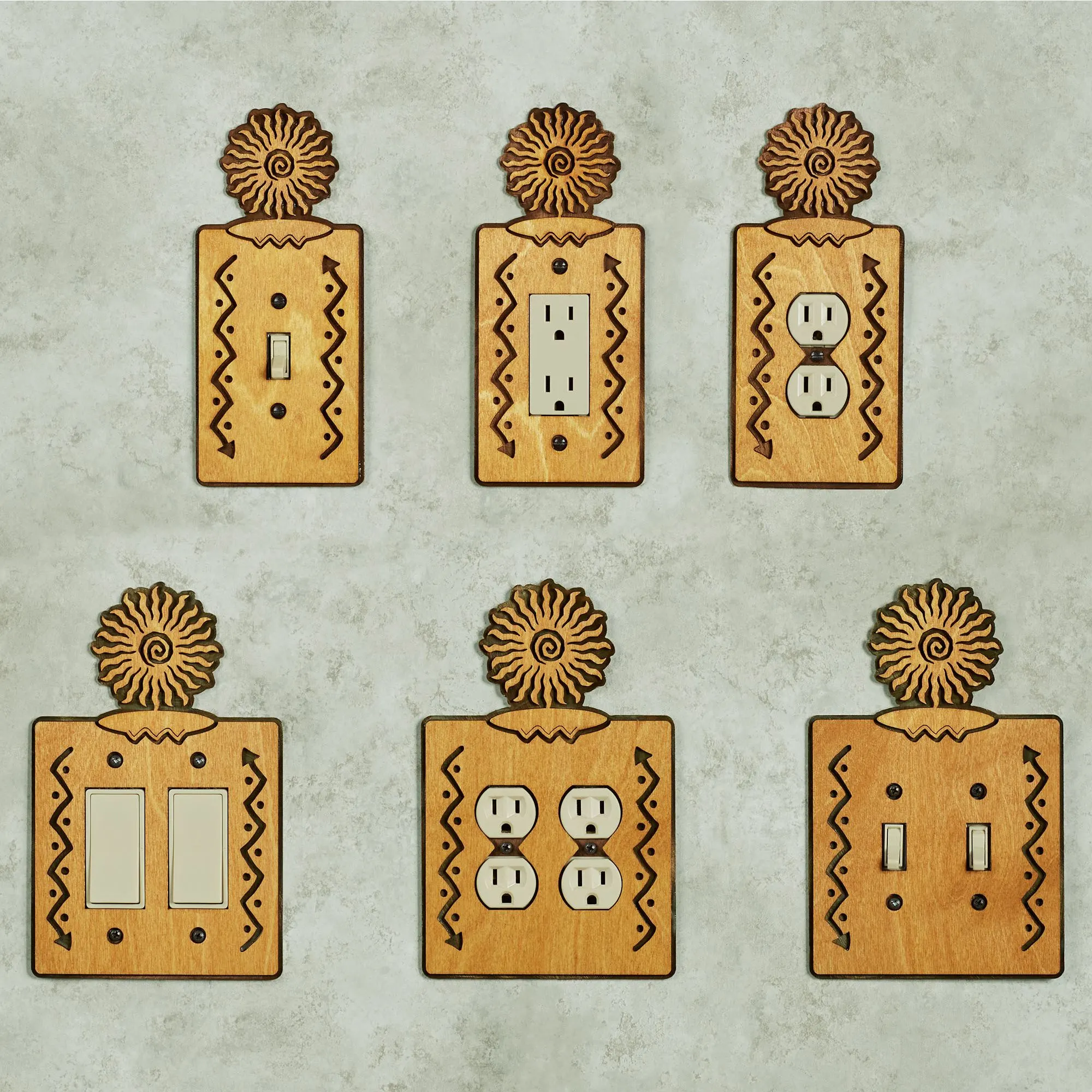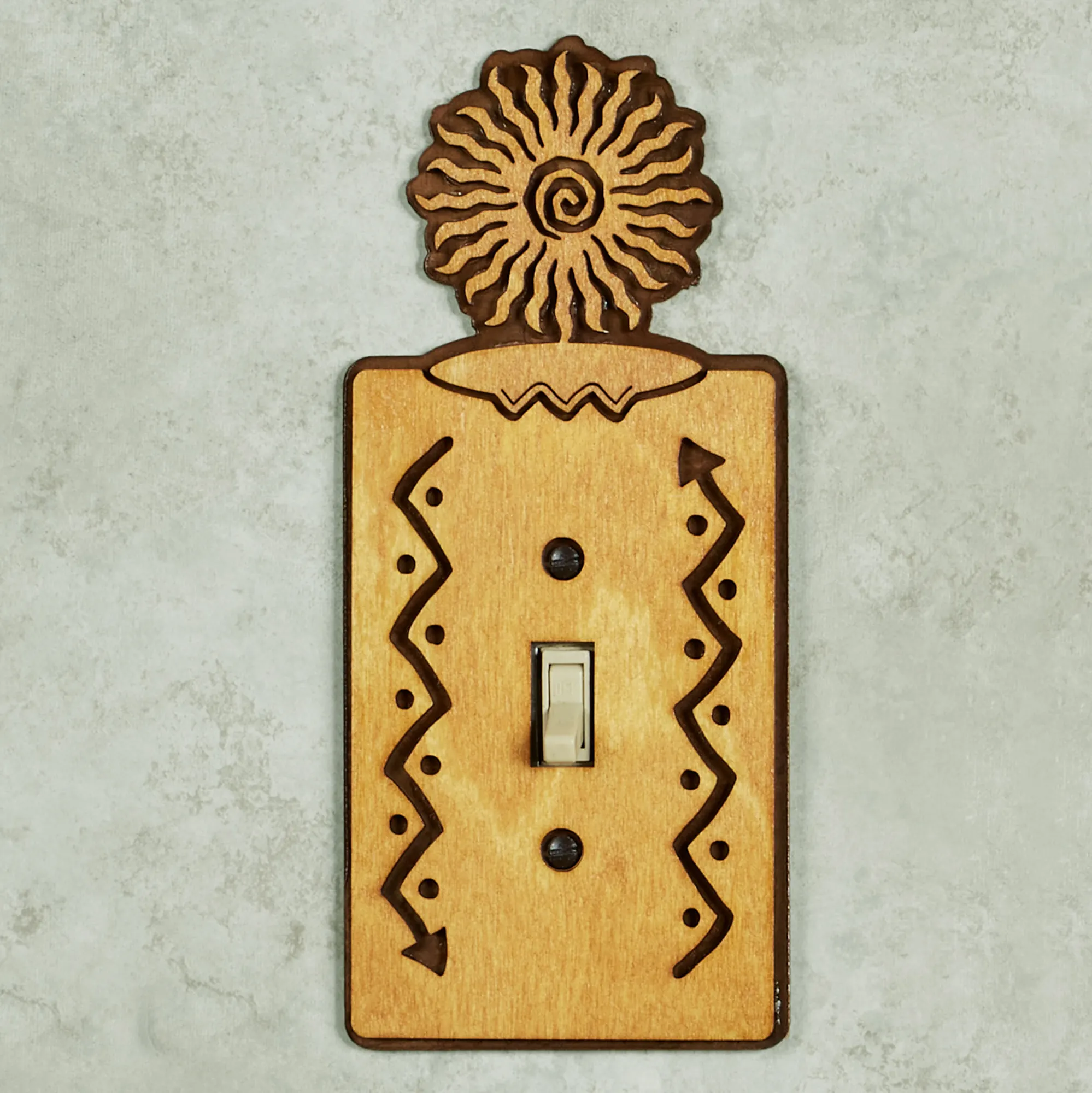 Turn on the charm with the Sun Southwest Decorative Switchplates. Proudly made in the USA, the handcrafted design features a laser-cut golden birch wood overlay atop a clear-coated rusted steel backplate. A stylized sun tops the look, while dotted arrows decorate the sides. Each is 8.5"H. Singles are 3.75"W each. Doubles are 5.5"W each. Screws are included.