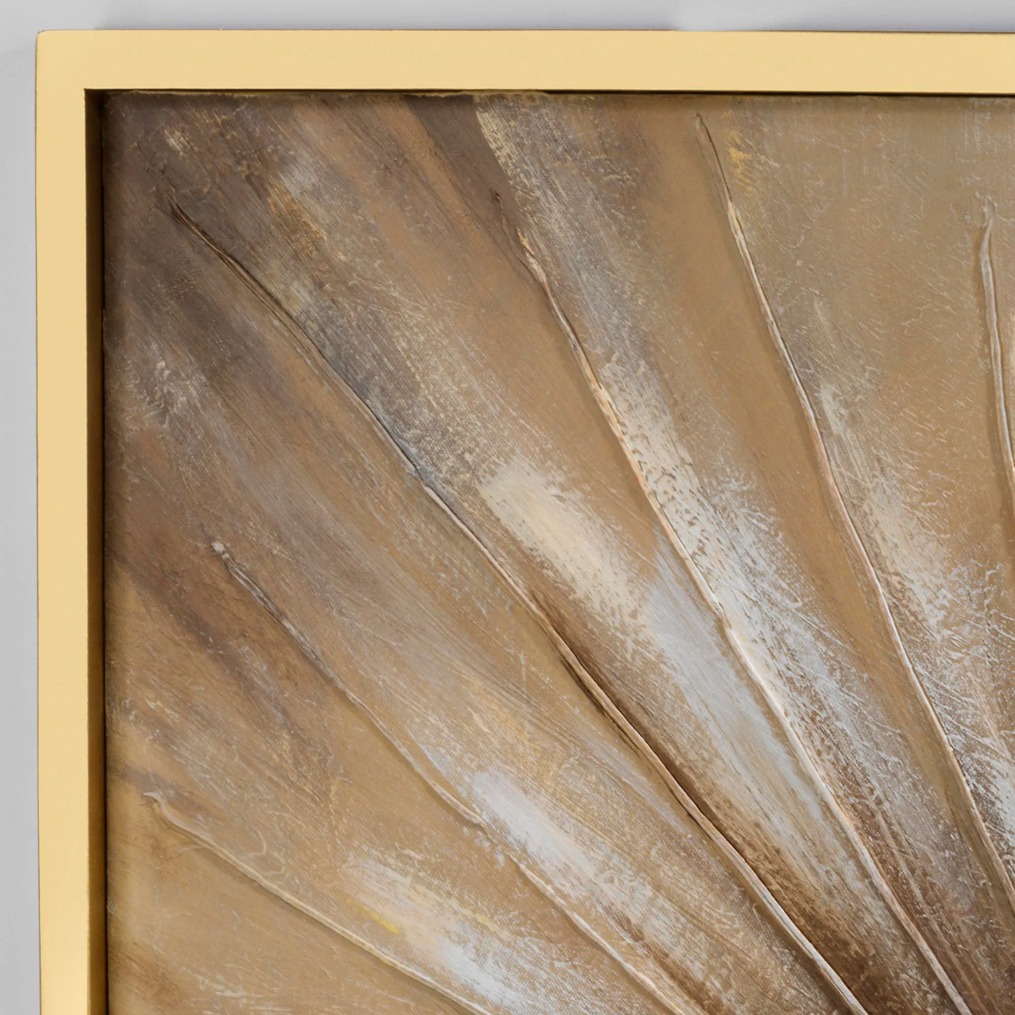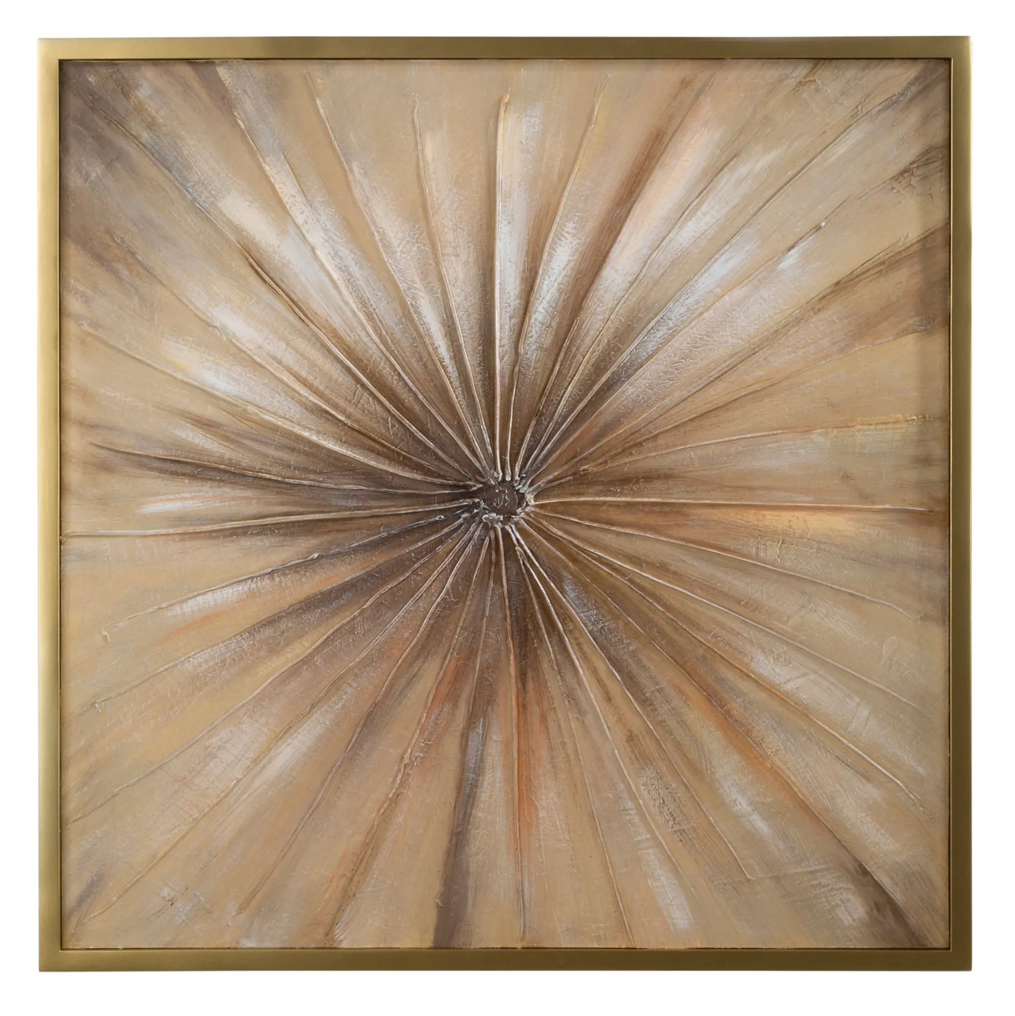 Neutral tones take an alluring turn within the Sunburst Framed Canvas Wall Art. Surrounded by a gold wood frame, the handpainted oil canvas features a bursting design in hues of brown, black, peach, tan, and white. Due to the handpainted nature of this item, minor variations may occur. Measures 32"sq.x1.5"D.