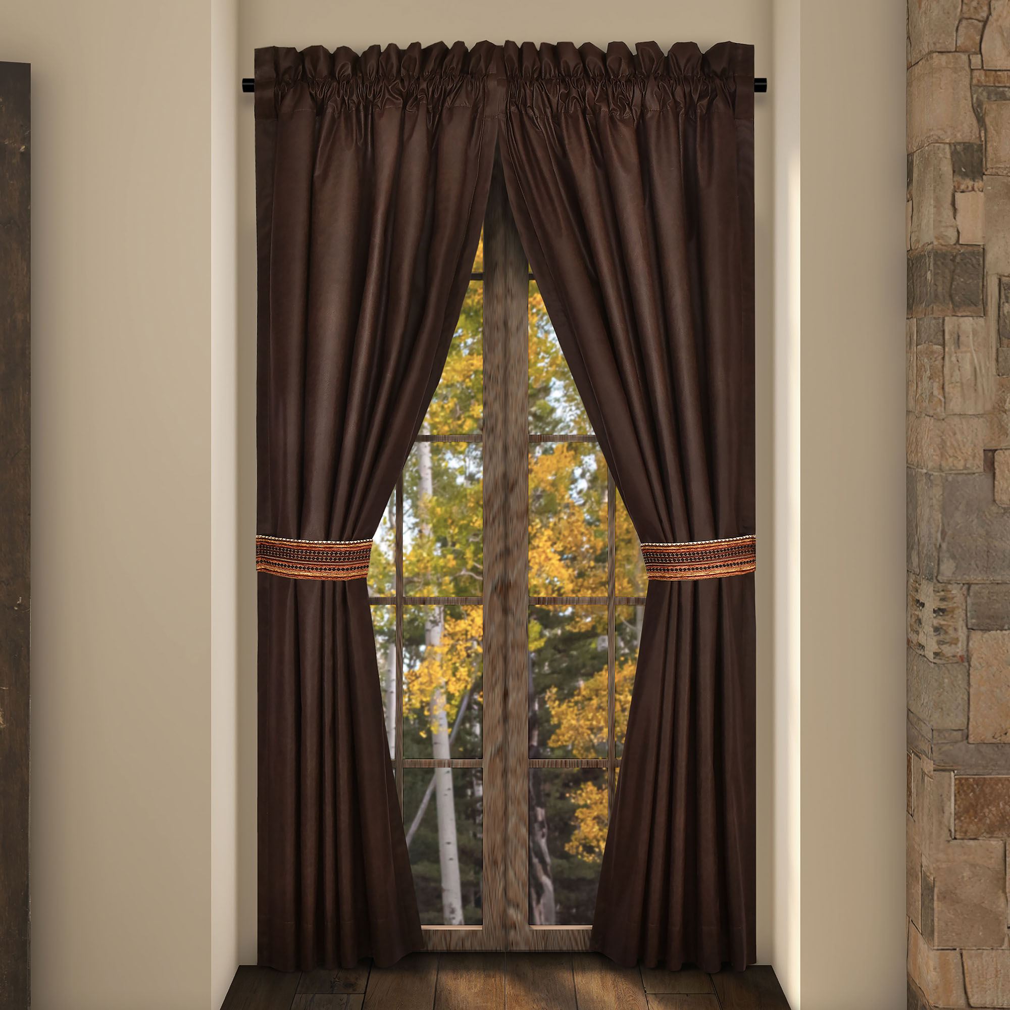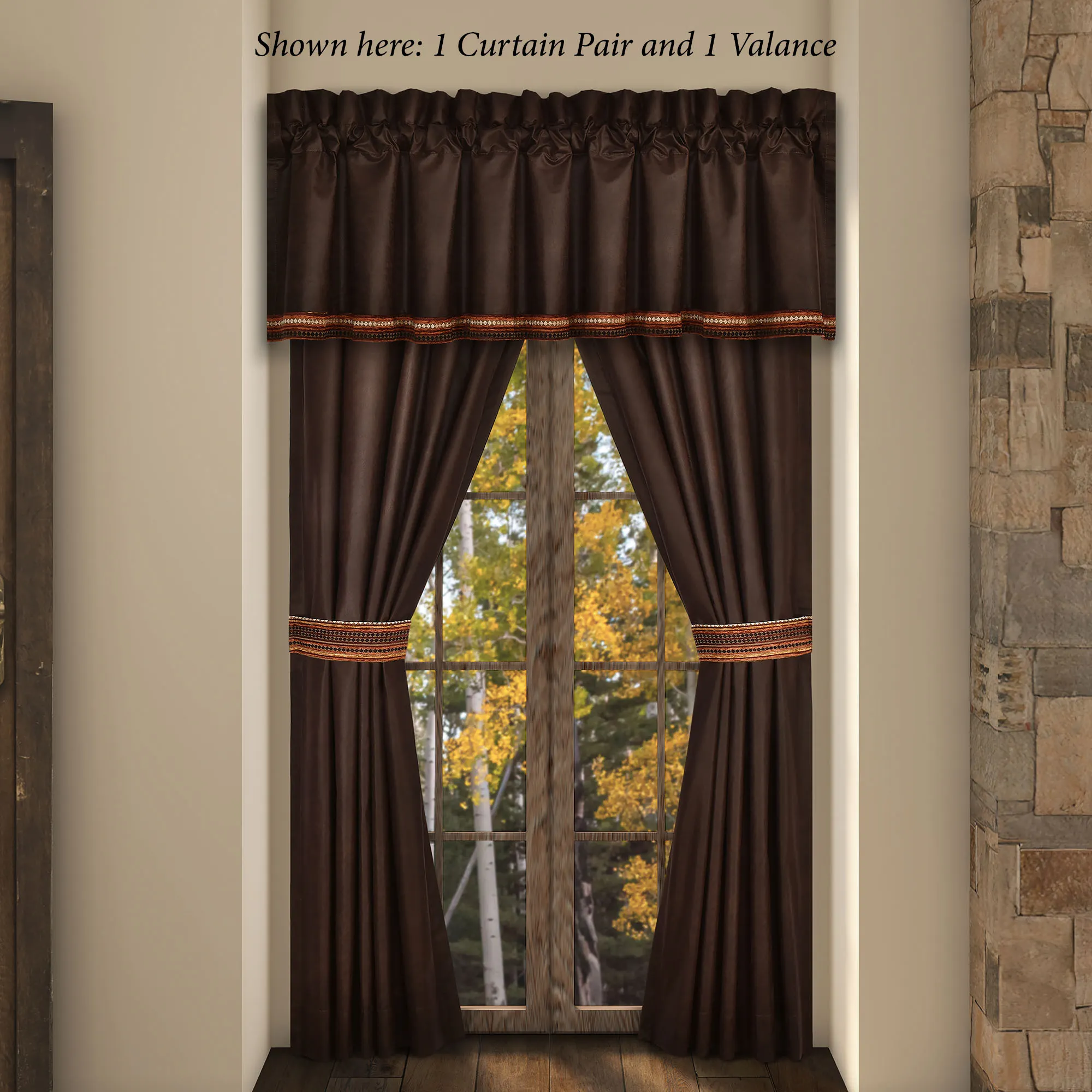 Window Treatments are vegan leather with tailored edges. The lined Wide Curtain Pair has a 3" rod pocket and includes striped tiebacks. Curtains are available in two lengths. Valance has a striped bottom edge and a 3.25" rod pocket.