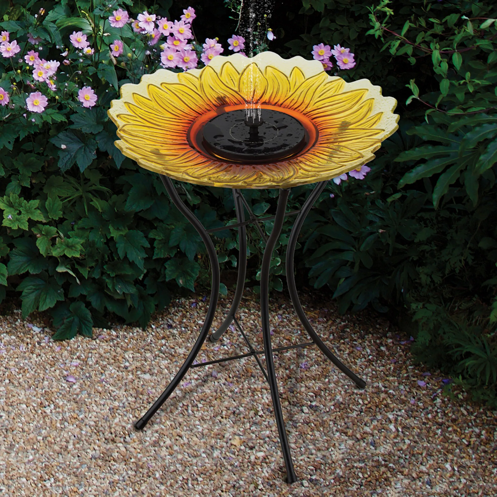 The bold bloom of the Sunflower Solar Fountain Birdbath is certain to attract new feathered friends. Sitting on a black metal stand, the textured art glass bowl features beautiful yellow petals and a shaped edge. The center solar-powered fountain creates a gentle water feature with continuous flow throughout the day that automatically shuts off at night and when the water is low. Waterproof solar panels operate the included 7V 1W pump. Outdoor seasonal use; do not expose this item to freezing temperatures. Overall, the birdbath with stand measures 18"dia.x23"H.