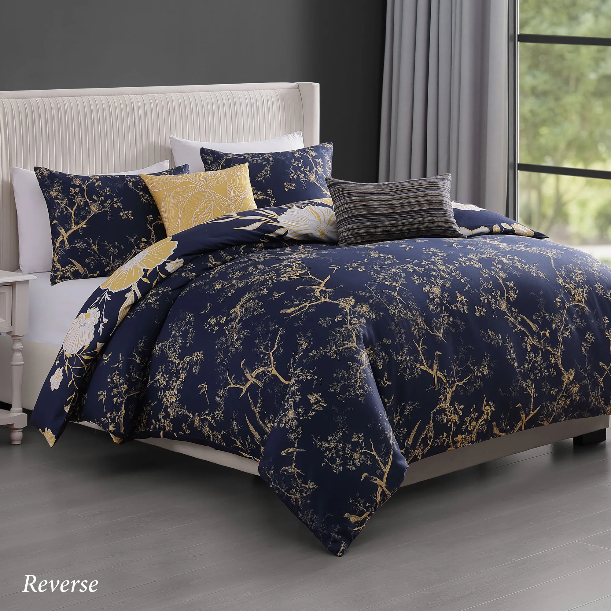 A rising Sunglow illuminates natural beauty hidden in the dark night. The 5-piece Bed Set includes a comforter, 2 shams, and 2 decorative pillows. With a dark blue ground, the printed cotton sateen bedding features overscale flowers and leaves illuminated with the sun's golden yellow and white tones. Pale golden branches, leaves, and birds fill the dark blue comforter and sham reverse with more of nature's allure. Click on the Details tab to read about the other items. Bedding fill is polyester. Machine washable; spot clean the pillows. Imported.