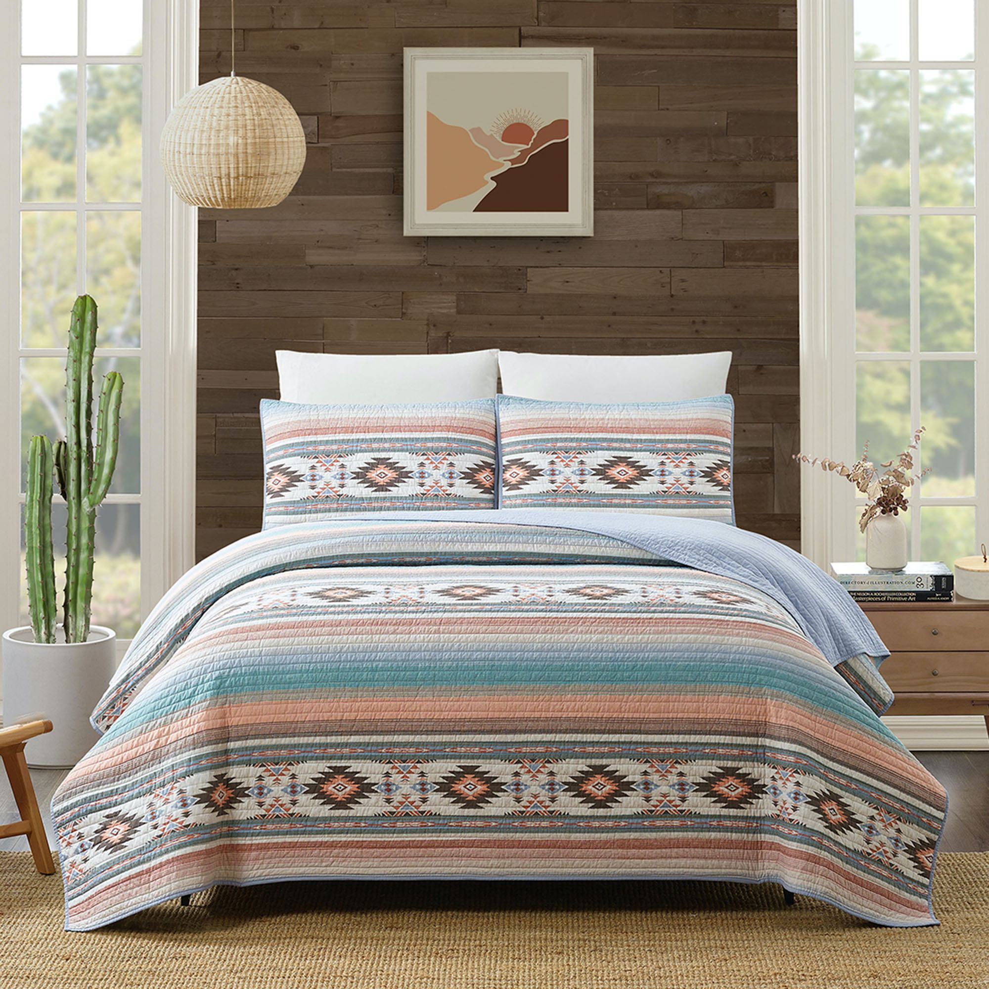Modern Heirloom Sunset Canyon All Cotton Light Blue Teal and Coral Southwest Mini Quilt Set Bedding