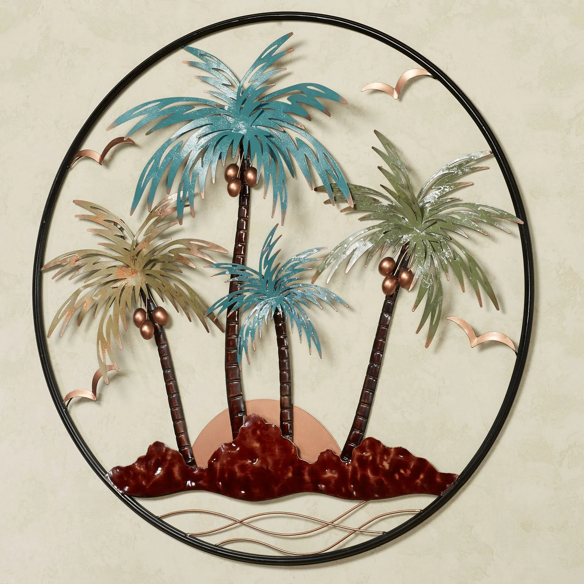 Allow your thoughts to soar away to Sunset Paradise and into this beautiful tropical scene. In a hand-finished, dimensional design, the metal wall art features a copper sun sinking behind the waves, island, seagulls, and palm trees finished with glittered aqua, sage, and deep gold fronds. Click on the Details tab for additional information about the hand-finished process. For indoor or covered outdoor use. With a round black frame, the design measures 36"dia.x2"D.