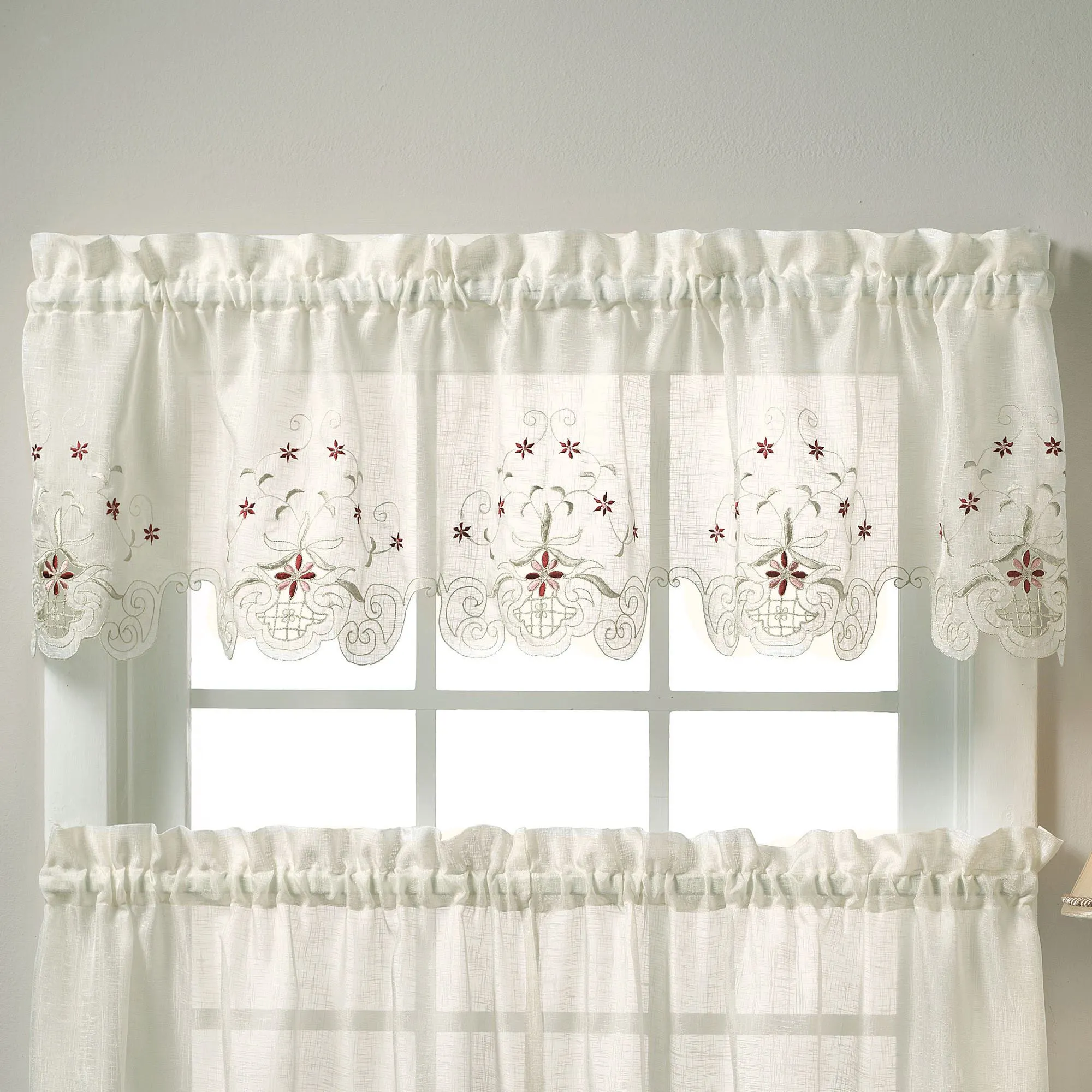 Sunshine Embroidered Window Tiers are a must for your home with their easy-care polyester fabric and delicate embroidery. Tier pair has a solid color, semi-sheer background that enhances the floral embroidery and cutwork on bottom edge. Tailored Valance is shown with the tiers. Window accents have 1.5" rod pockets. Washable. Imported.