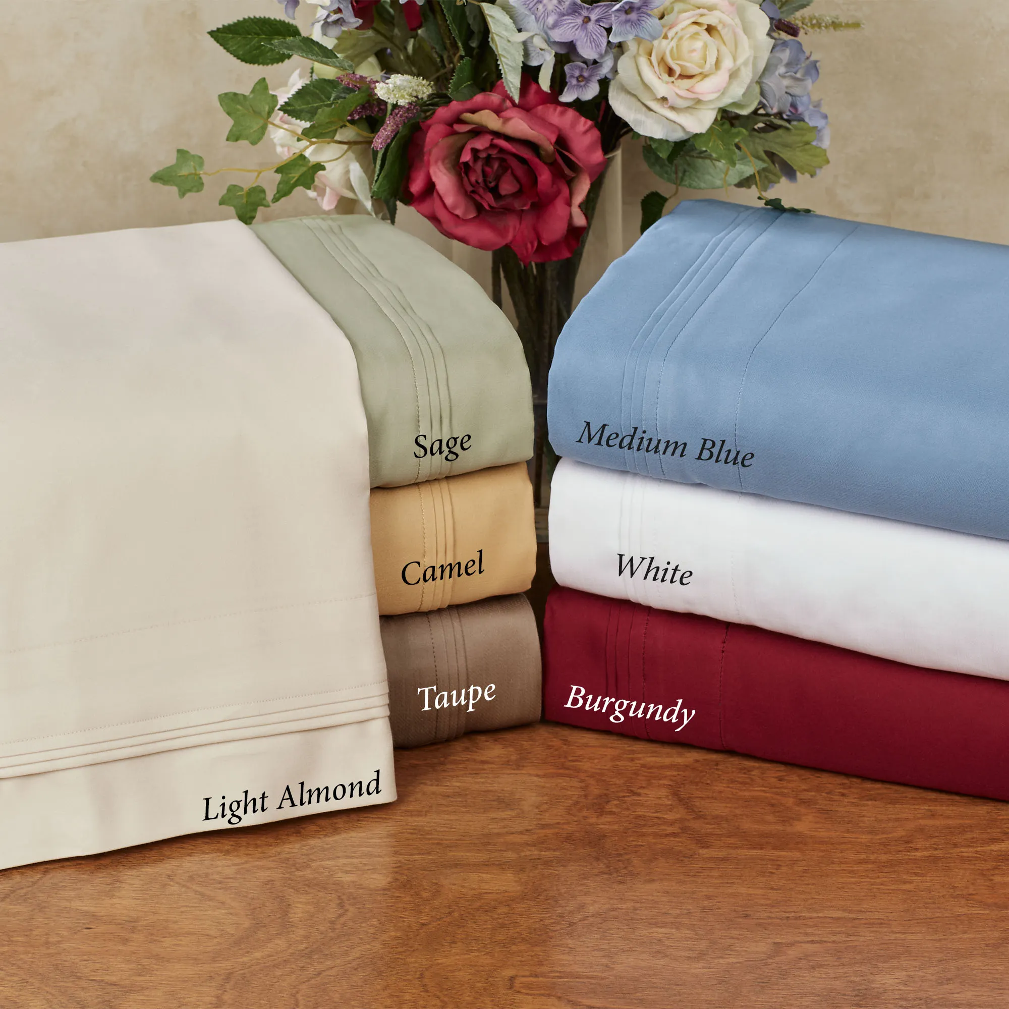 The amazingly soft Superior(R) Sheet Set elevates your bedding with luxury. Made with Egyptian cotton, these solid color sheets have a 1,000 thread count and are OEKO-TEX(R) certified to ensure that they are free of harmful chemicals and substances. Flat sheet and pillowcases have a 4" pleated hem; fitted sheet has elastic all around with 15" deep pockets. Sheet set includes flat sheet, fitted sheet, and pillowcases. Specify Baby Blue, Burgundy, Camel, Charcoal, Desert Sand, Light Almond, Medium Blue, Sage, Taupe, or White. Machine washable. Imported.