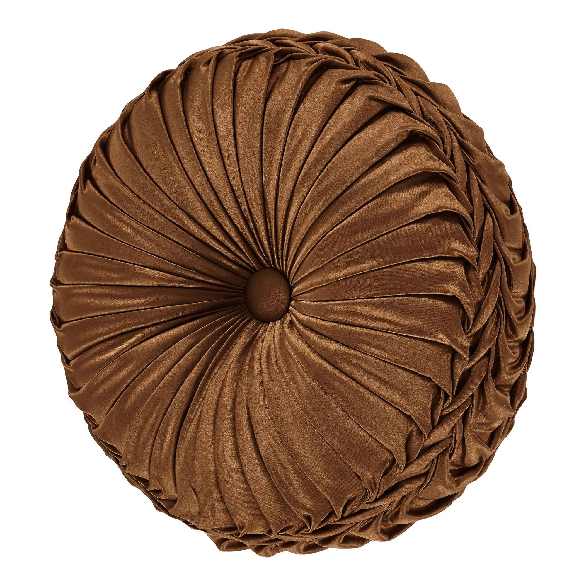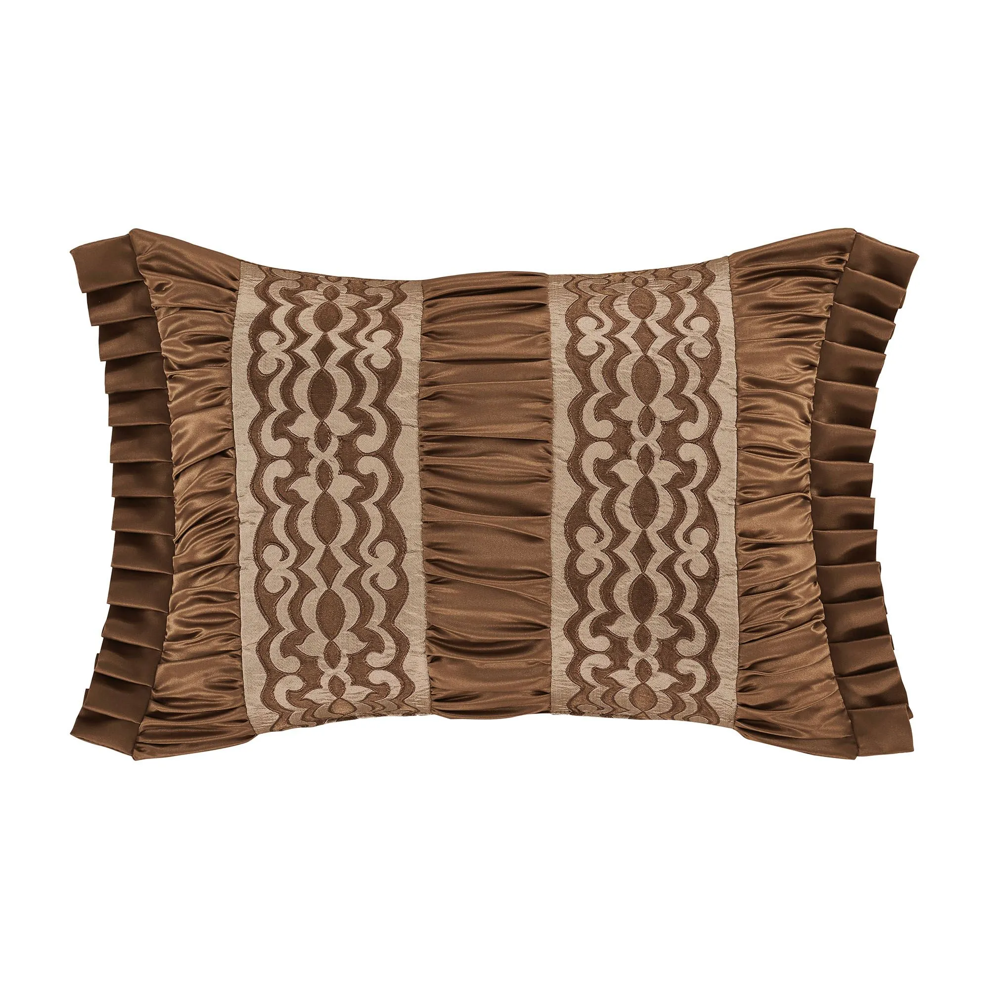 Chocolate Pillows: Spot clean. Flanged Square has classic designs and corner pleats. Pieced Square has a solid center, scrolls, piping, and mitred corners. Jumbo Rectangle has scrolls and piping. The ruched Flanged Rectangle has scrolls and a pleated flange on the length ends. Handmade, reversible Round is pleated with a button tuft and a 3" side gusset.