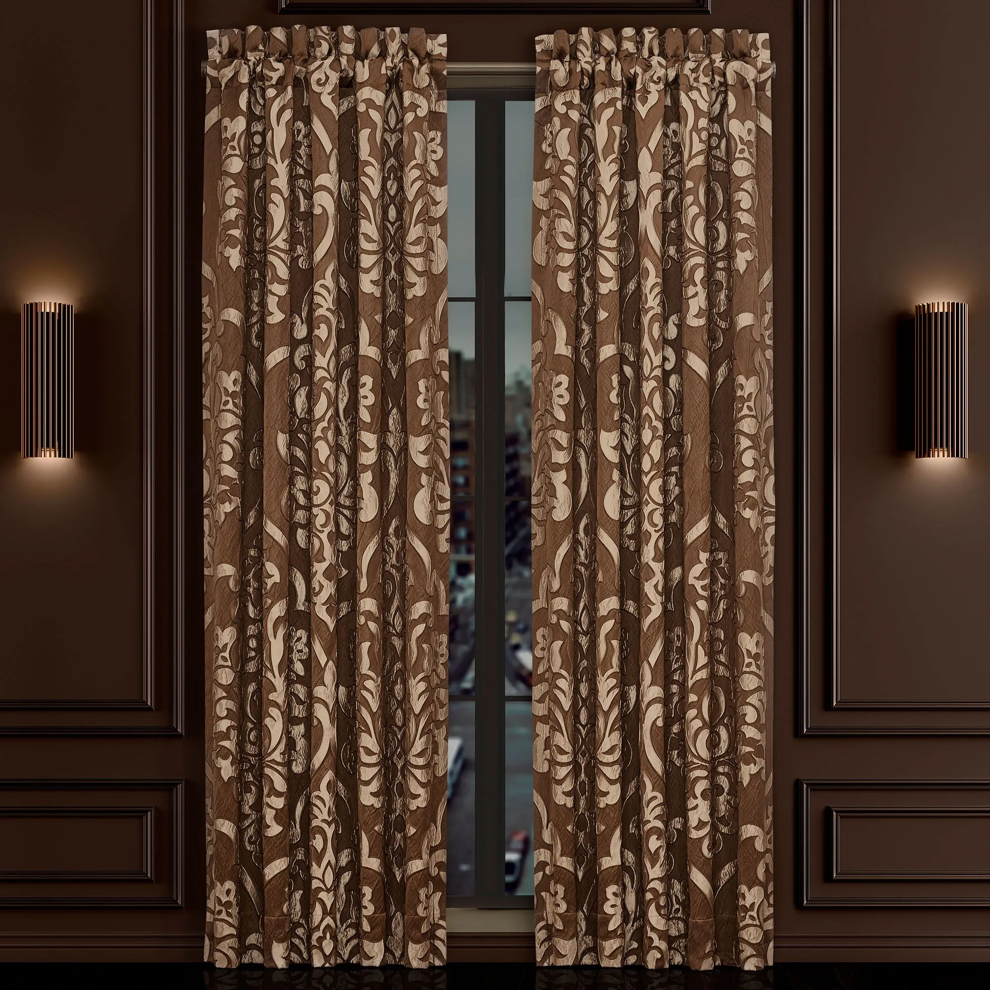 Sumptuously styled, elegant damask designs give the Surano II Bedding its lavish look. This rich polyester ensemble, from J. Queen New York, has woven puff jacquard motifs in dark beige on chocolate.