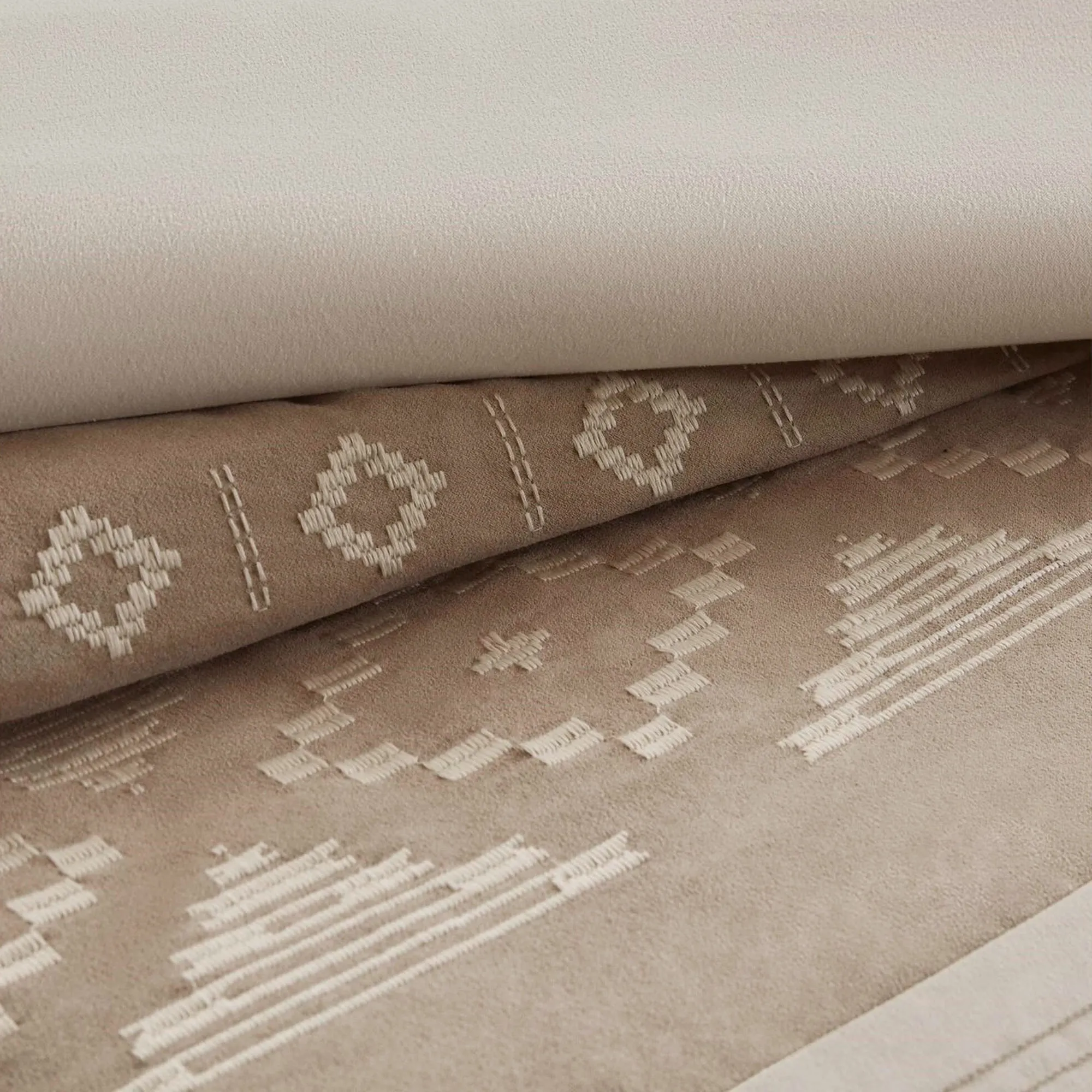 The polyester microfiber square pillow has almond embroidered stripes on ivory and tailored edges; zipper closure. The tailored rectangle pillow has Southwest embroidery on ivory polyester microsuede and is pieced with almond bands; zipper closure.