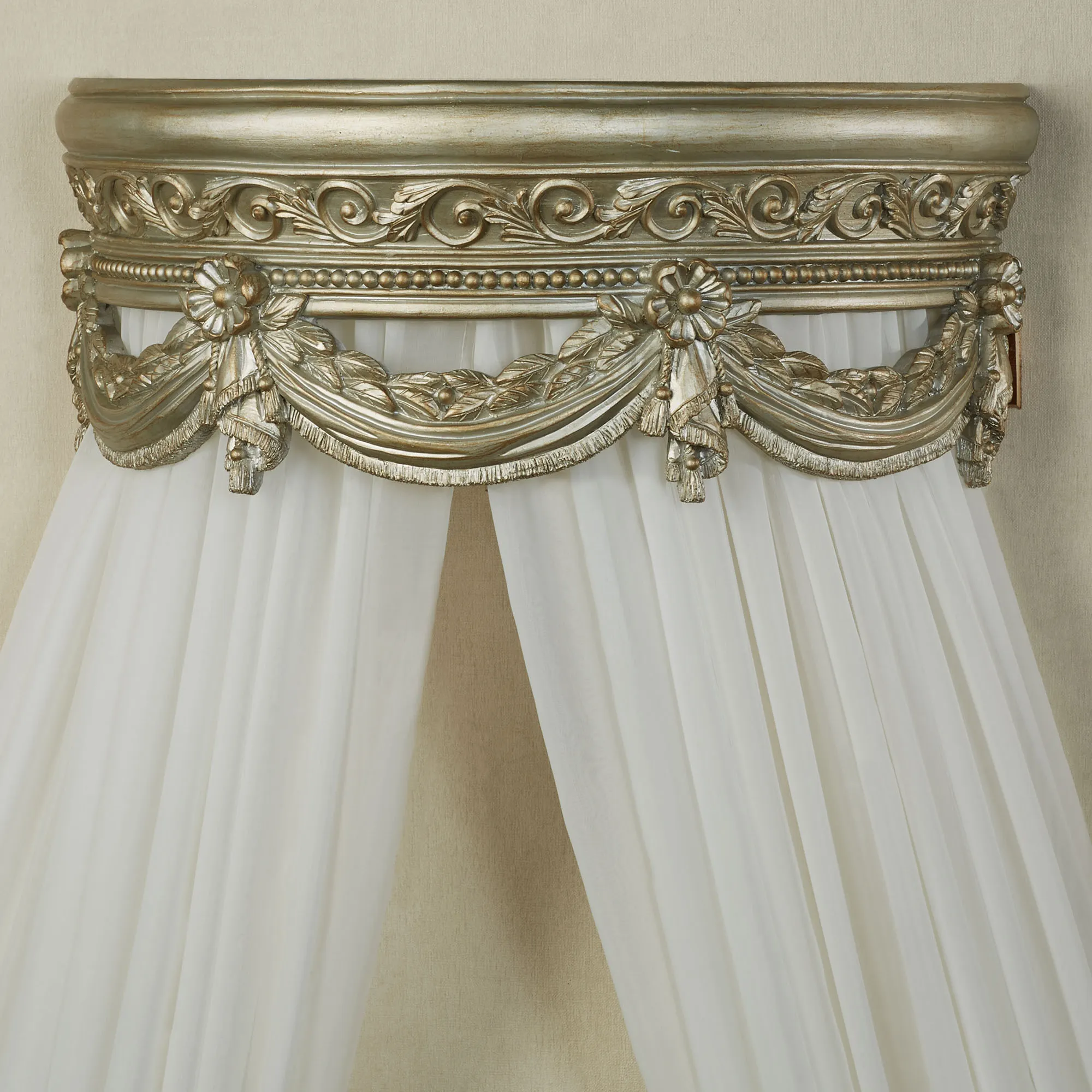 The platinum Swag and Bow Wall Teester Bed Crown enhances a bedroom's elegance. With openwork draped designs, the resin teester features classical elements of scrollwork, acanthus leaves, beaded motifs, florals, beveling, and lovely swags. The removable rod in the back holds your panels or sheers. Overall, the wall teester measures 18"Wx9"Dx7"H.