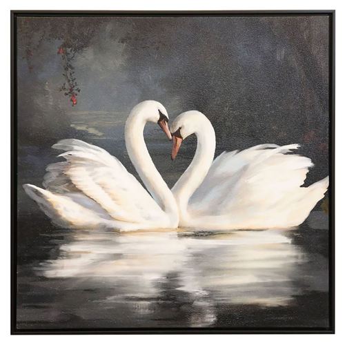 Love blossoms on Swan Lake. Proudly made in the USA, the framed canvas wall art features two white swans, bonded for life, forming a sweet heart with their necks as they float on the water's reflective surface. Gallery-wrapped over a wood frame, the canvas artwork is finished with a black plastic frame. Artwork measures 35" sq.
