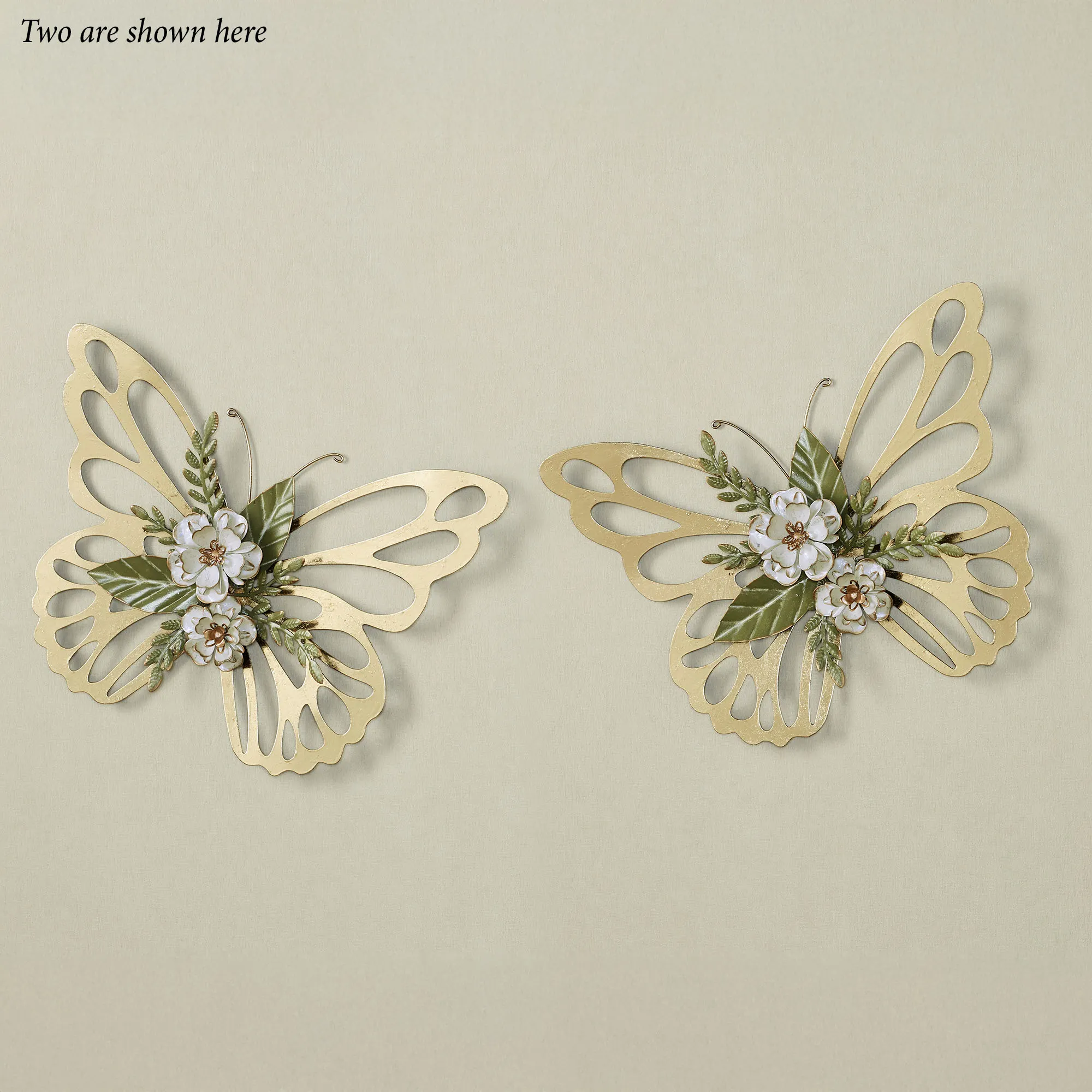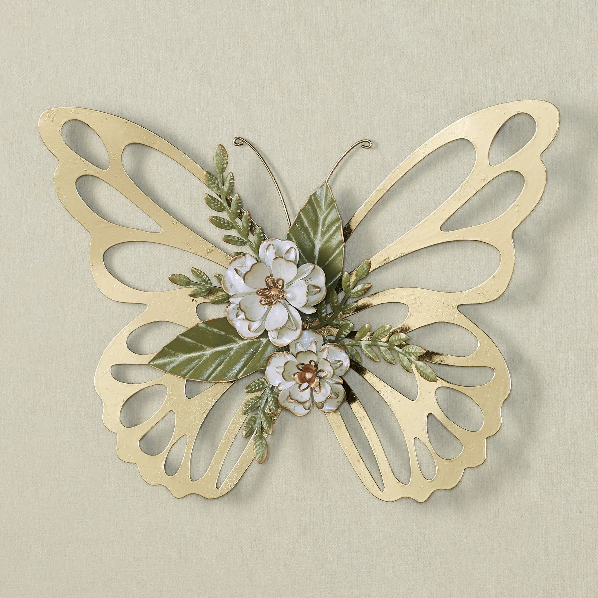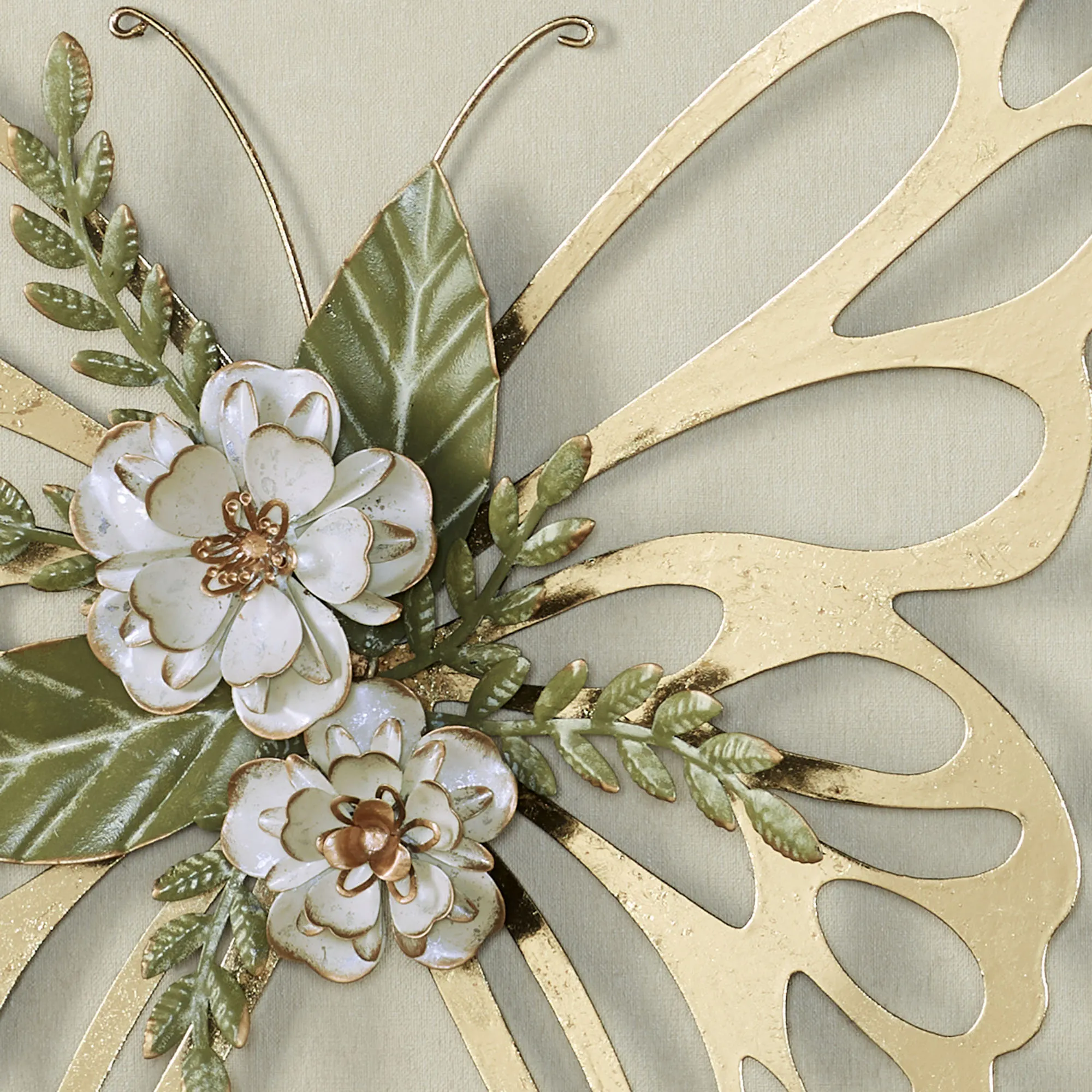 The Sweet Butterfly Wall Accent blooms with garden finery. With openwork detailing, the gold foil butterfly features a dimensional bouquet of textured greenery and layered flowers handpainted in ivory and gold. Artwork may hang in various positions. Overall, the metal butterfly wall sculpture measures 20"Wx1.5"Dx15"H.