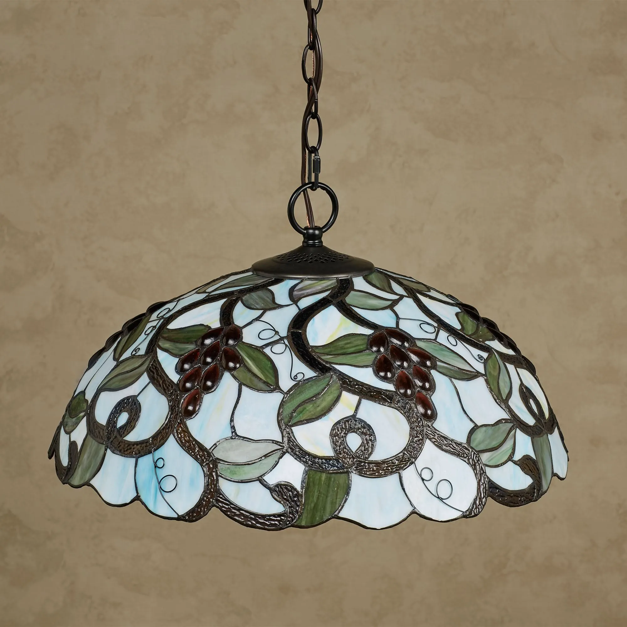 Perfect for your kitchen or dining room, the Sweet Jubilee Ceiling Light delights with a vision of grapes upon the vine. Accented with charming curling tendrils, the handcrafted, hand-cut, and hand-soldered stained glass design features light sage leaves, iridescent plum grape bunches, curling textured vines, and a soothing sky blue and white background. The metal mounting cap and included 46.5"L hang chain have a bronze finish. UL listed. Requires three 60W max. bulbs. Hardwiring is required. The hanging ceiling light measures 20"dia.x11"H.