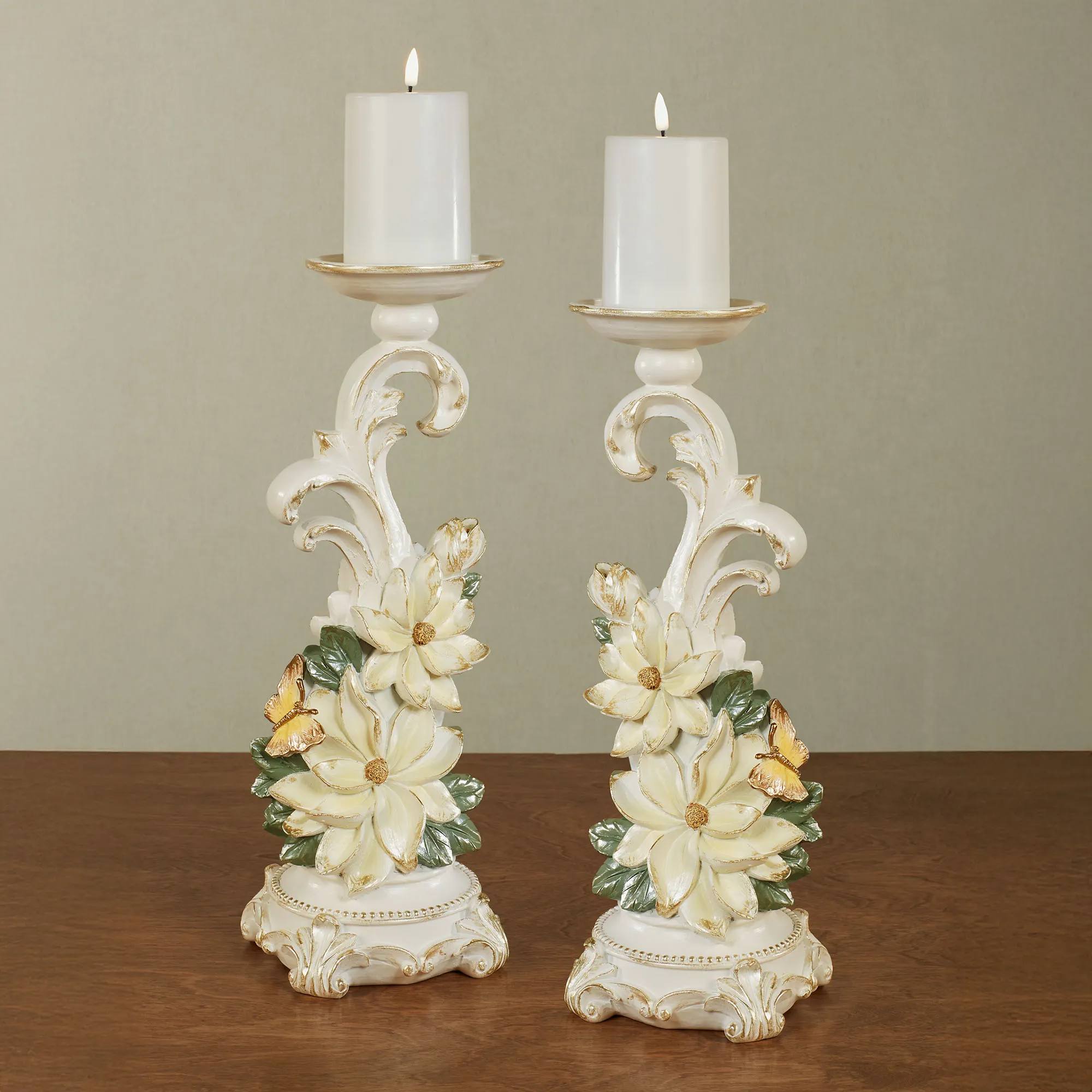 Sweet Magnolia Ivory Floral Candleholder Pair