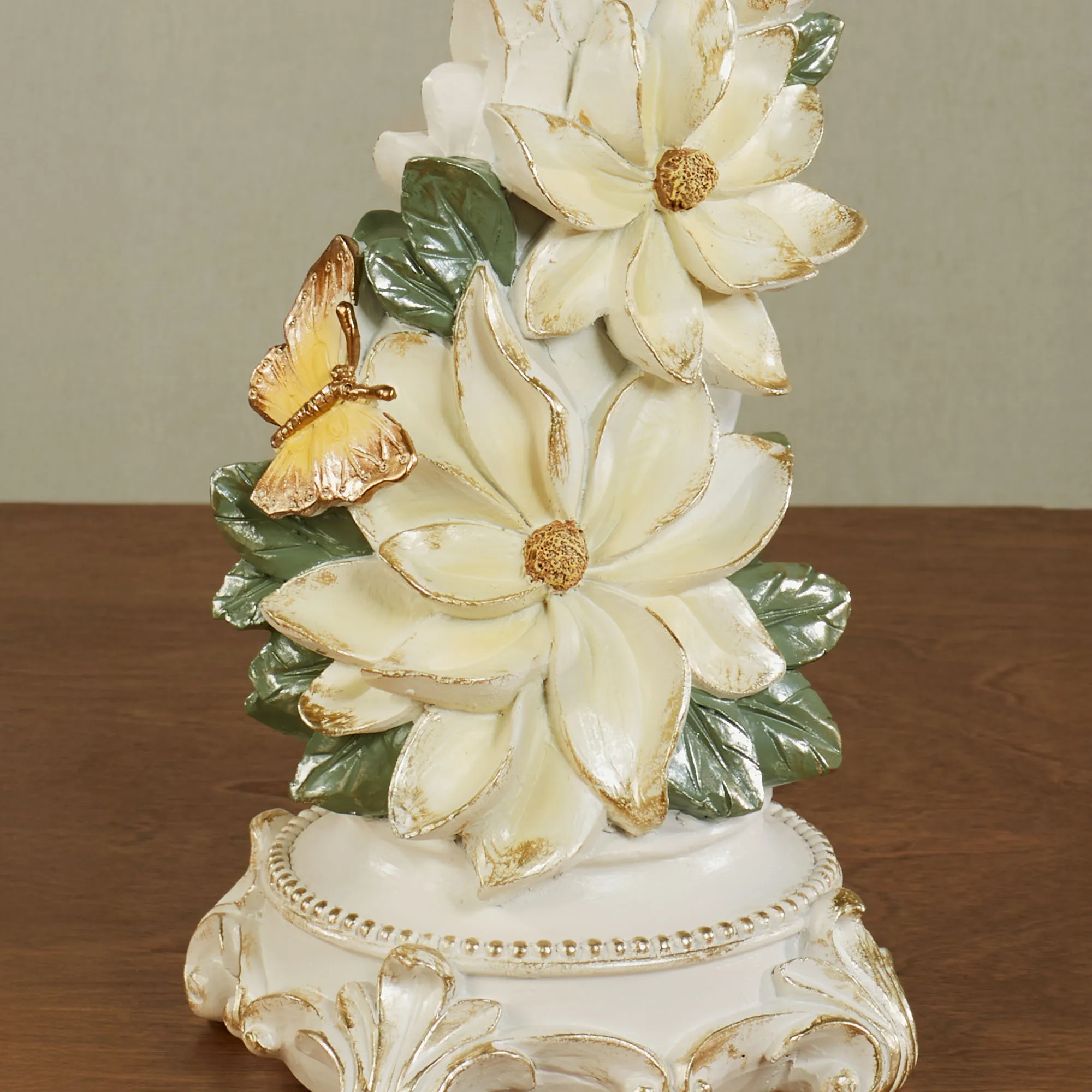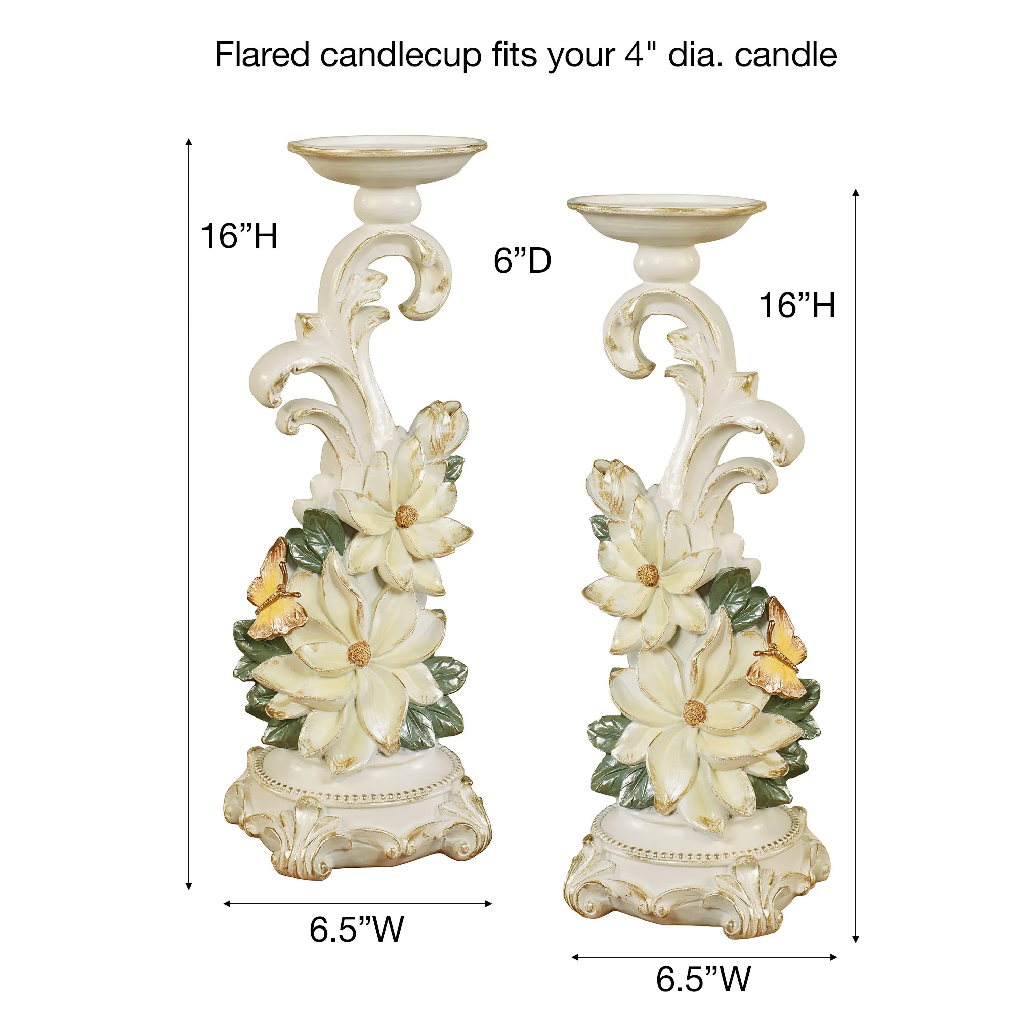 Nothing draws attention like the Sweet Magnolia blossoms on this candleholder pair. Highlighted with gold, each ivory resin candleholder features a footed base, a flourishing scroll shape, elegant details, and a flared candlecup that fits your 4" dia. candle. Lovely creamy magnolia blooms, green leaves, and yellow butterflies decorate the handpainted designs. Overall, each magnolia floral candleholder measures 6.5"Wx6"Dx16"H.