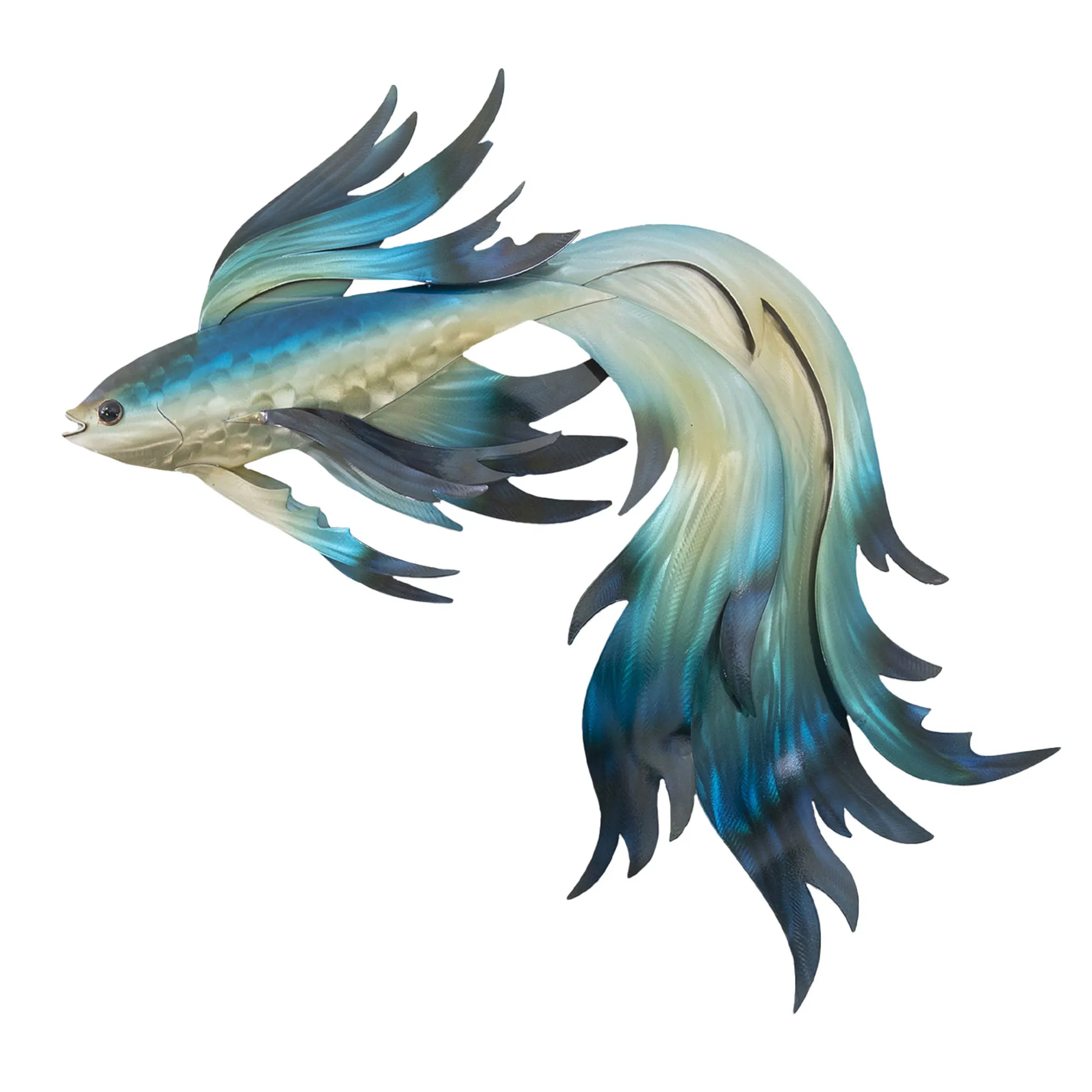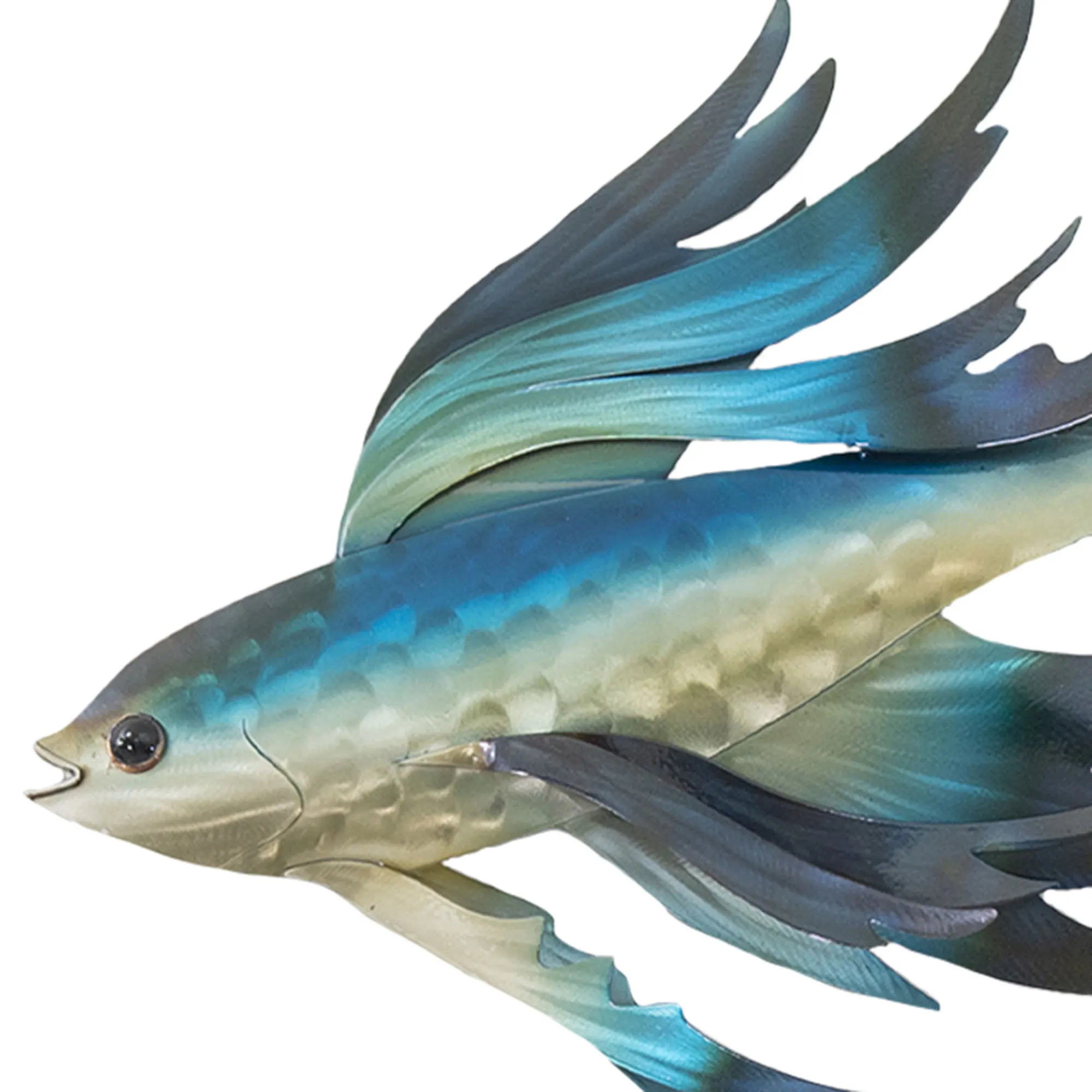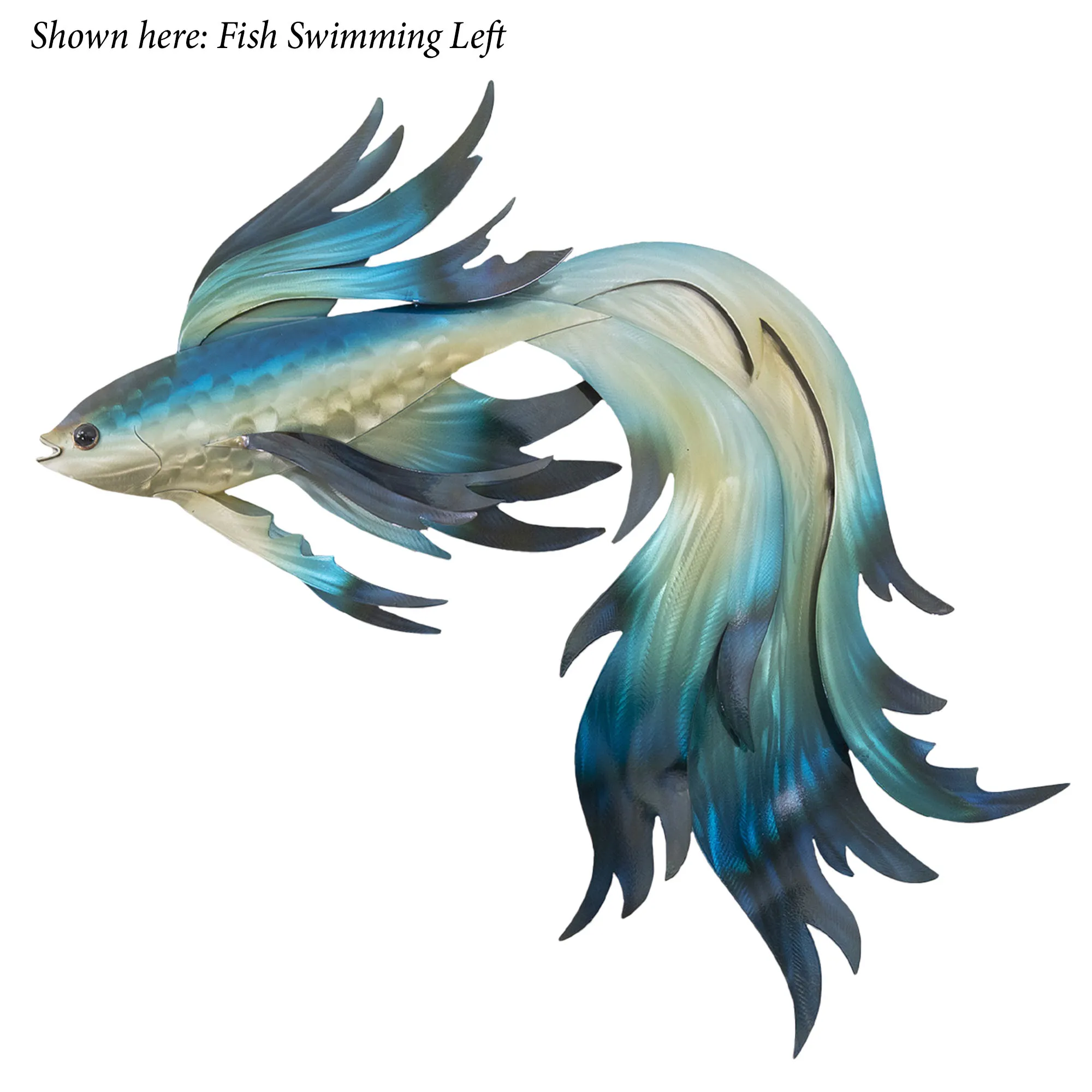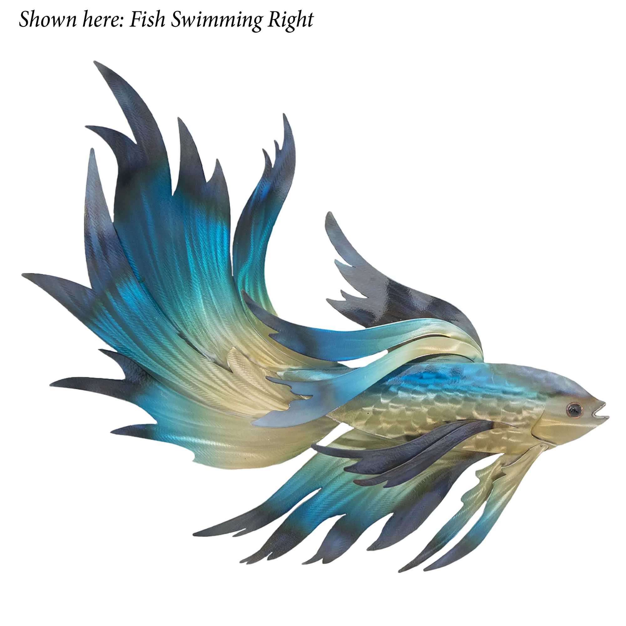 Search the seas for these Swimming Fish. Each handcrafted metal wall sculpture, by artist Joanne Ferrara, features a fish with hand-grinded detailing and hand-dyed, variegated blue, aqua, and gold shades. Indoor or covered outdoor use. Fish wall sculptures are sold individually. Swimming Left Fish measures 19"Wx1.5"Dx20.5"H. Swimming Right Fish measures 20"Wx1.5"Dx17.5"H.