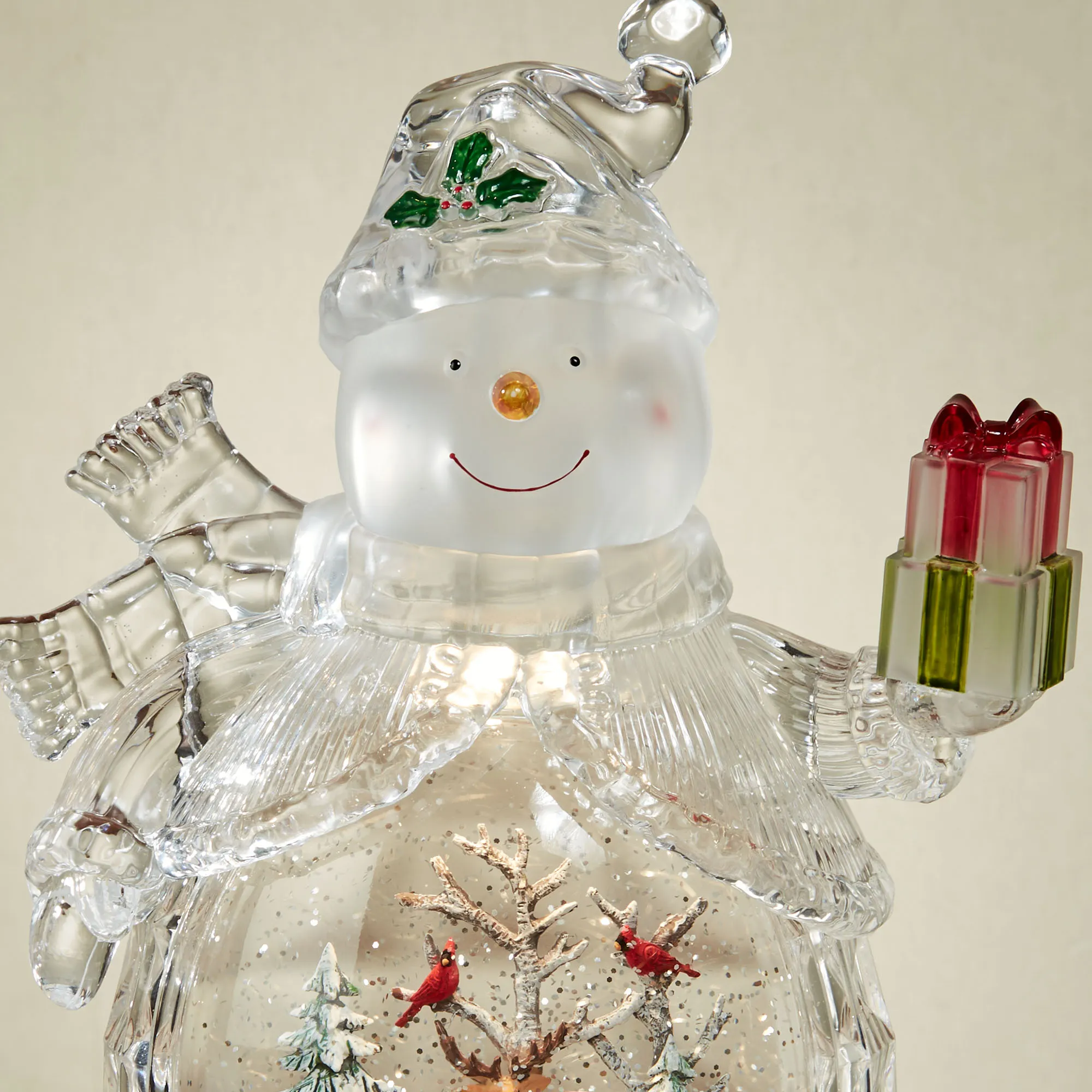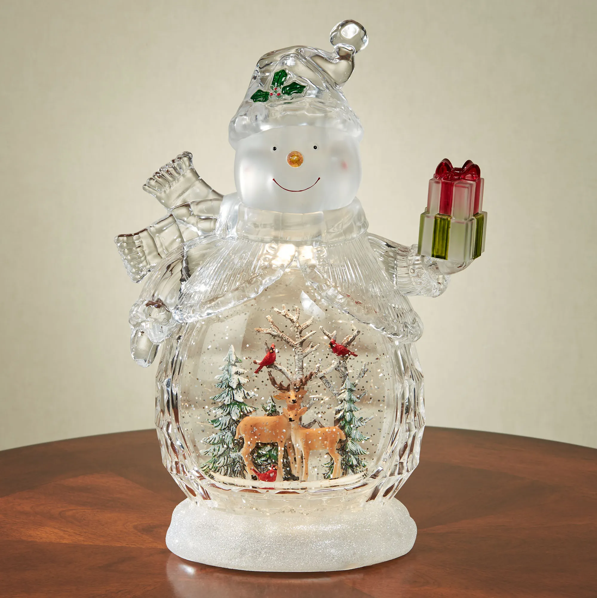 The Swirl LED Snowman from Confetti Lites(TM) by Roman, Inc. captures a lovely winter scene. Crafted from acrylic, the clear snowman features a faceted body, charming sweater, frosted face, and clear Santa hat, all atop a white glittered base. He also holds green and red gifts in his hand. The liquid-filled body features two deer, red cardinals, pine trees, and birch trees. The built-in LED light glows inside and shimmers upon the swirling glitter. Requires three of your AA batteries or your adapter for use with the included USB cord and operates from the on/off switch on the bottom. Measures 9"Wx4.5"Dx12.5"H.