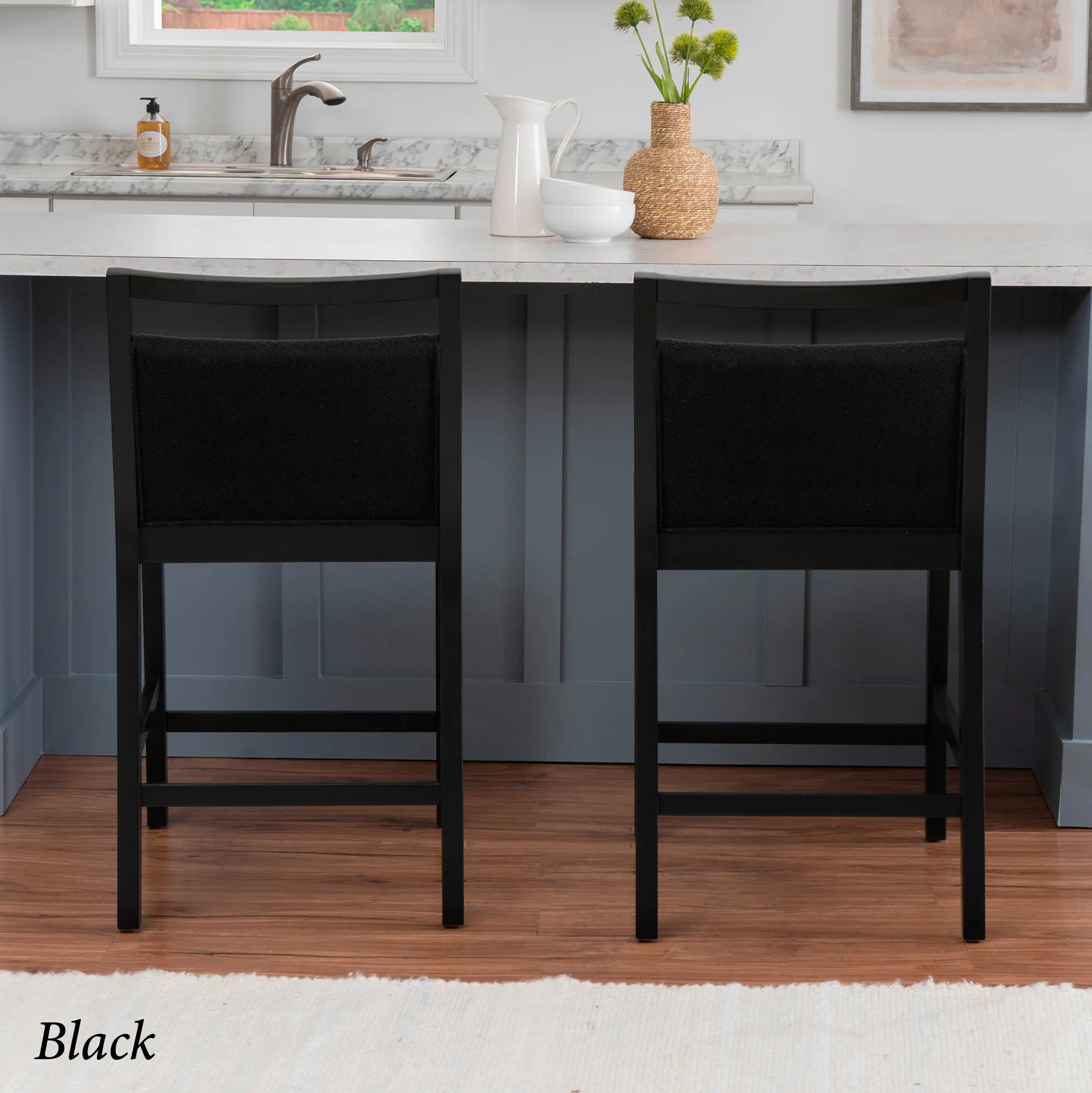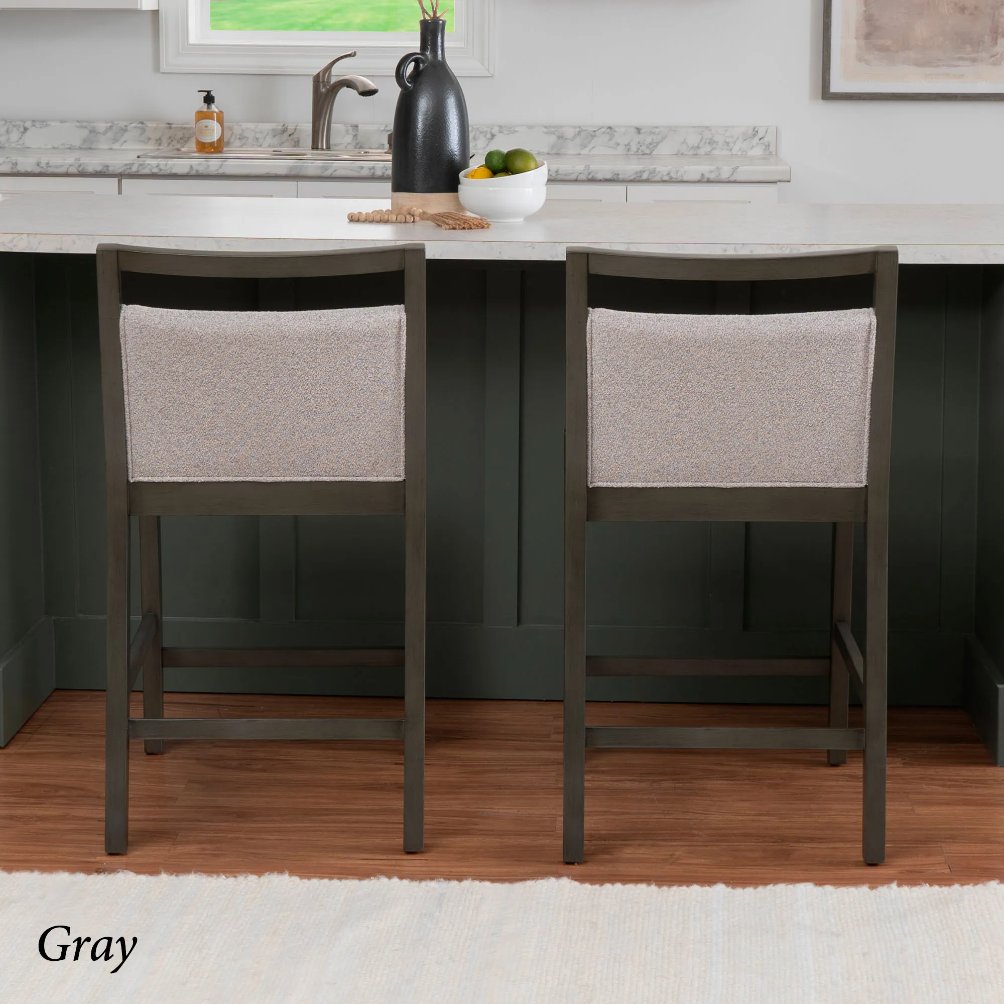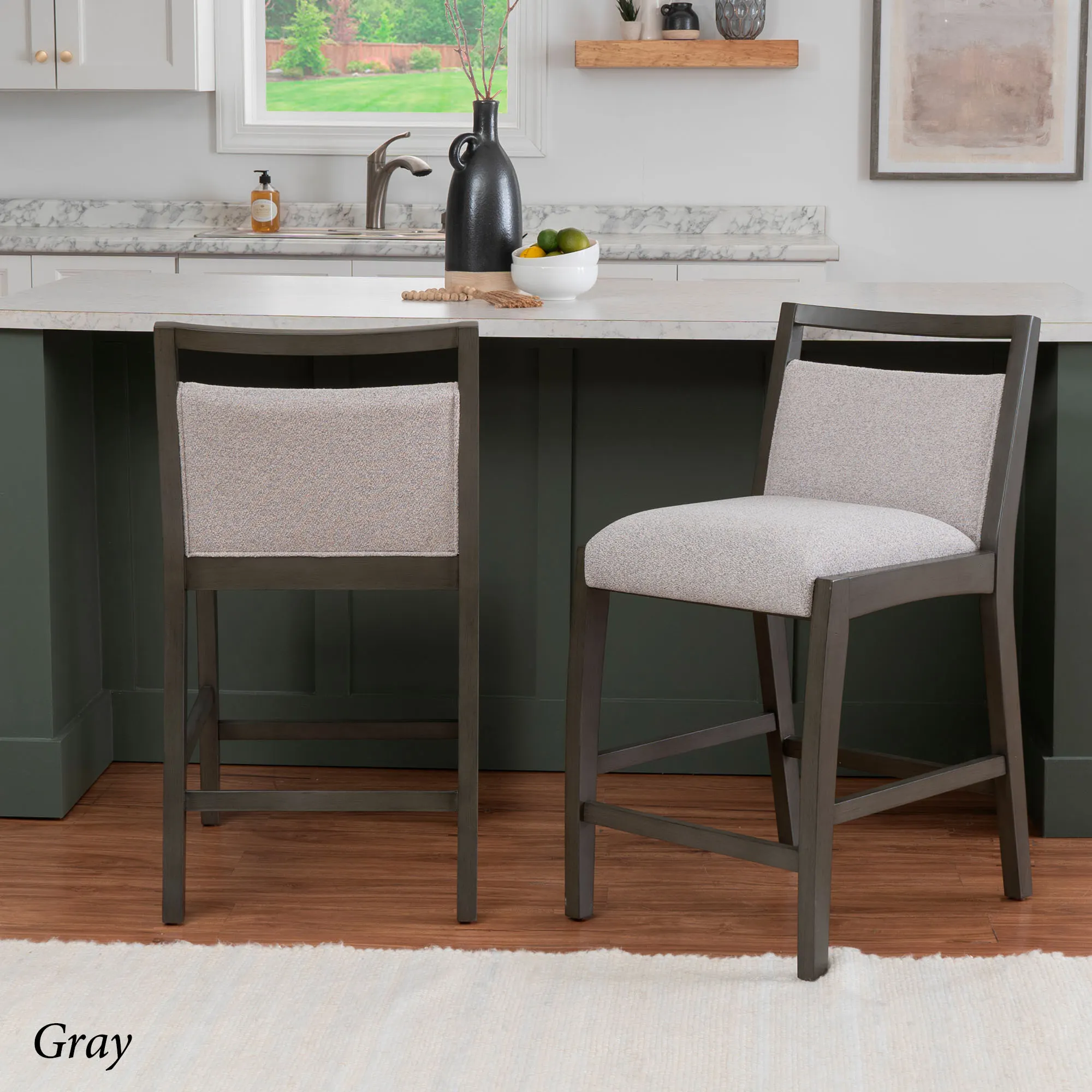 Clean lines profile the Sylvester Counter Stool with a chic, simplistic air. With a painted, lacquered finish, each wood chair features straight legs, comfortable footrests, and a foam-filled seat cushion and backrest. Woven polyester textured fabric upholstery decorates the cushions with a color-coordinating hue. Black has color-matching black fabric. Gray has light gray fabric. Maximum recommended weight is 350 lbs. Seat-to-floor height is 26". Perfect for kitchen islands, tables, or counters measuring 35"H to 39"H, the counter-height chair measures 20"Wx24"Dx37.5"H and weighs approx. 20 lbs. Spot clean the cushions.