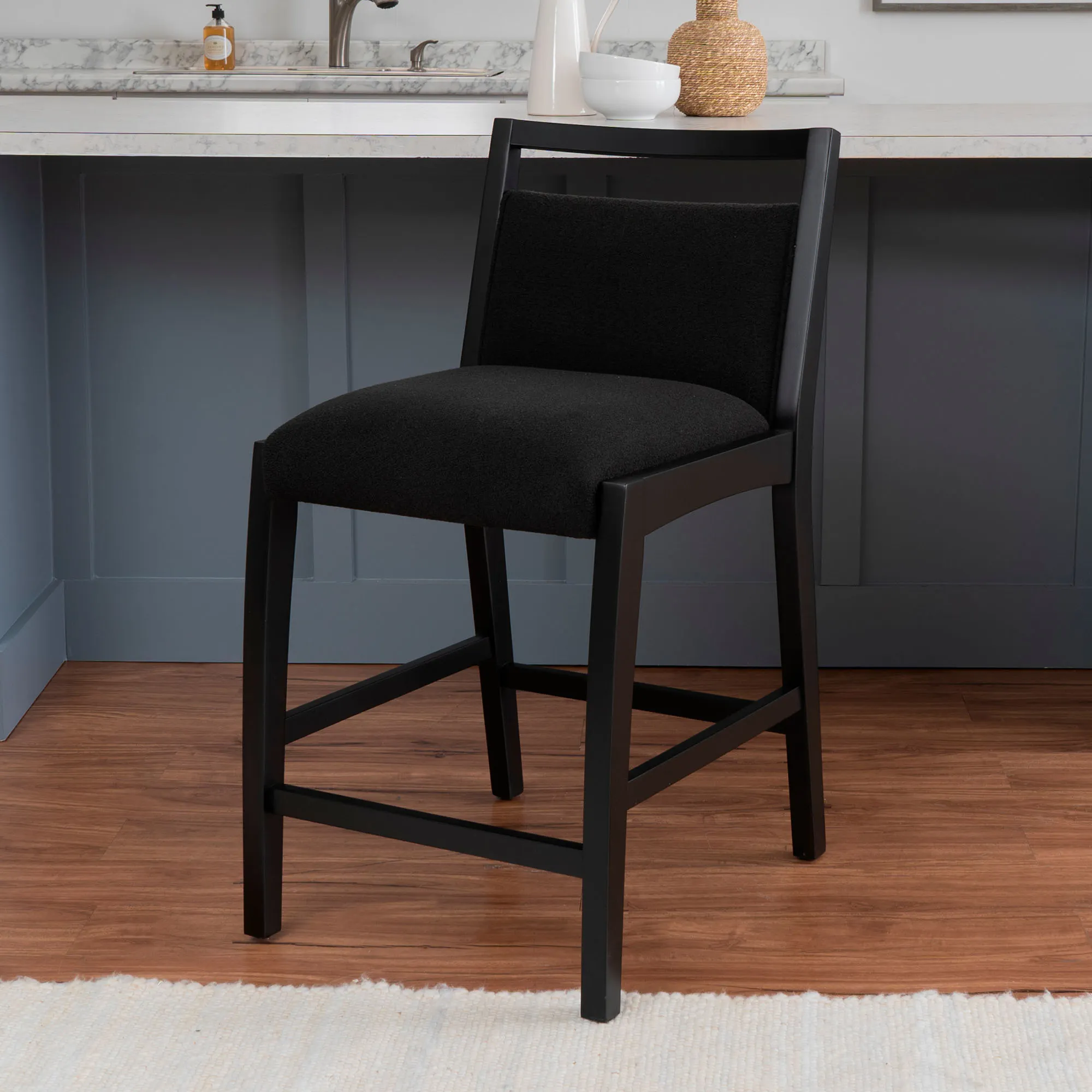 The Sylvester Counter Stool is made from wood, foam, and polyester.