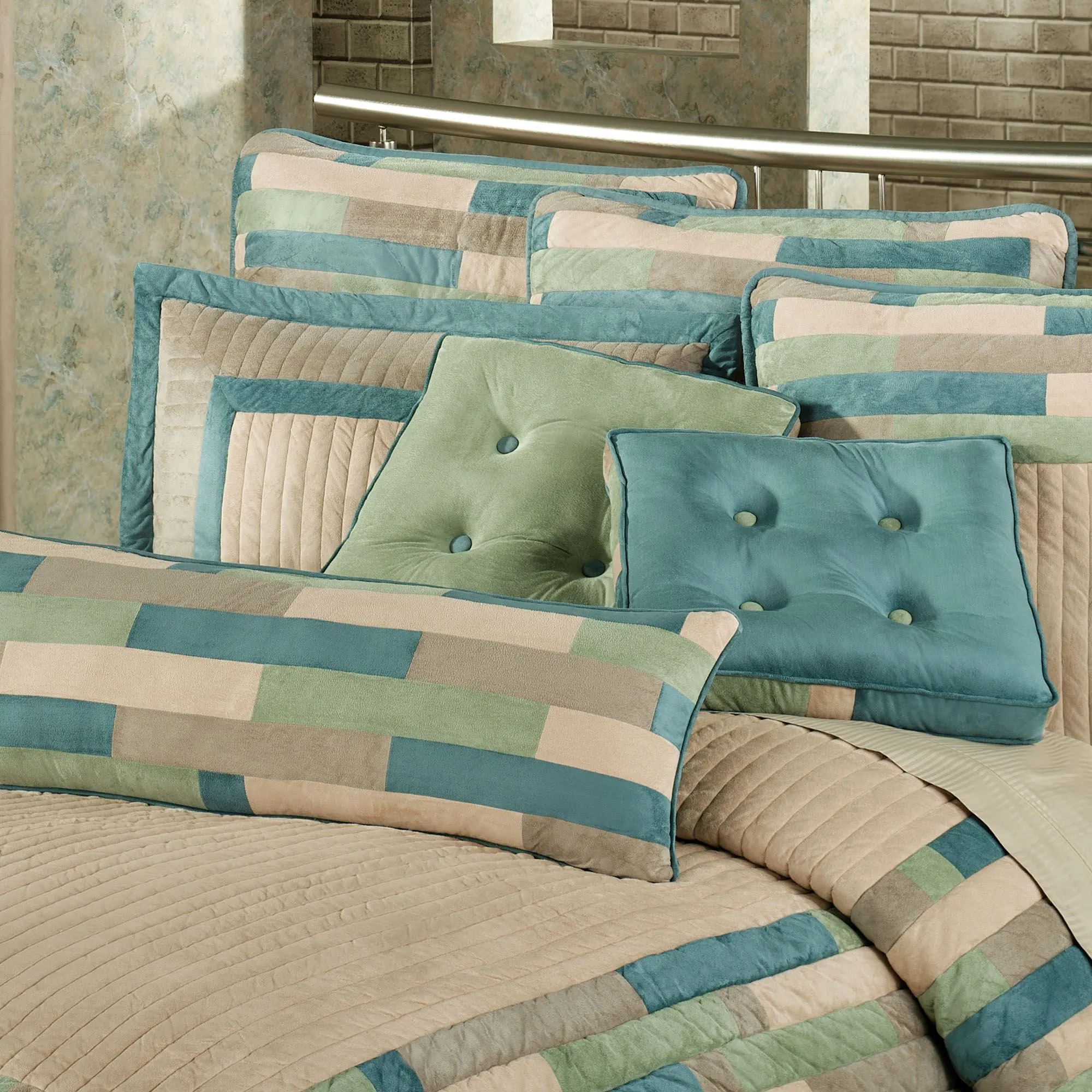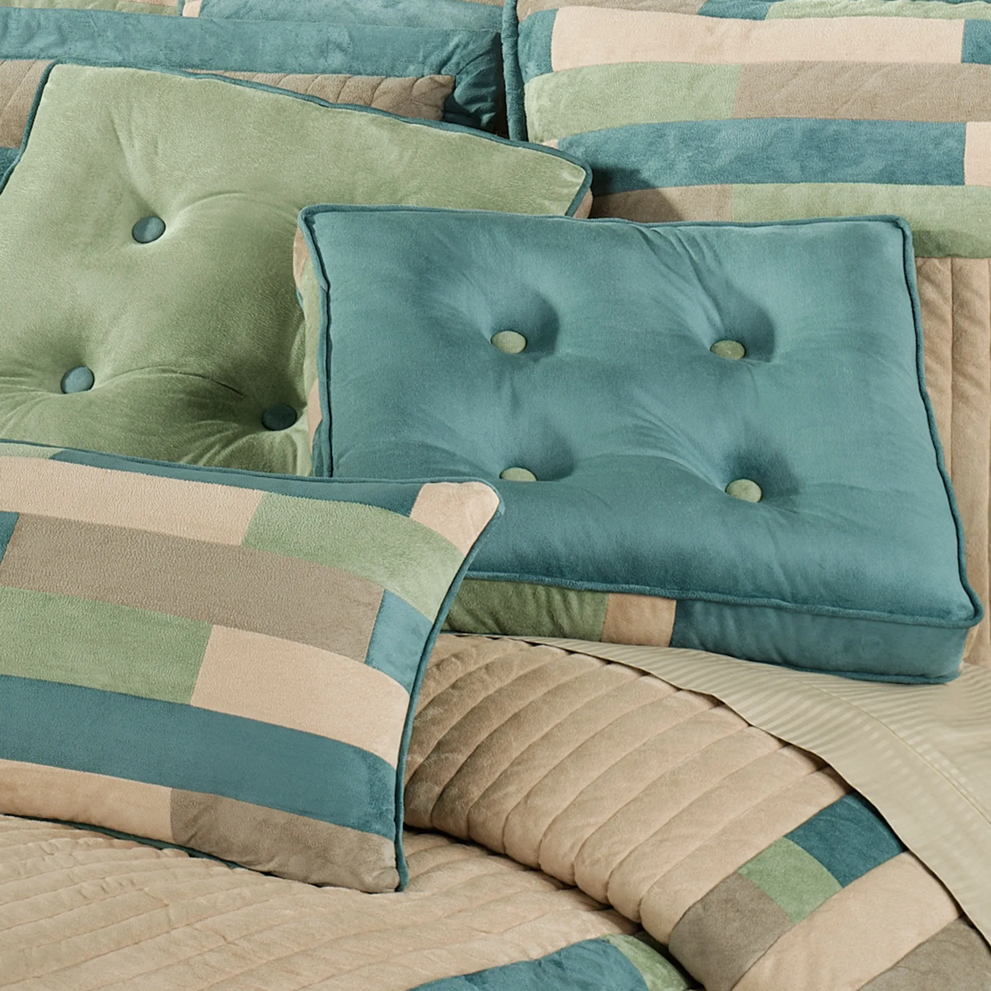 CLOSEOUT PRICES! You can't go wrong with the style of the Synergy Decorative Pillows. The piped, polyester faux suede pillows mesh well with many themes. Square, 18", is glacier with cypress button tufts; reverses to cypress with glacier button tufts. Side gussets have pieced block designs of fawn, sand, glacier, and cypress. Jumbo Rectangle, 14"x36", has pieced block designs of fawn, sand, glacier, and cypress; reverse is glacier. Spot clean. Imported.