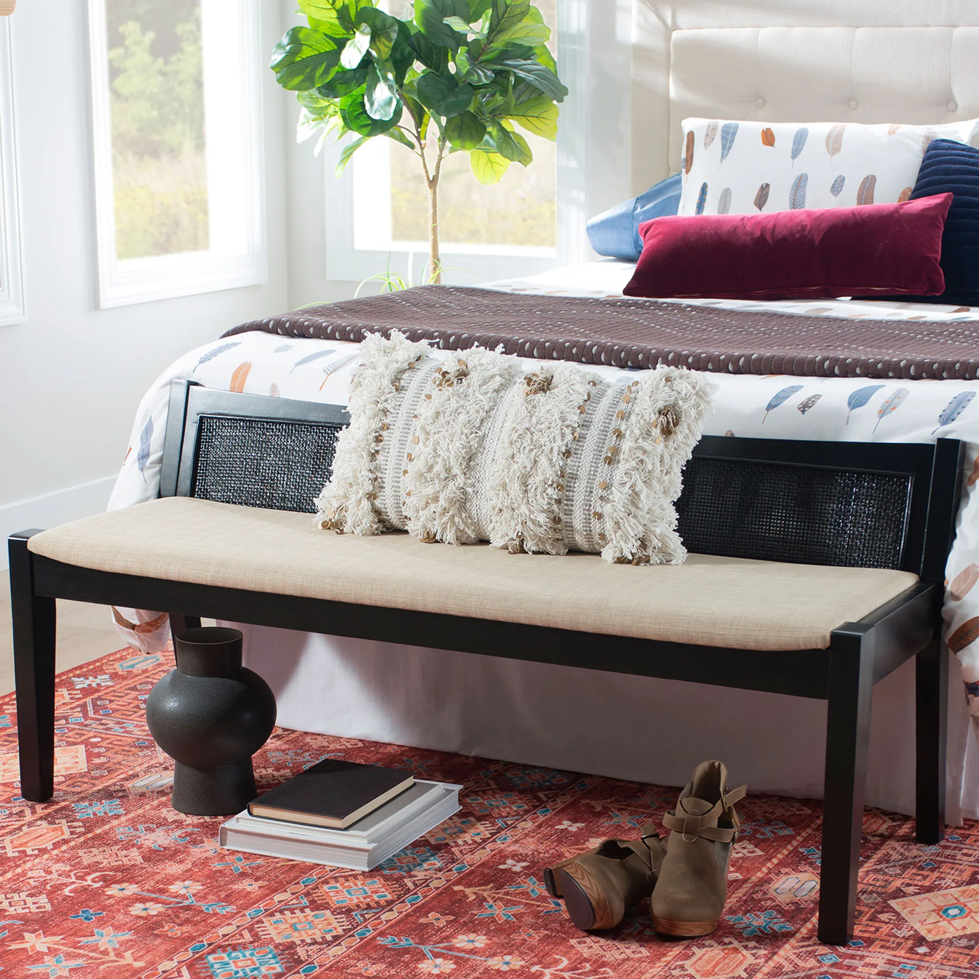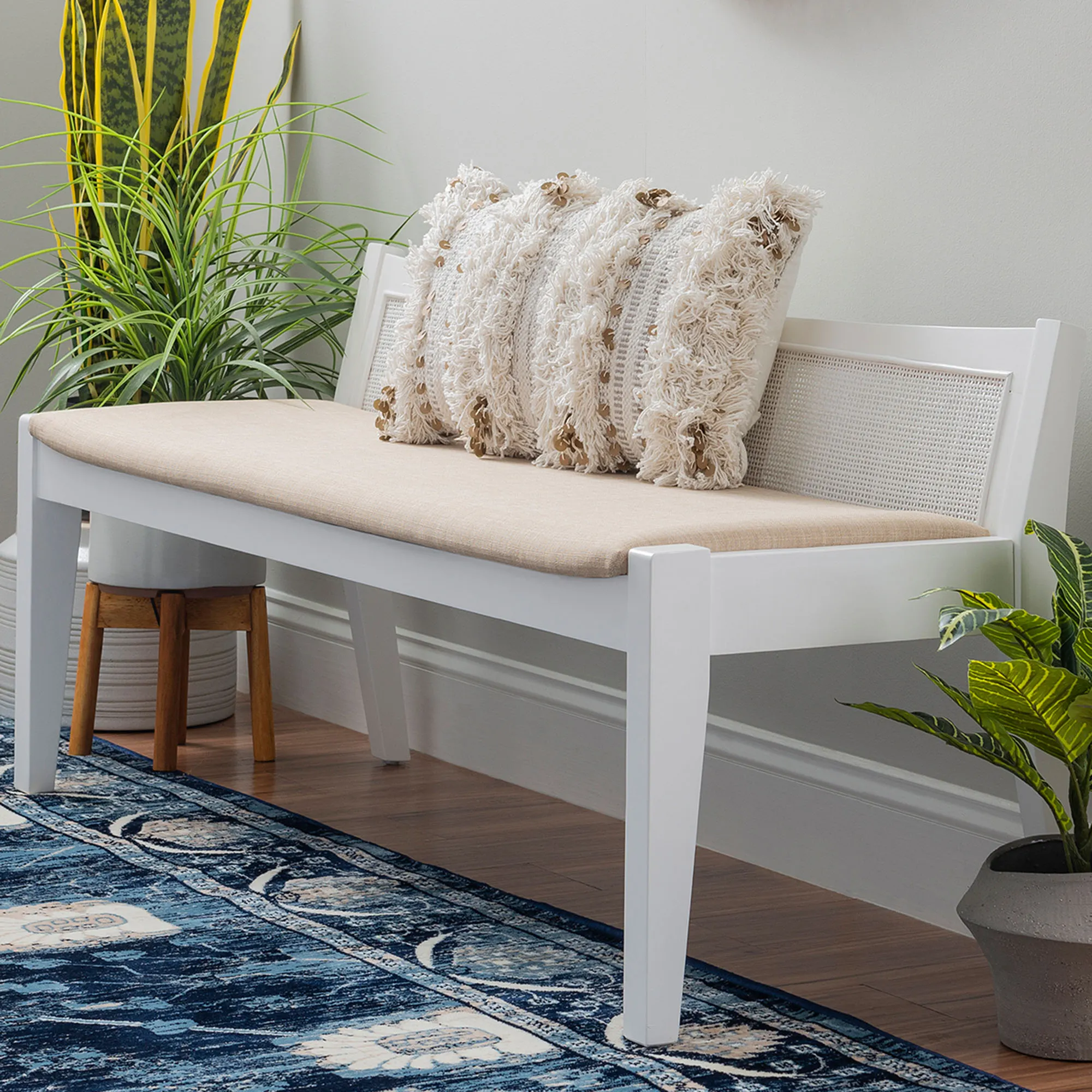 Exhibit a modern look with the Talia Cane Bench. This wooden bench has a solid wood frame, a basket weave cane rattan backing, and a polyester linen beige seat with a padded foam cushion. Weight capacity is 275 lbs. Measures 52.5"Wx19"Dx23.5"H; weighs 30 lbs. Spot clean the seat.