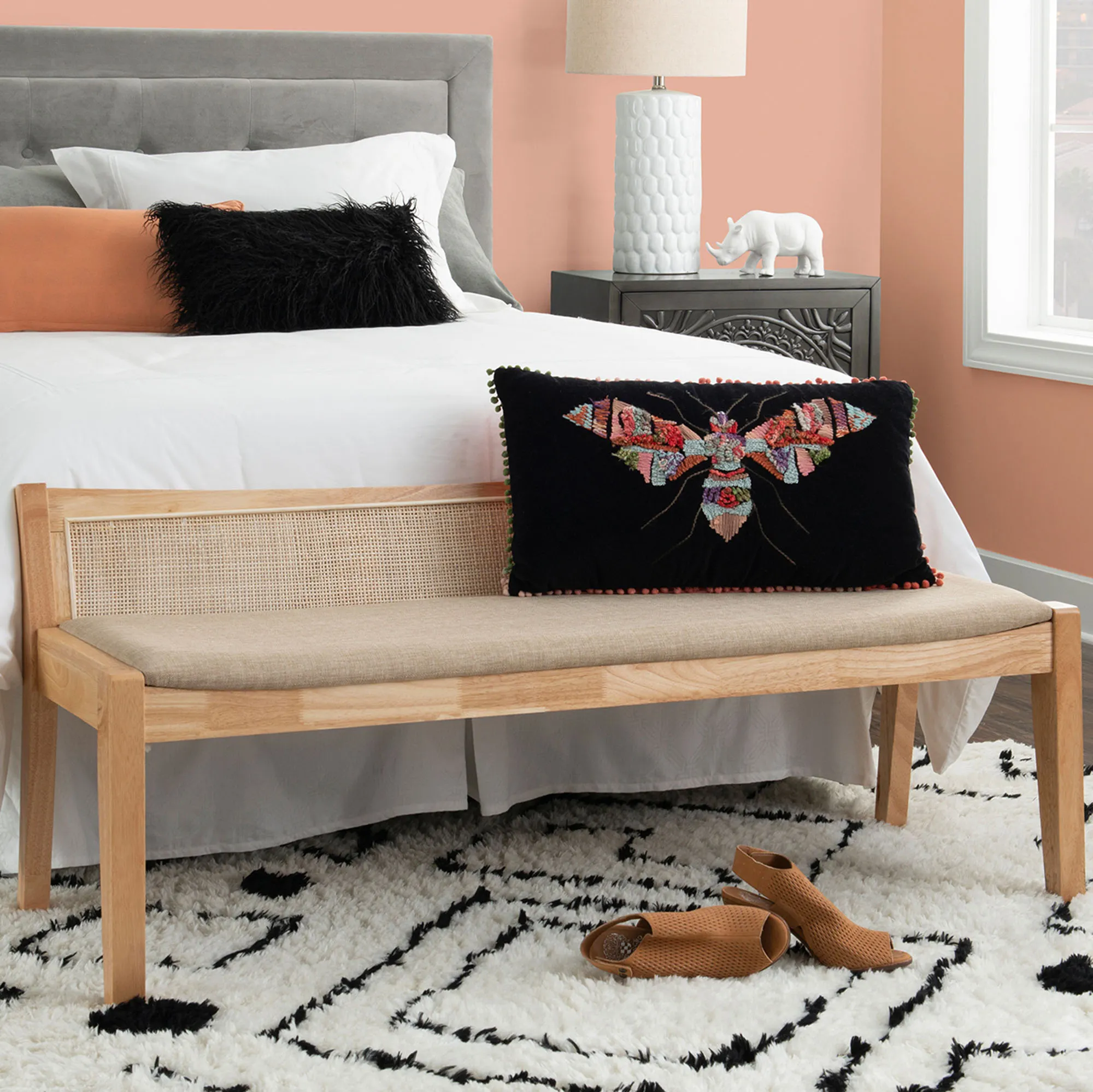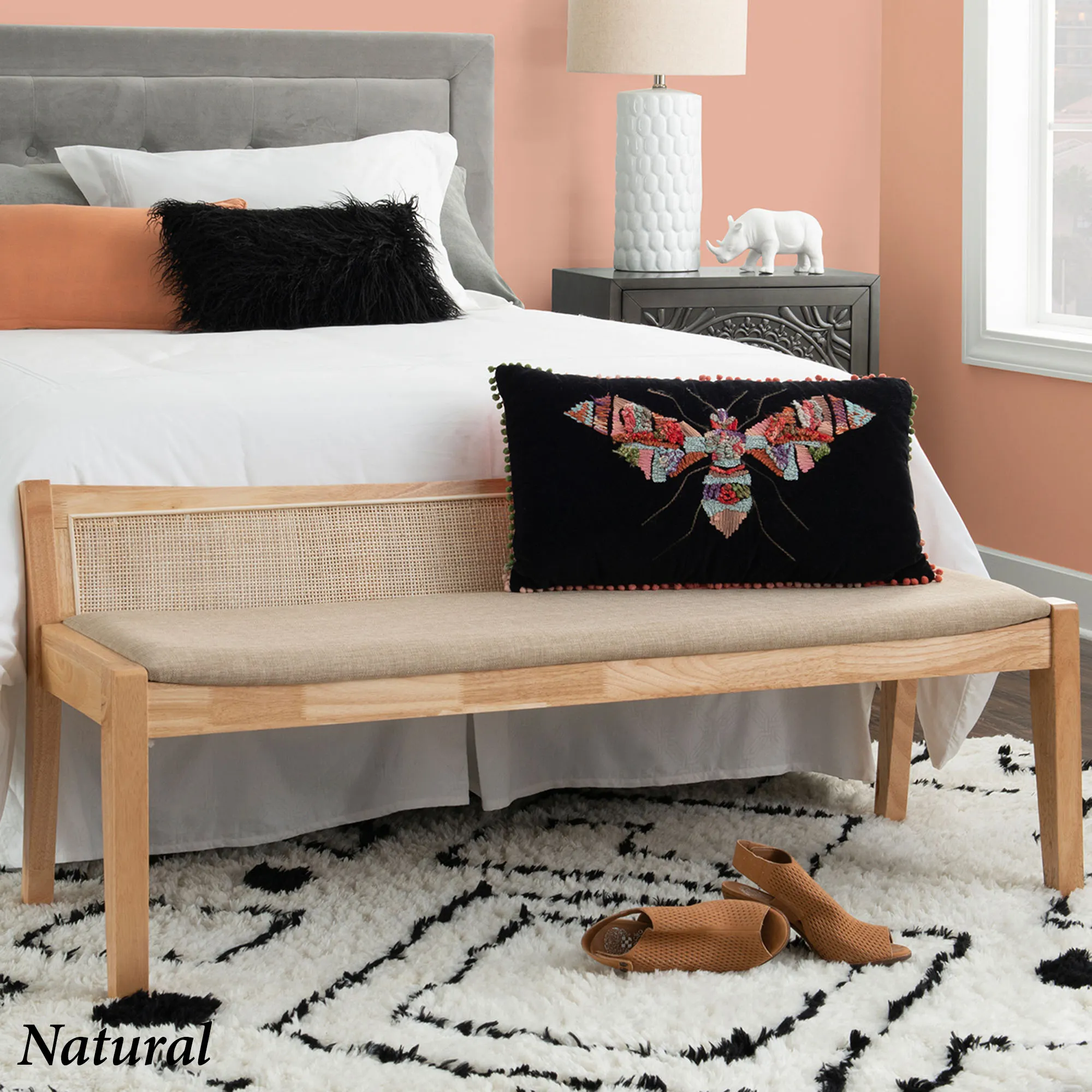 The Talia Cane Bench is wooden with a solid wood frame, a rattan cane backing, a polyester linen seat, and a foam cushion.
