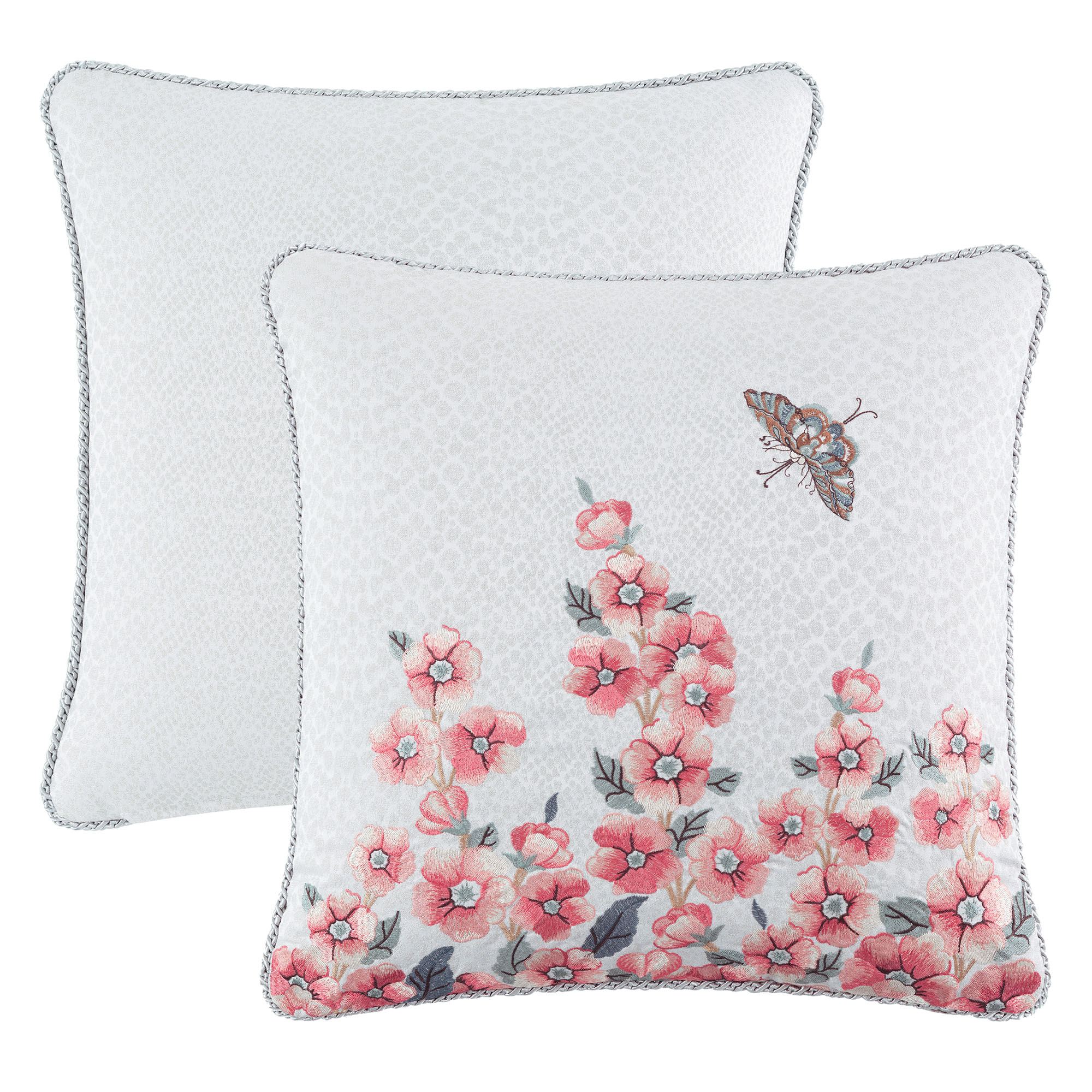 Pillows: Spot clean. The corded 20" Square is polyester with a jacquard-woven animal design, embroidered florals and butterfly, and a zipper closure; reverses to a woven animal design. The 18" Square has Jacobean motifs on a subtle animal print pattern, twist cording, and a zipper closure. The polyester Neckroll is pieced with a jacquard-woven animal design, pleated ivory sides, gimp trim, and twist cording.