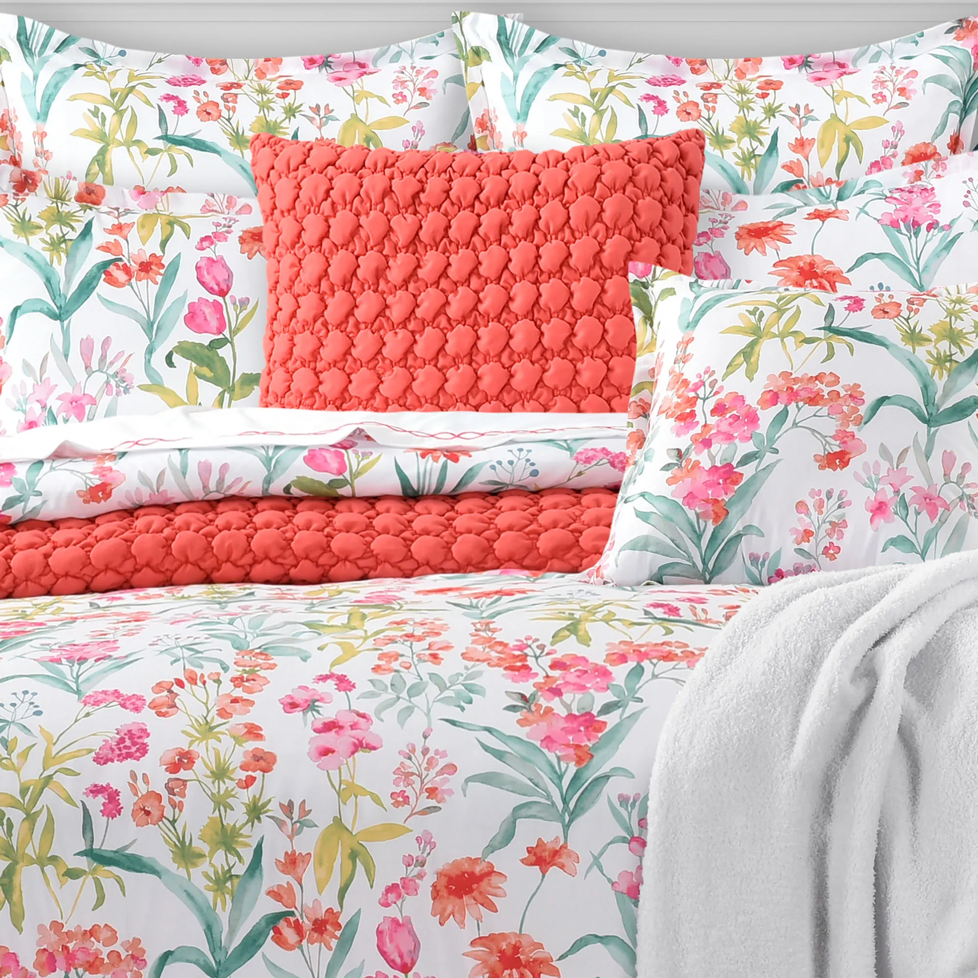 Vibrancy blossoms from the lovely wildflowers on the Tallulah Bedding. From J. Queen Bold, the white polyester microfiber ensemble is printed with beautifully blooming flowers in watercolor shades of pink, orange, coral, and green on each reversible design.