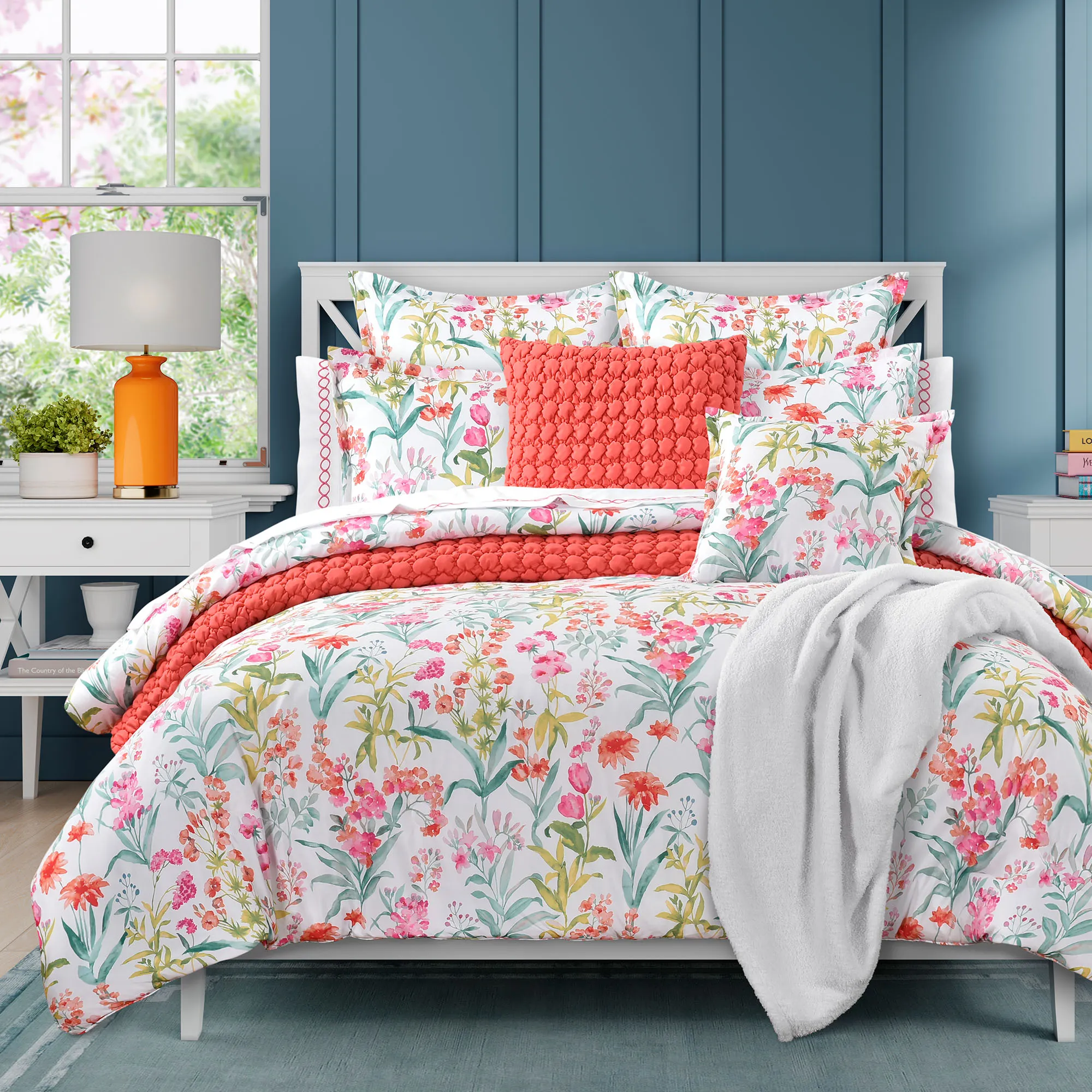 Brighten your bedroom with the vibrant wildflowers on the Tallulah Floral Comforter Bedding from J. Queen Bold. The Comforter Set includes a comforter and sham(s). The white polyester microfiber bedding is printed with flowers in watercolor shades of pink, orange, coral, and green on each reversible design. The lightweight comforter is oversized. Bedding fill is polyester. Machine washable. Imported.