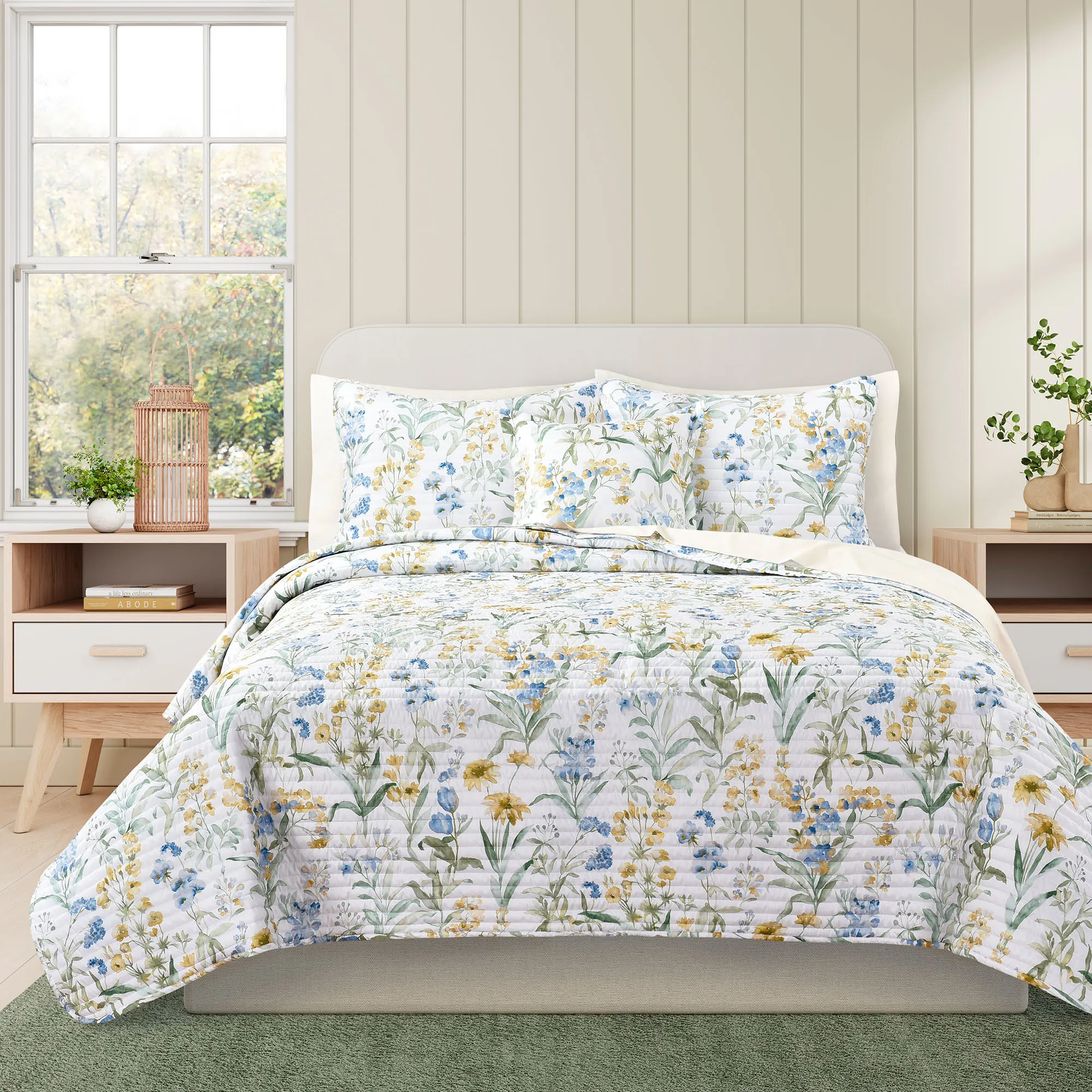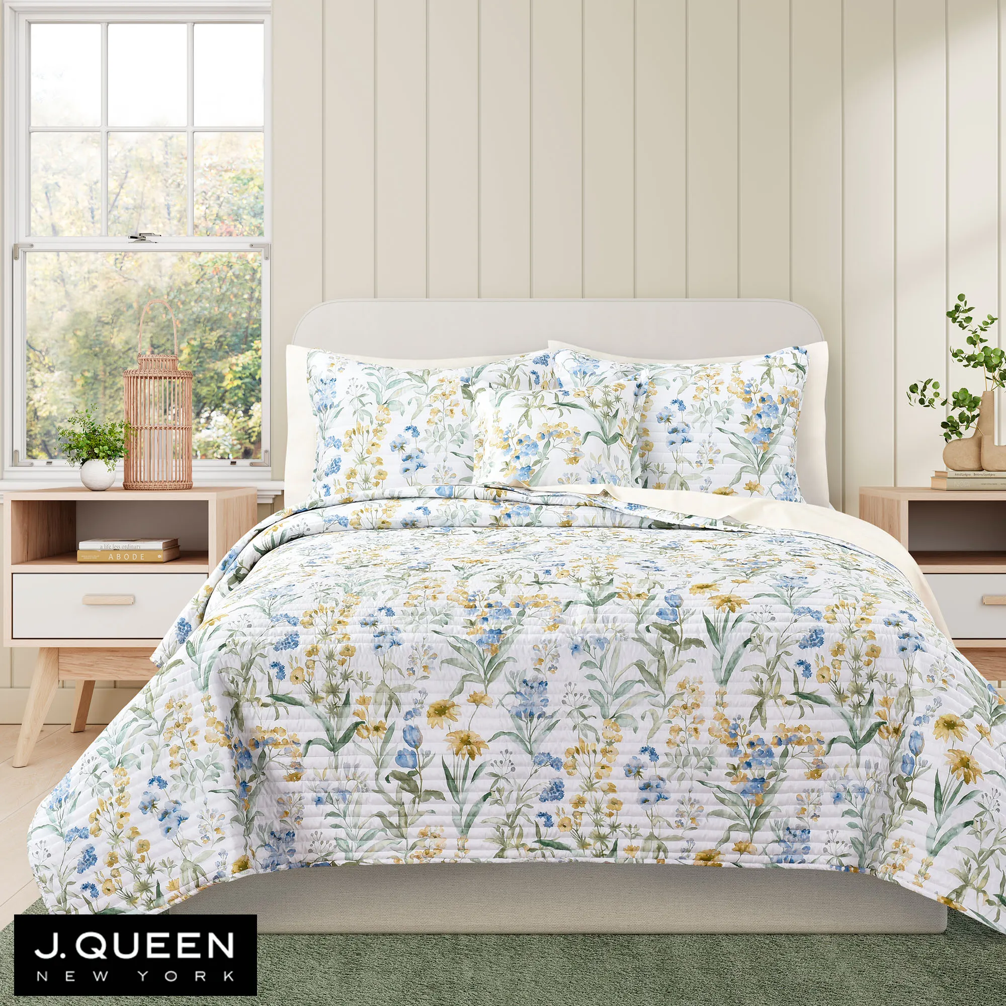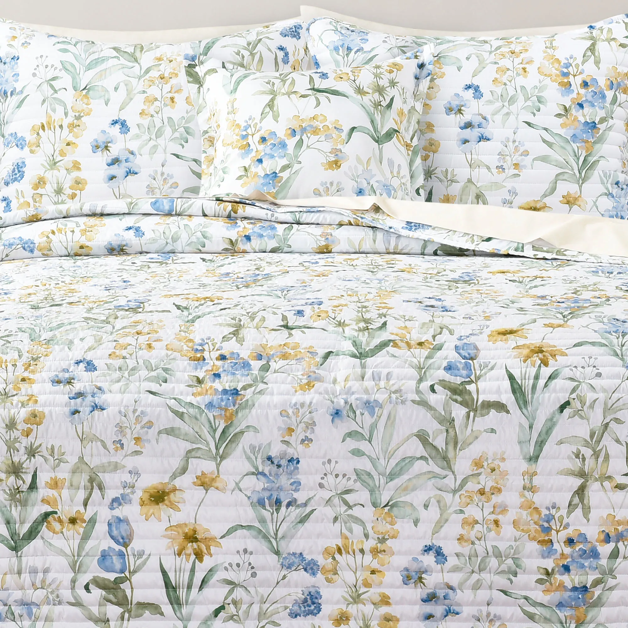 Delight in the blossoming wildflowers on the Tallulah II Floral Bedding from J. Queen Bold. The Quilt Set includes a quilt and sham(s). This polyester microfiber bedding is printed with blooming flowers in watercolor shades of blue, golden yellow, and green on white. The reversible, lightweight quilt has channel quilting. Bedding fill is polyester. Machine washable. Imported.