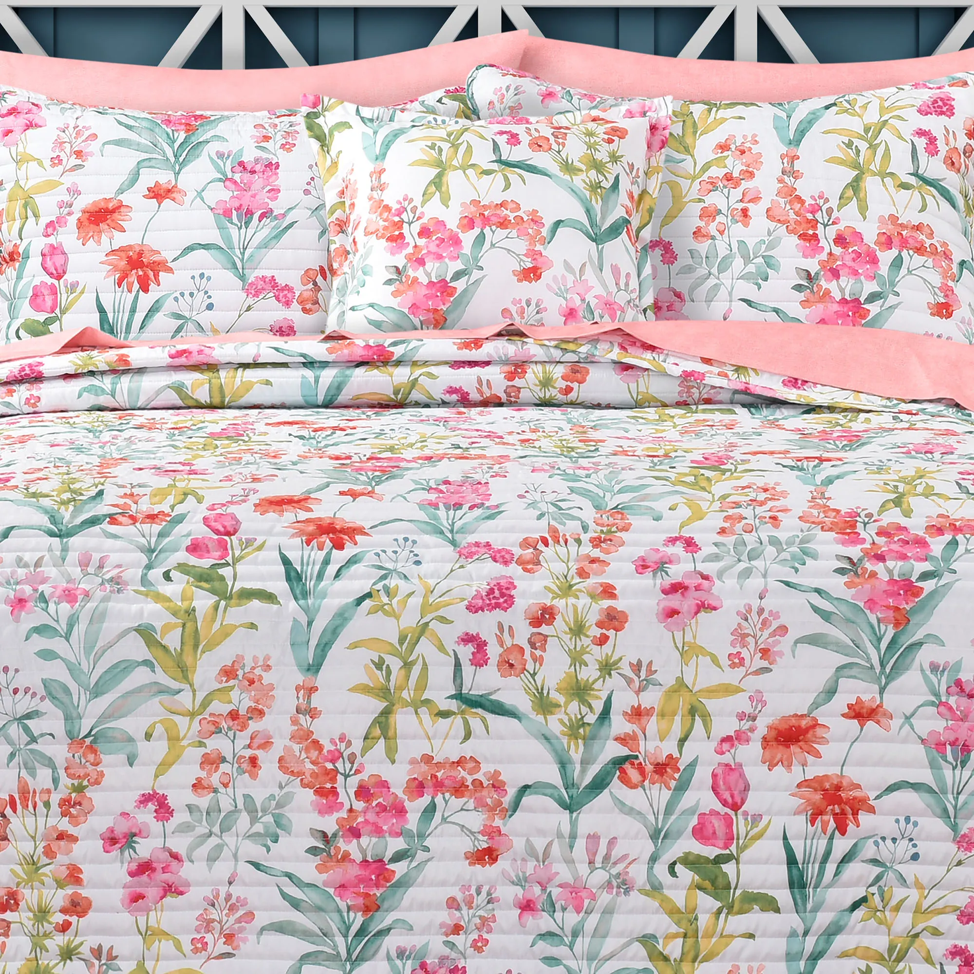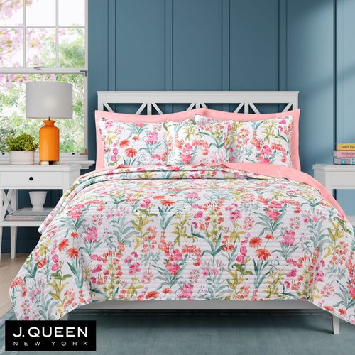 Brighten your bedroom with the vibrant wildflowers on the Tallulah Floral Bedding from J. Queen Bold. The Quilt Set includes a quilt and sham(s). The white polyester microfiber bedding is printed with flowers in watercolor shades of pink, orange, coral, and green. The reversible, lightweight quilt has channel quilting. Bedding fill is polyester. Machine washable. Imported.