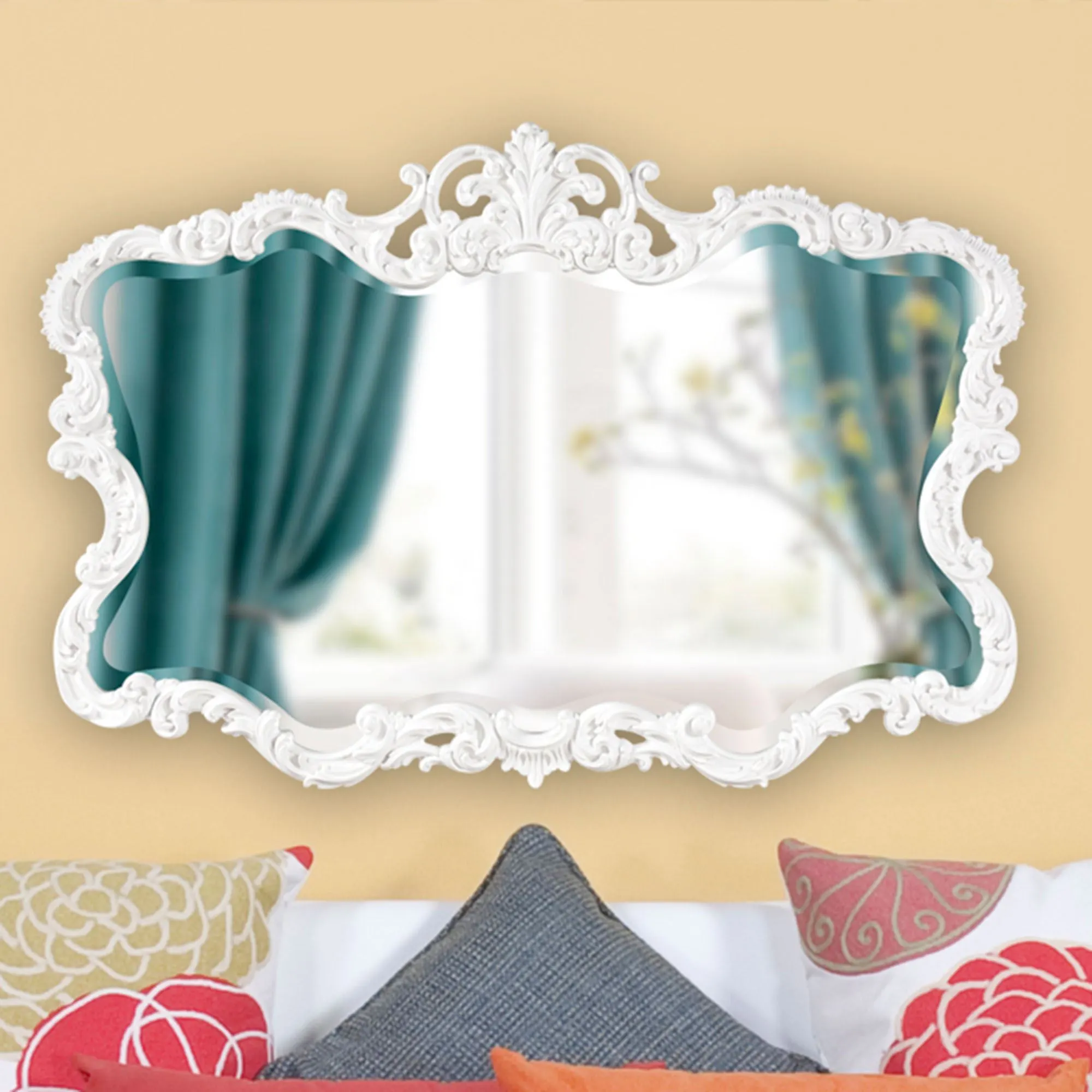 The Tamsyn Wall Mirror commands a majestic presence in your home that is impossible to ignore. The resin frame presents a traditional acanthus scrollwork design in grand fashion surrounding a central beveled glass mirror. A fleur medallion rests at the apex. Frame is finished in glossy white. Measures 38"Wx1"Dx27"H; weighs approx. 16 lbs.