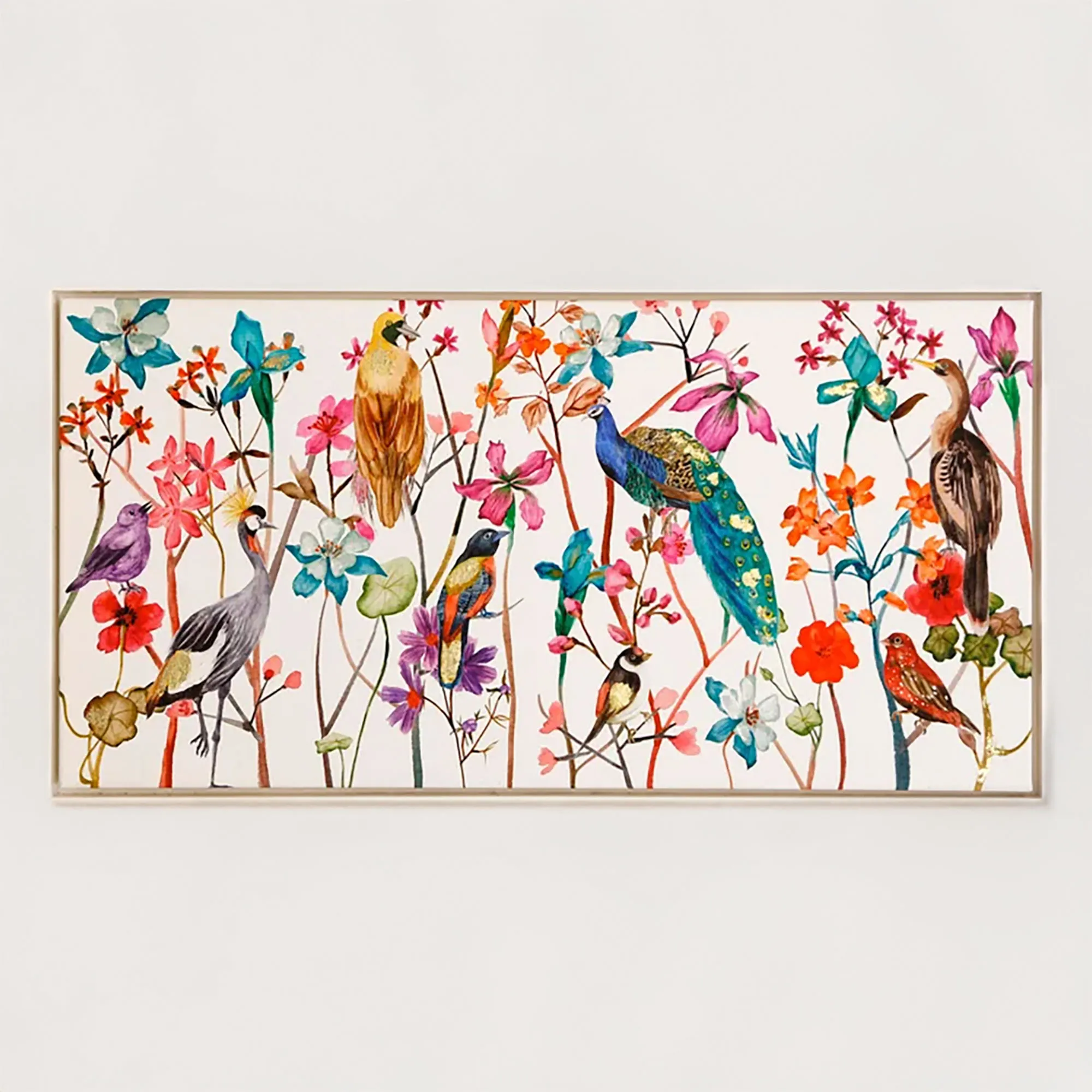 The Tangled Garden is a mix of exotic birds and a variety of flowers. This framed art canvas is inset in an ivory polystyrene frame and features a peacock, crested crane, and wren on branches and colorful flowers. Colors include bright shades of pink, red, blue, brown, purple, orange, green, and black on an ivory background. Measures 40"Wx20"H.