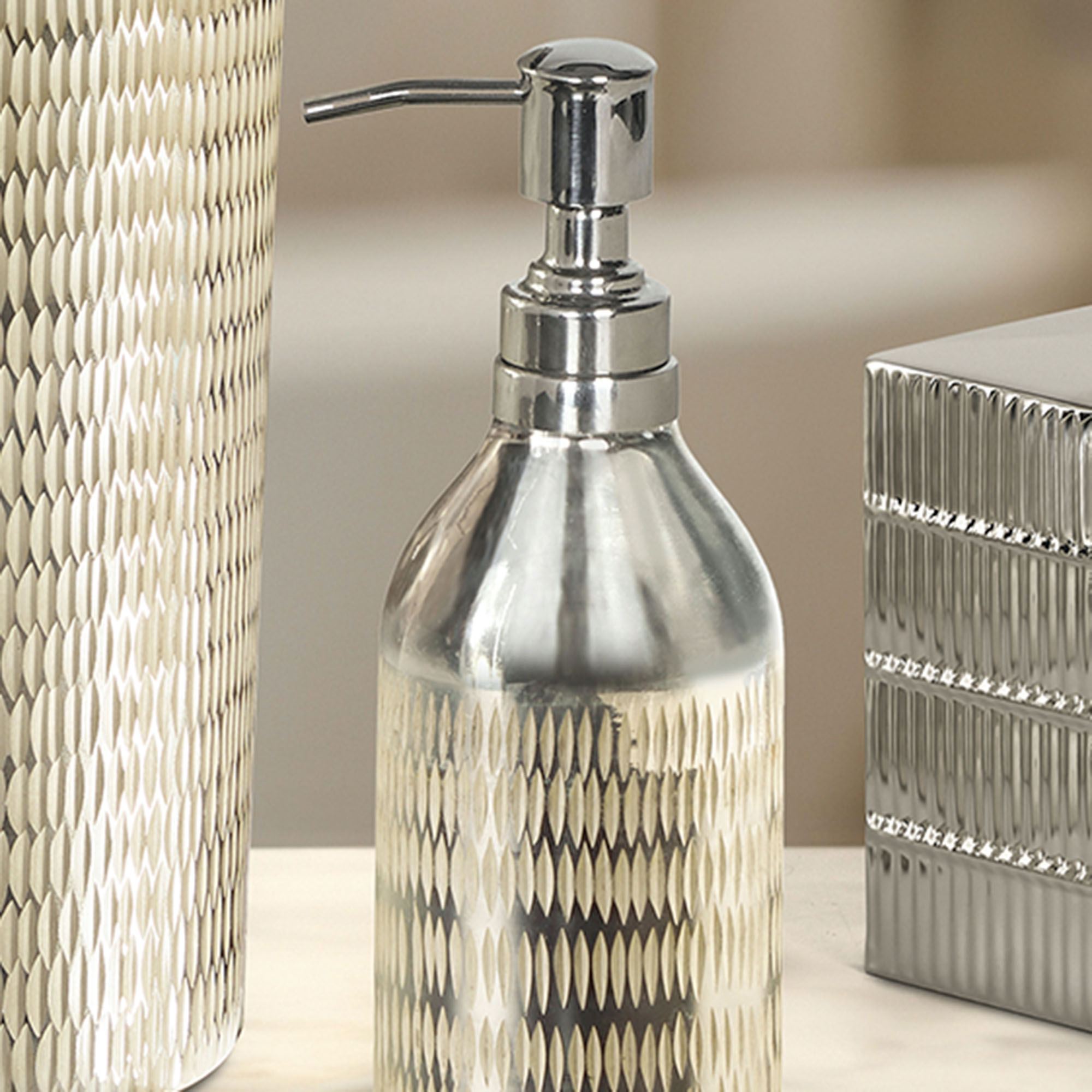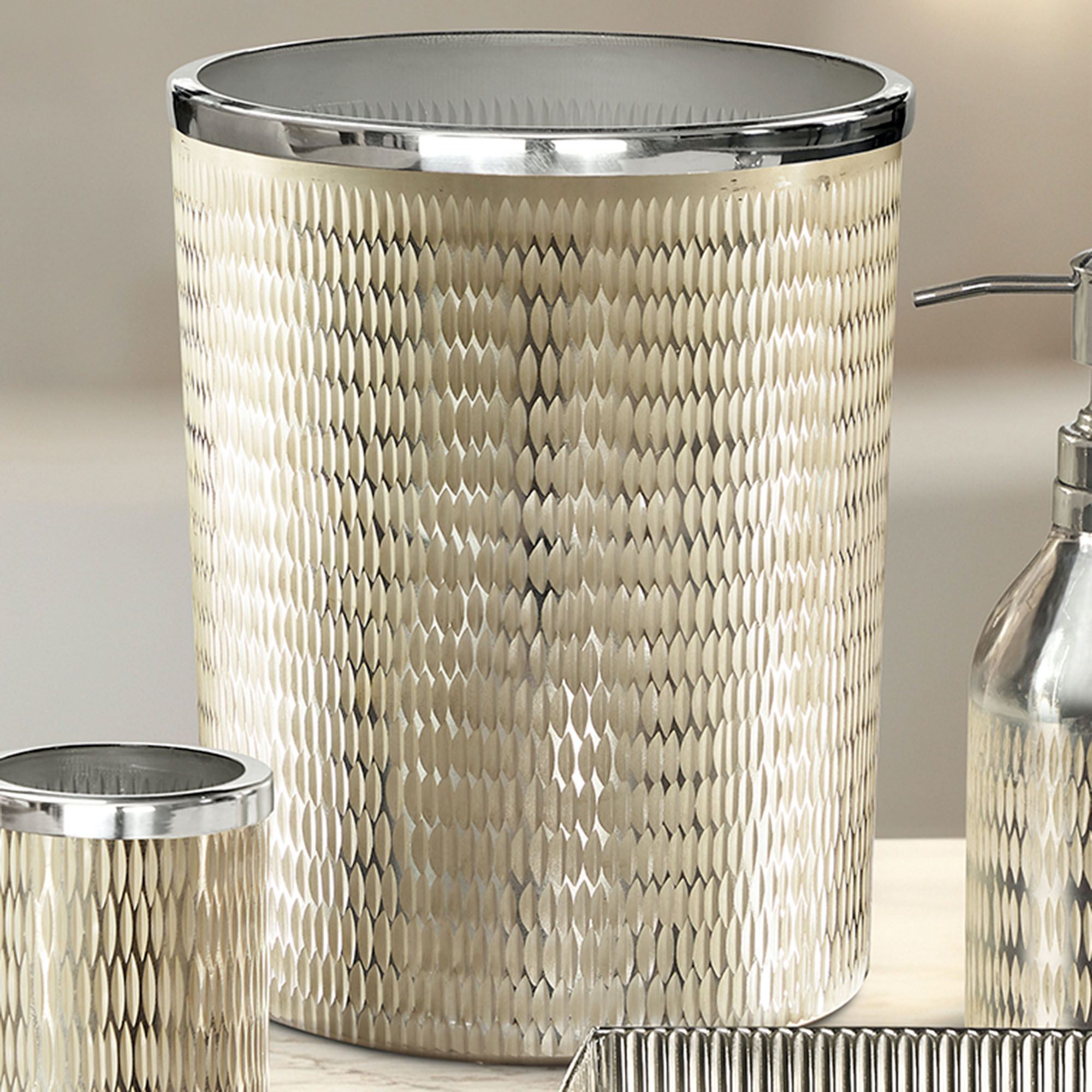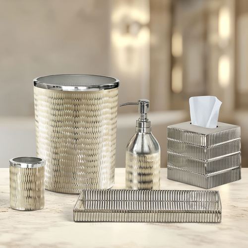 The Tanna Bath Accessories glimmer and shimmer with elegance. These contemporary metal accessories, by J. Queen New York, have hammered etched designs that are textured and reflect light. Most have stunning polished champagne gold designs on a silver background; the Tissue Cover and Tray have silver designs on a silver background. Specify Wastebasket, Tissue Cover, Tray, Tumbler, or Lotion/Soap Dispenser.