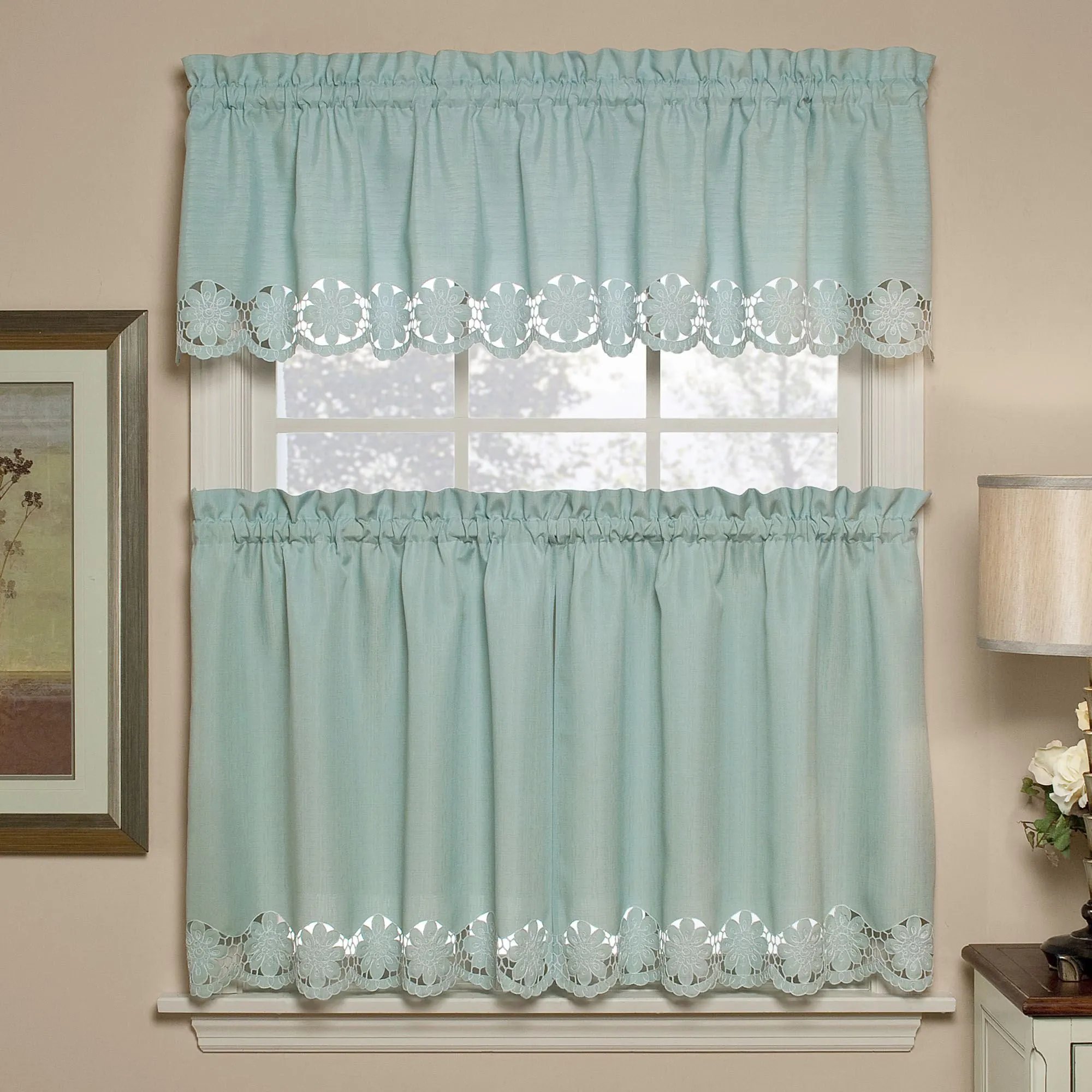 The elegant Taylor Tier Window Treatment displays a clean, sophisticated look suitable in any room. Polyester window treatment has reverse embroidery and cutwork floral motif on textured fabric. Specify Tier Pair or Embroidered Valance. 1.5" rod pockets. Machine wash tiers and valance. Imported.