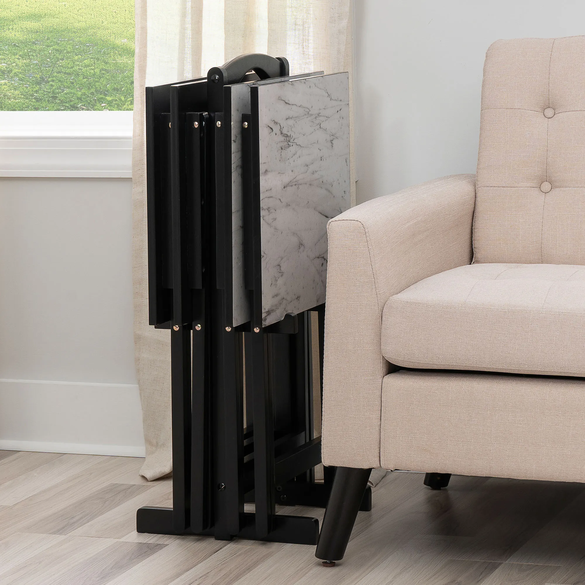 Arrange to have dinner in the living room with the Tayna Tray Table Set. This wooden folding tray table set has a stunning black finish, is perfect in any setting, and doesn't take up that much room. Each tray table has a white faux marble top and can support up to 20 lbs. The stand has a shaped handle for easy portability. Set in stand measures 19"Wx13"Dx31"H. Each fully assembled tray is 19"Wx16"Dx26"H. Set weighs approx. 31 lbs.