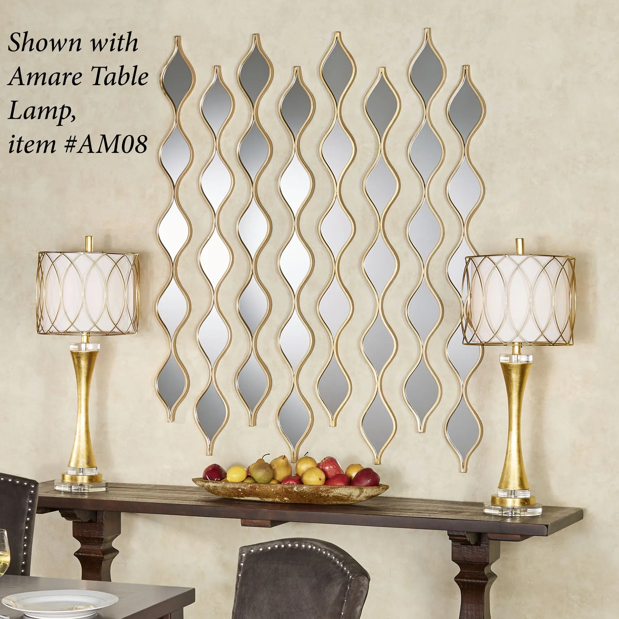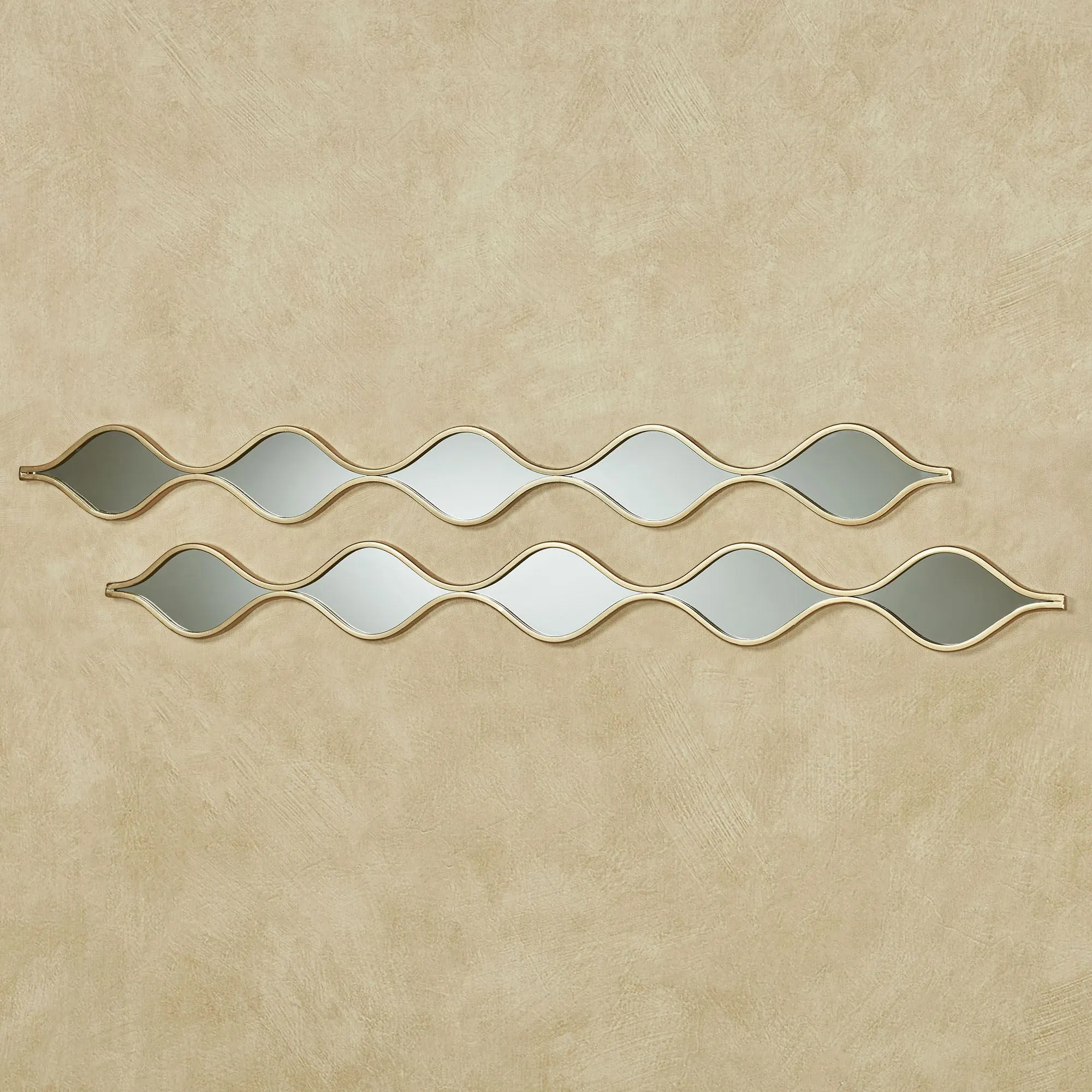 The Gold Teardrop Wall Mirror Panel Pair gleams with elegance. A gold-finished metal frame outlines the five teardrop glass mirrors on each. Panels may hang vertically or horizontally. Each measures 5"Wx1"Dx51"H.