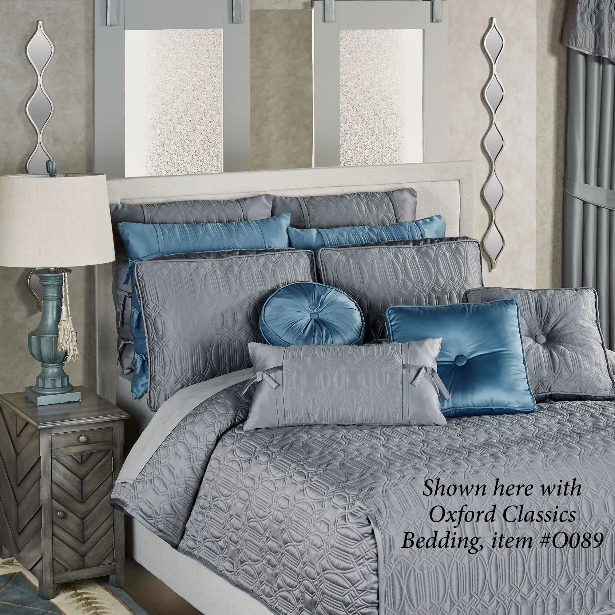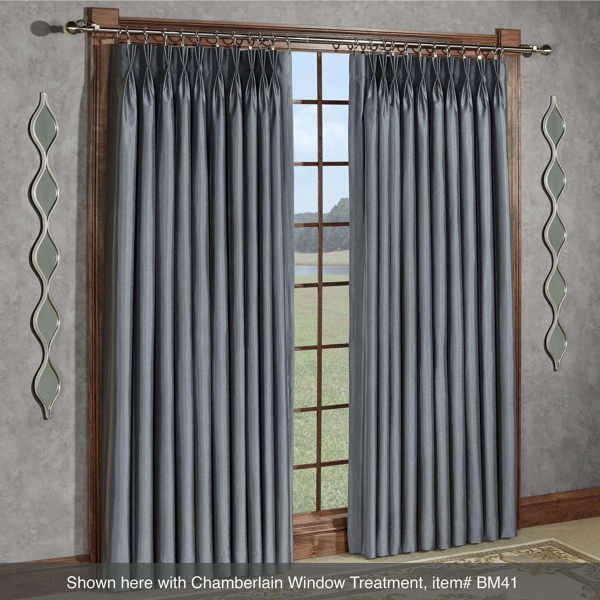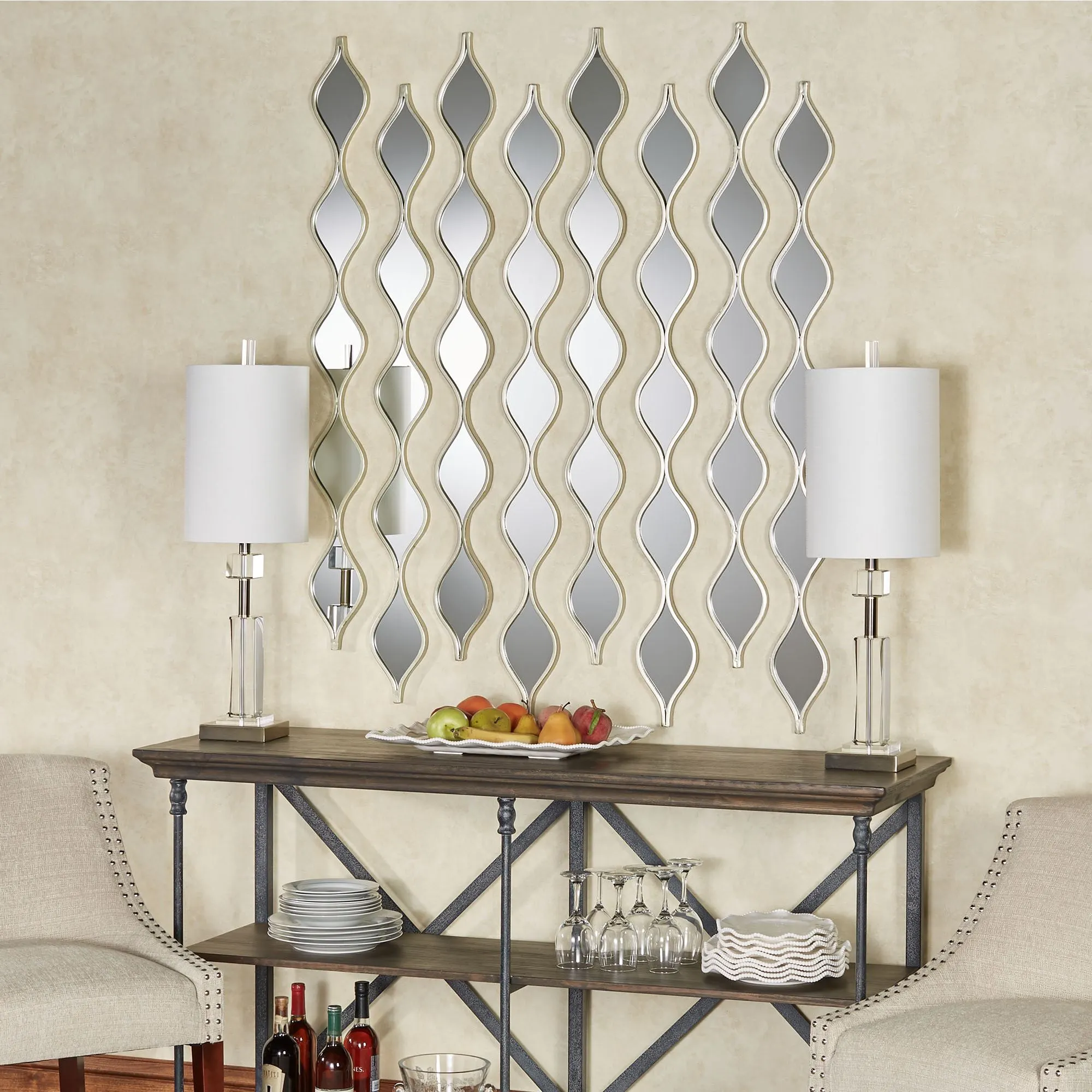 The Platinum Teardrop Wall Mirror Panel Pair gleams with elegance. A platinum-finished metal frame outlines the five teardrop glass mirrors on each. Panels may hang vertically or horizontally. Each measures 5"Wx1"Dx51"H.