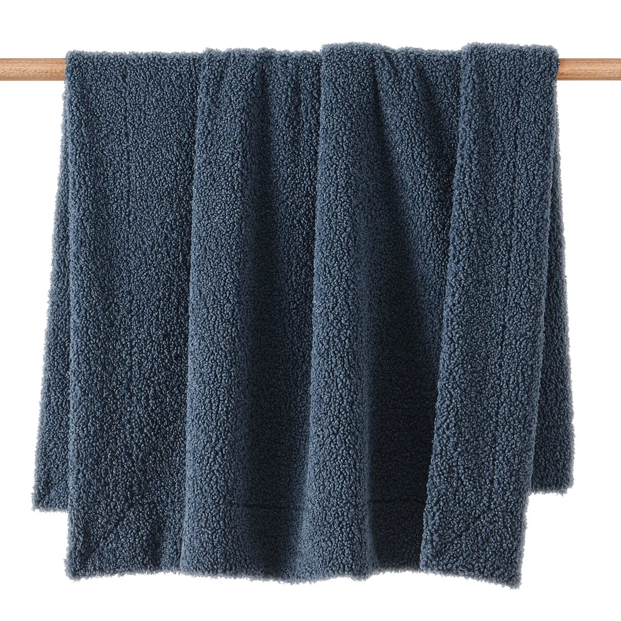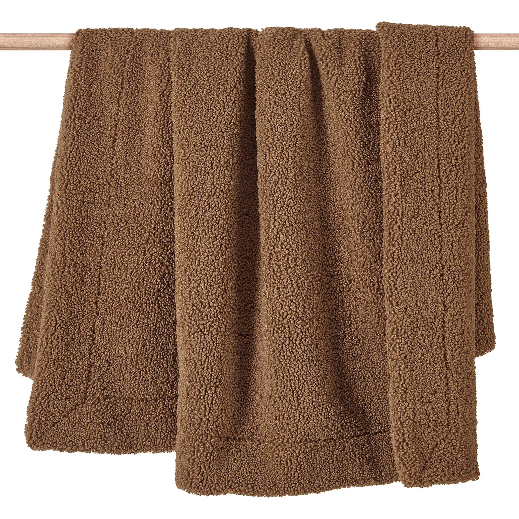 Cuddle up with the sumptuously soft Teddy Throw. This durable, polyester blanket is crafted from a woven boucle pile and showcases curled loops and a plush texture. The classic throw is perfect for draping over a chair or sofa and measures 50"x60". The oversized blanket is ideal for layering on a bed or seating and measures 60"x90". Hand wash. Imported.