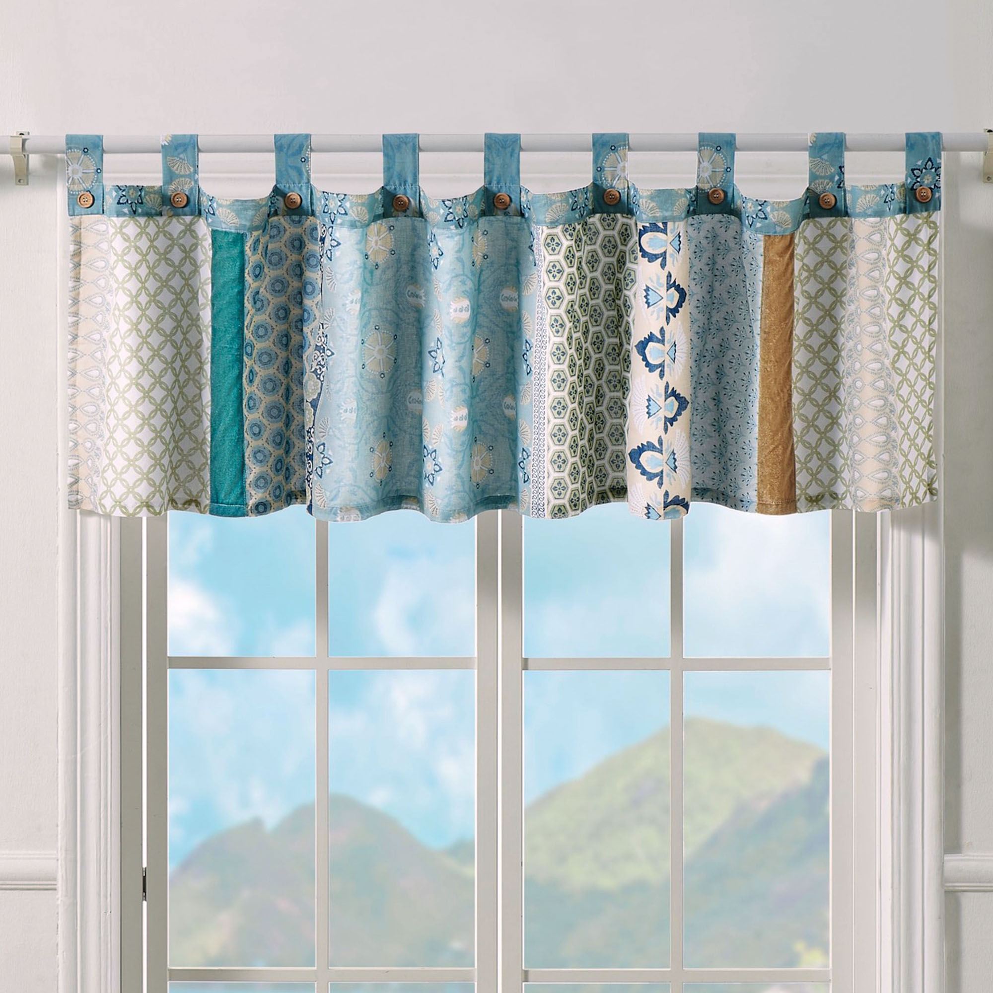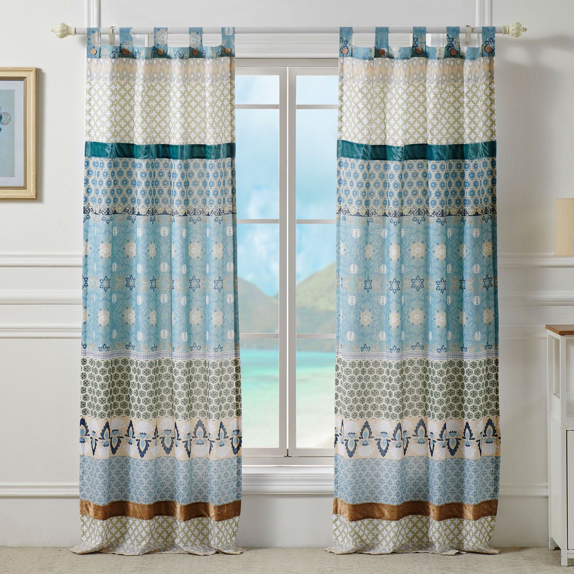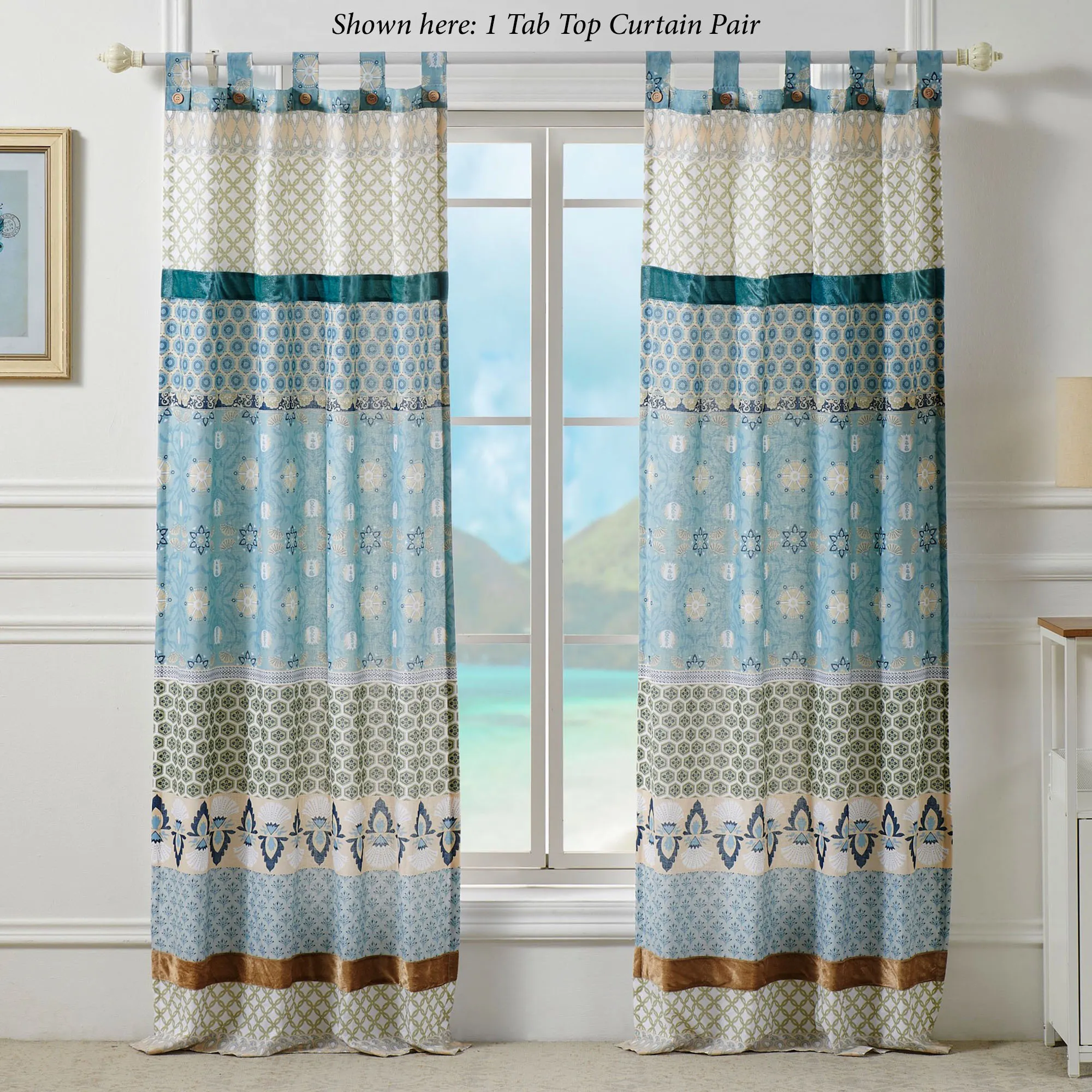 Bask in the Boho charm of the Thalia II Bedding. Crafted from pre-washed and preshrunk cotton, the dazzling ensemble features printed stripes of captivating latticework, floral medallion, and stylized patterns in shades of blue, white, cream, beige, and sage. Pieced bands of teal and light brown polyester velvet add textural intrigue. Coordinating motifs create a charming frame on the quilt. Medallion quilting and bound edges finish all, except the window treatment.