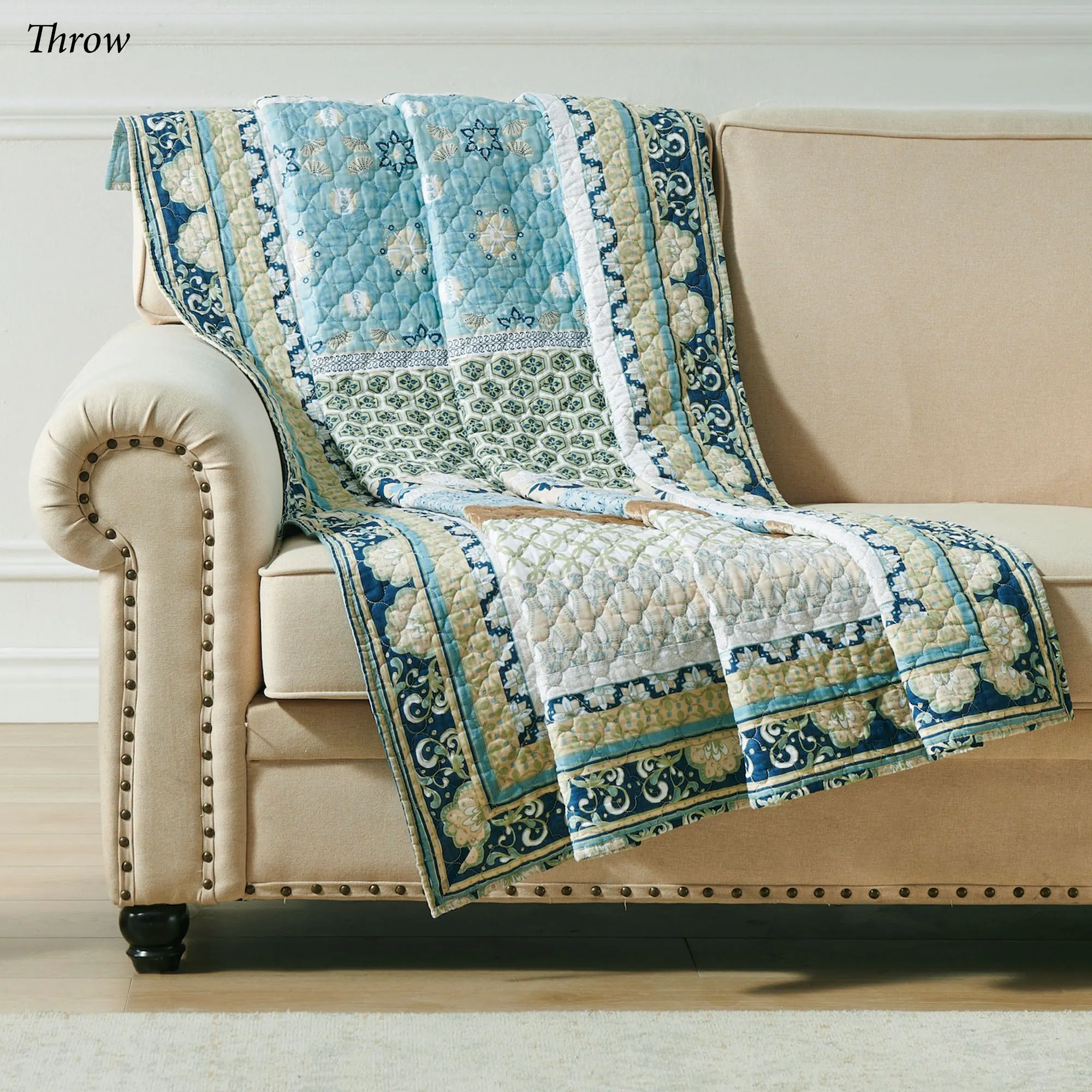 Delight in the Boho charm of the Thalia II Bedding. The Mini Quilt Set includes a quilt and sham(s). Crafted from pre-washed and preshrunk cotton, the Boho quilt features printed stripes of latticework, floral medallion, and stylized patterns in shades of blue, white, cream, beige, and sage. Pieced bands of teal and light brown polyester velvet add textural intrigue. Medallion quilting finishes the quilt and sham(s). Quilt reverses to a blue, beige, and white floral print. Fill is cotton. Machine washable. Imported.