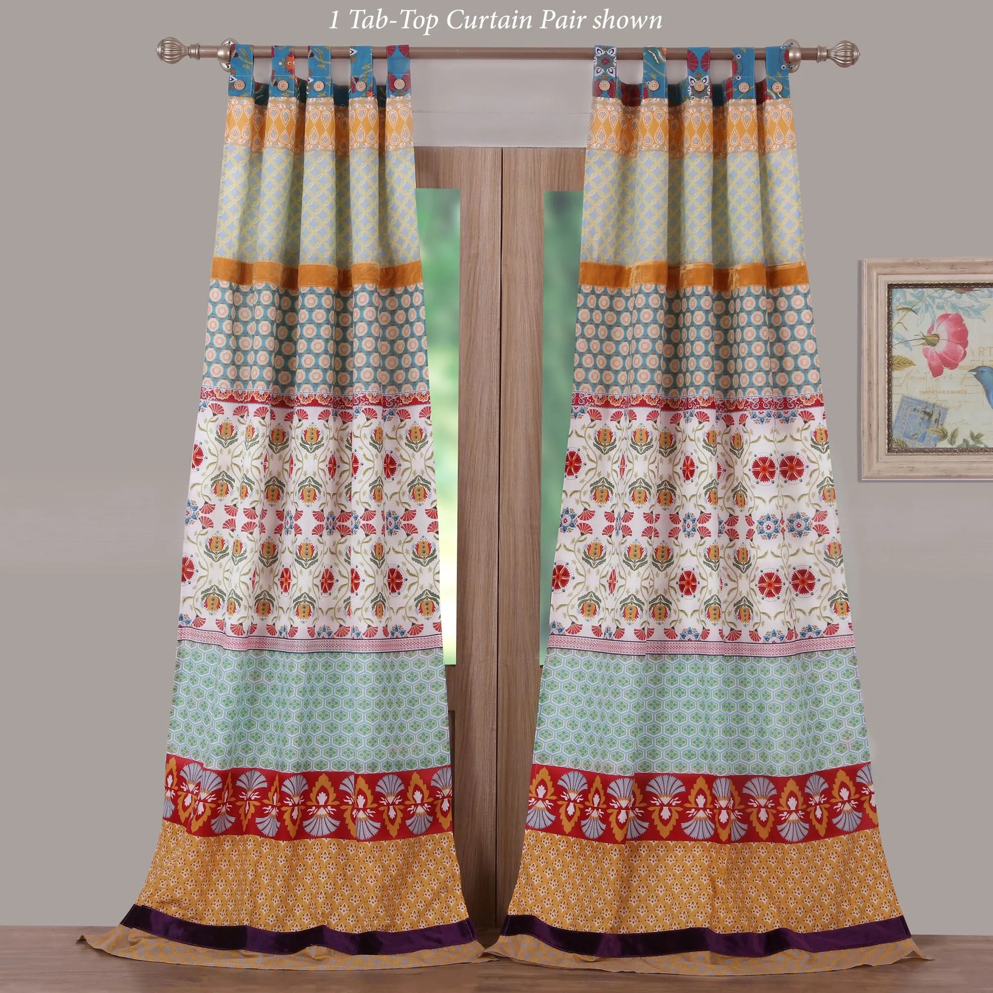 Lined Window Treatment has bands of various patterns pieced with polyester velvet bands. Each tailored window design hangs by 3" tabs with accent buttons. Curtain Pair has horizontal bands and includes tiebacks. Valance has vertical bands.