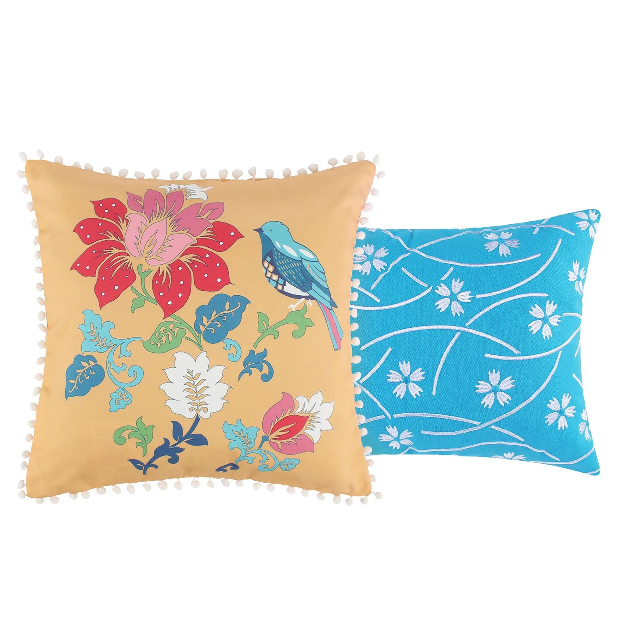 Quilt reverses to bold florals; fill is cotton. Quilted sham(s) has a tie closure. Decorative pillows are polyester with polyester fill. Reversible tailored rectangle pillow is rich blue embroidered with white florals and arcs. Square pillow has lovely printed florals and a bird on gold with pom-pom edges.