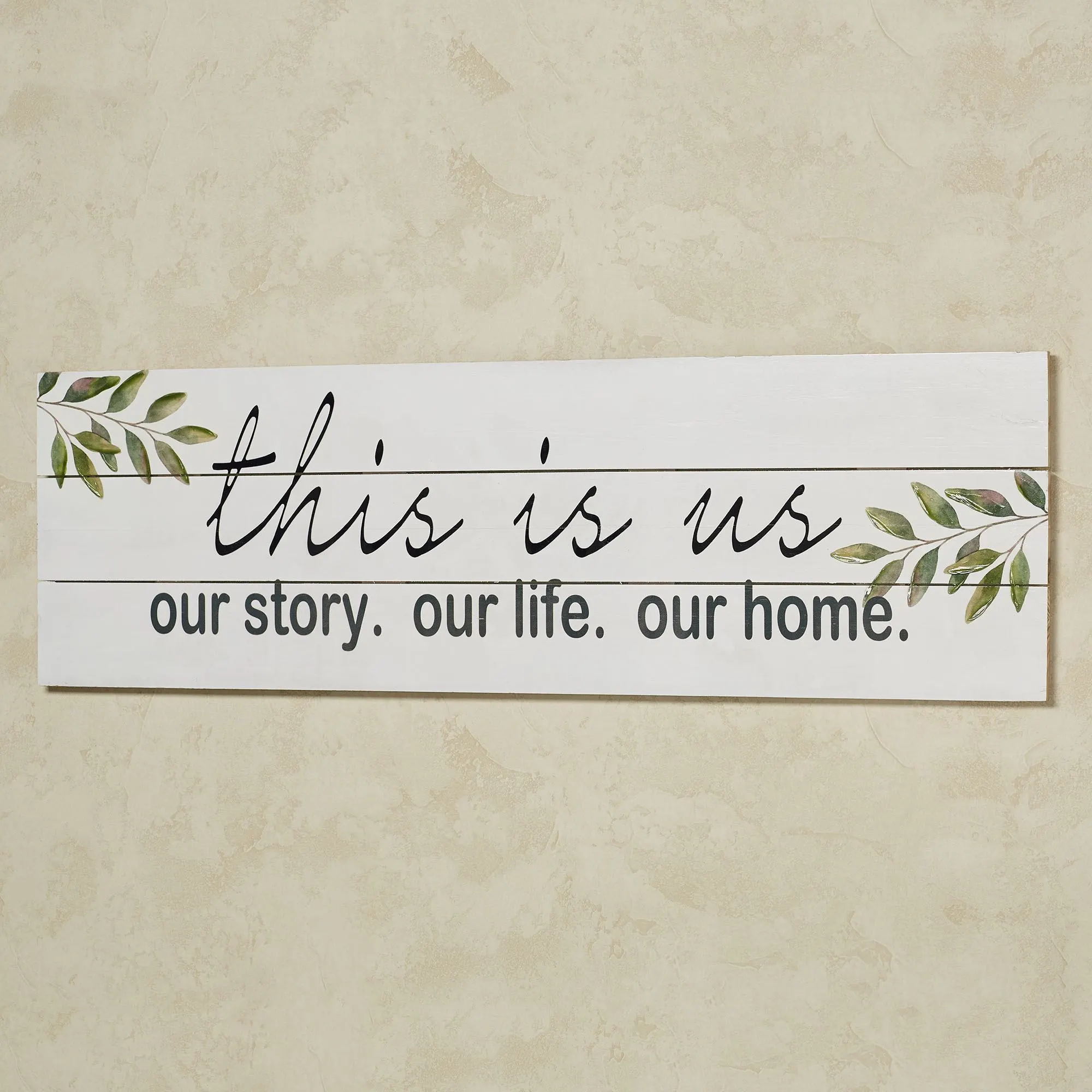 The This Is Us Wall Plaque tells it like it is. Made of wood, this white, slat-style wall plaque has a printed saying in black that reads "this is us - our story. our life. our home." Wall plaque also has green leaves with acrylic gel embellishments. Measures 40"Wx1"Dx12"H.