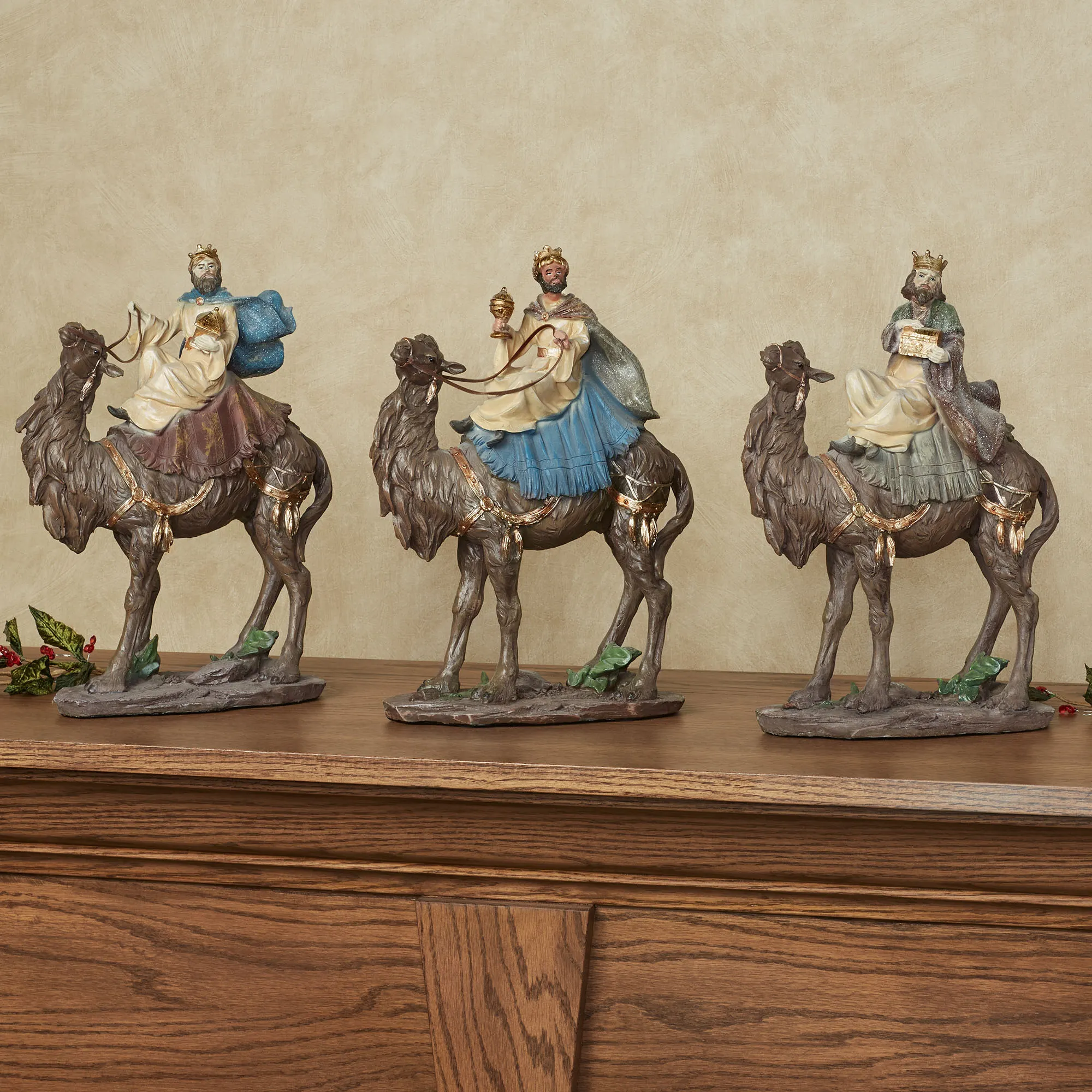 The resin Wise Men Table Sculpture Set features each of the three Magi riding a camel as they come bearing their special gifts to worship the newborn King. These handpainted figures, dressed regally in rich shades of blue, burgundy, and taupe, will make a wonderful holiday accessory for your mantel or tabletop display. All pieces are accented with gold glitter. Each measures approx. 9.5"Wx5"Dx13"H.